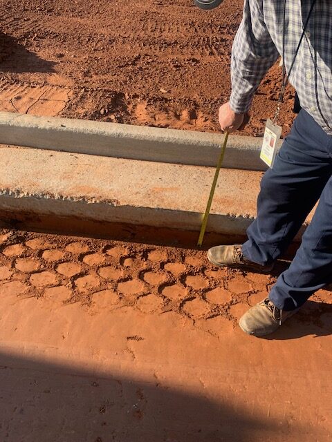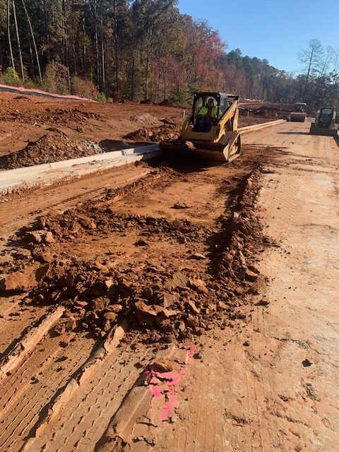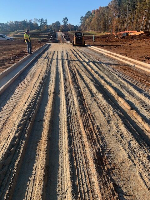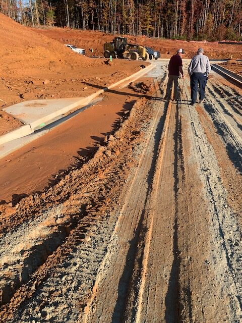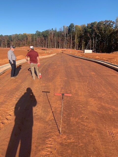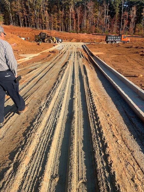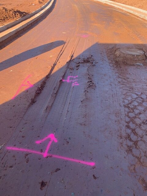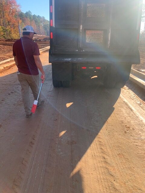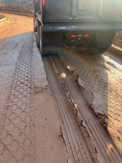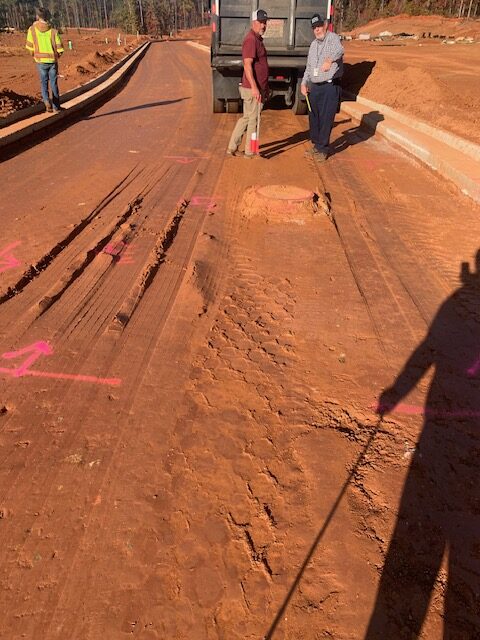On the above date our representative with AS engineering and consultant was on site to observe proof-rolling of subgrade soils for the rear roadway using a tandem-axled dump truck loaded with 18 tons of stone. The proof-roll was also observed with members from Paulding Co. and Baldwin Paving. Most areas observed appeared stable under traffic except isolated areas listed below. The writer also observed – per plans and specifications – the depth for required base stone and asphalt which requires 9″. The depths observed varied from 7.5″ to 9.25″; some high areas were marked for additional clip to obtain sufficient depth. Also, isolated areas with movement were marked and recommended to remove 4″ to 6″ to remove saturated wet soils and replace with additional base stone. Note: areas of roadway subgrade soils that were previously observed and base stone placed displayed severe wash silt damage due to recent rains. Some areas showed silt wash and/or rutting under traffic. These areas will require additional reobservation. See attached pictures below.