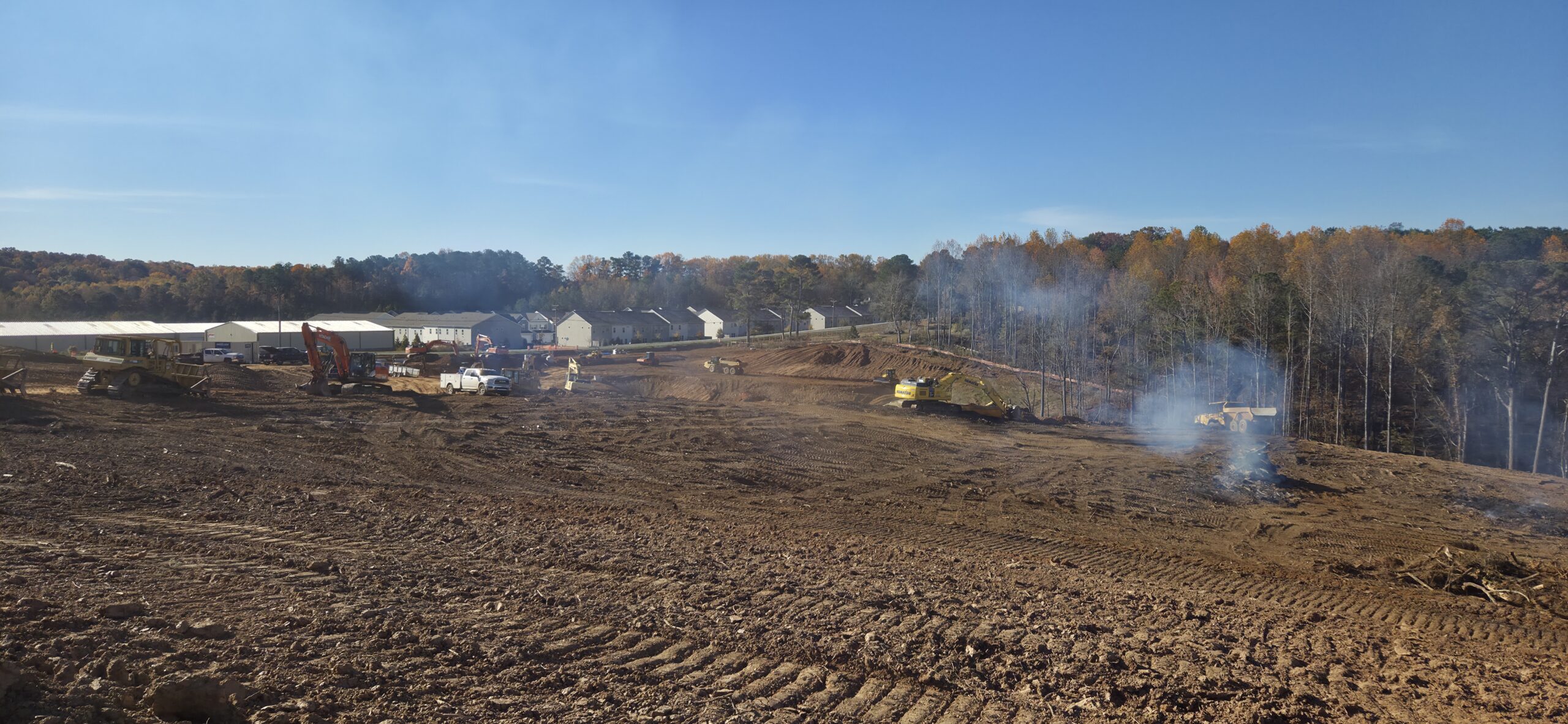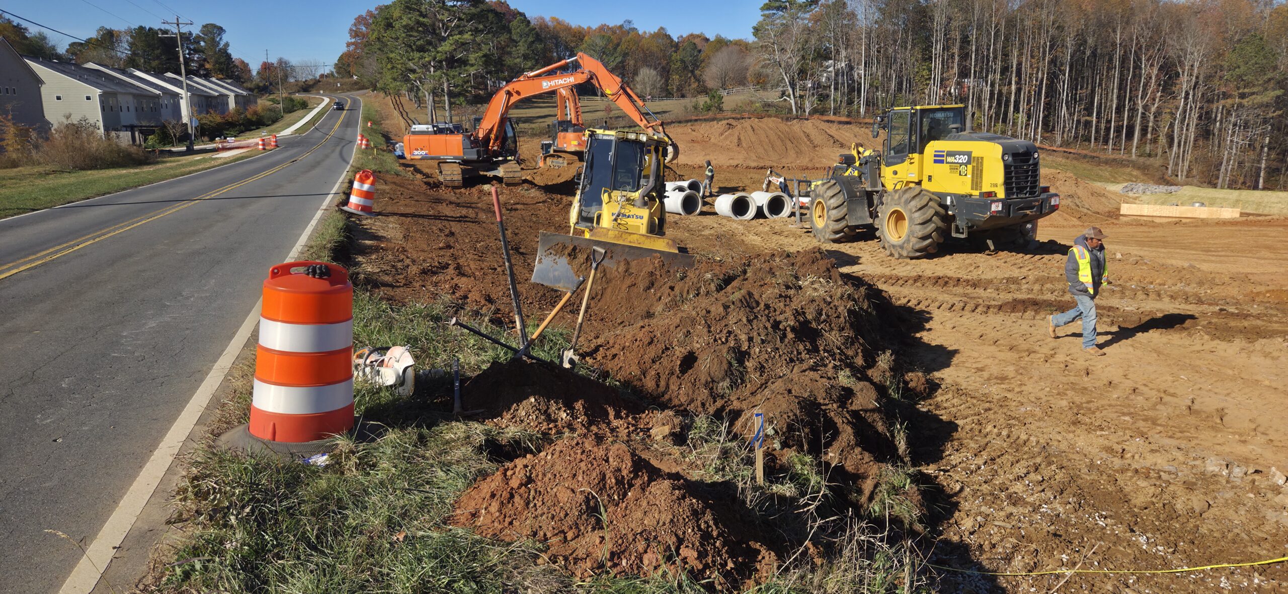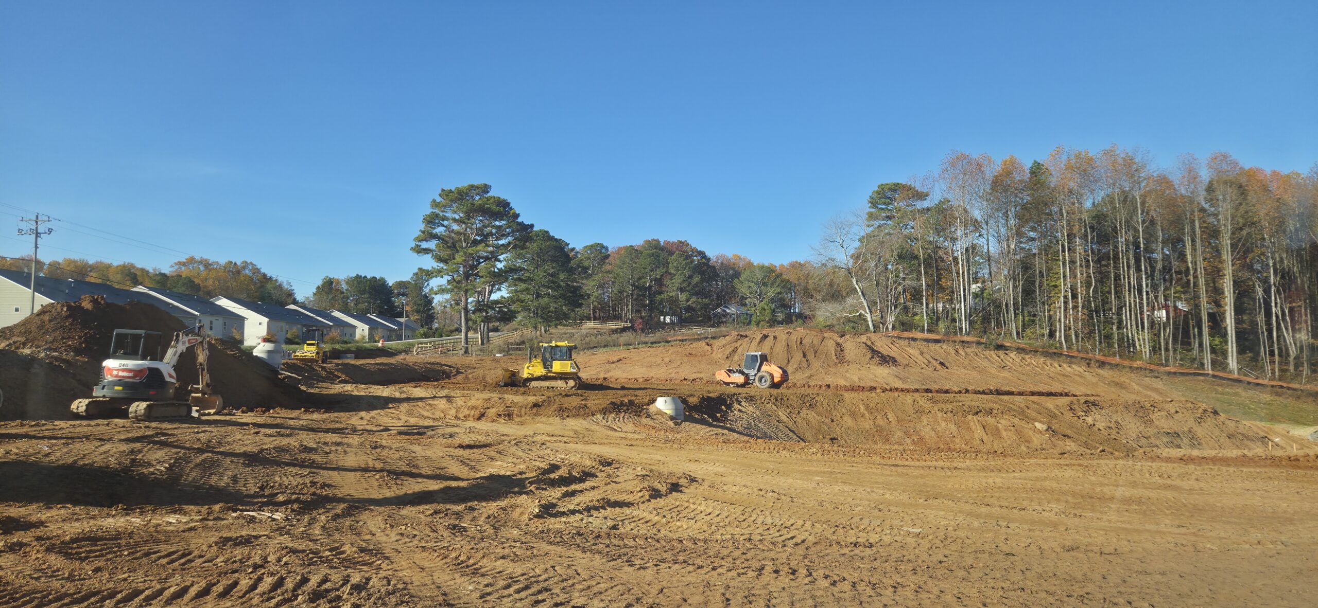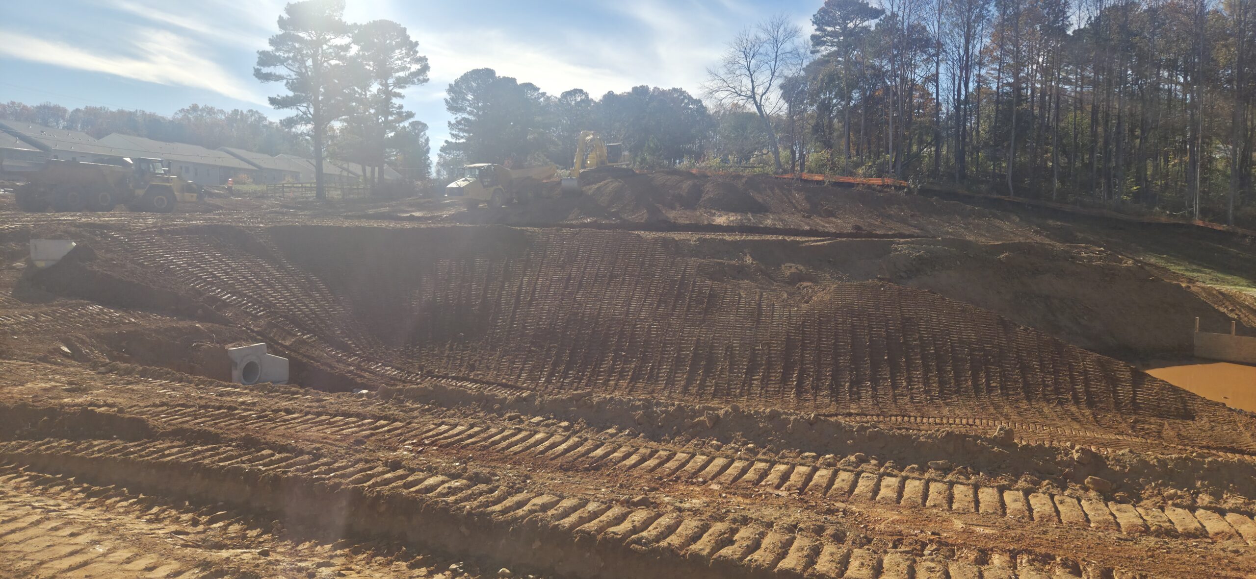 Our ASEC representative was on site for the observation/testing of the placement of fill/backfill. The contractor continued to place structural fill long Lots #1 through #4 area. Fill was installed in approximately 8-inch to 12-inch lifts and compacted with a HAMM vibrating sheep’s foot roller. As loaded trucks rolled across the lift, ASEC watched for any signs of pumping/rutting. There were no signs of severe pumping/rutting, and the lifts appear to be stable. Density testing was performed, and all test results were provided to the contractor. Any failed tests were addressed. Topsoil that was stockpiled on the upper slope above Lots #1 through #4 and was moved to the slope of the main pond (in front of site by deceleration lane). The topsoil was rolled in with a dozer.