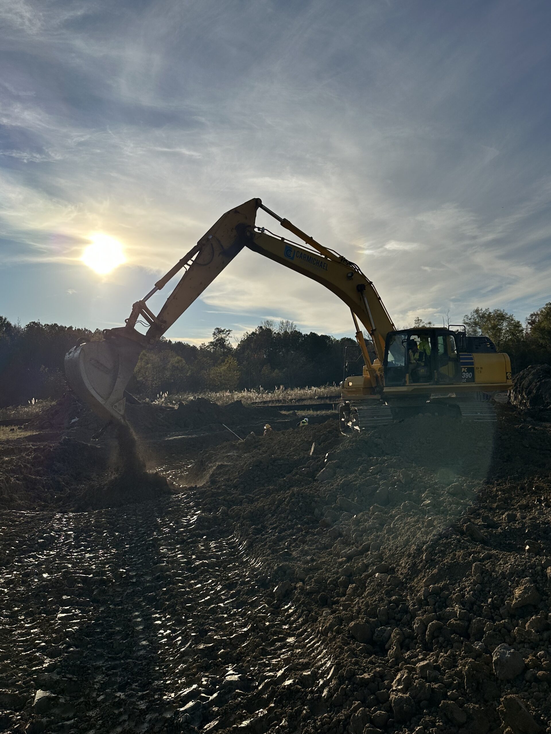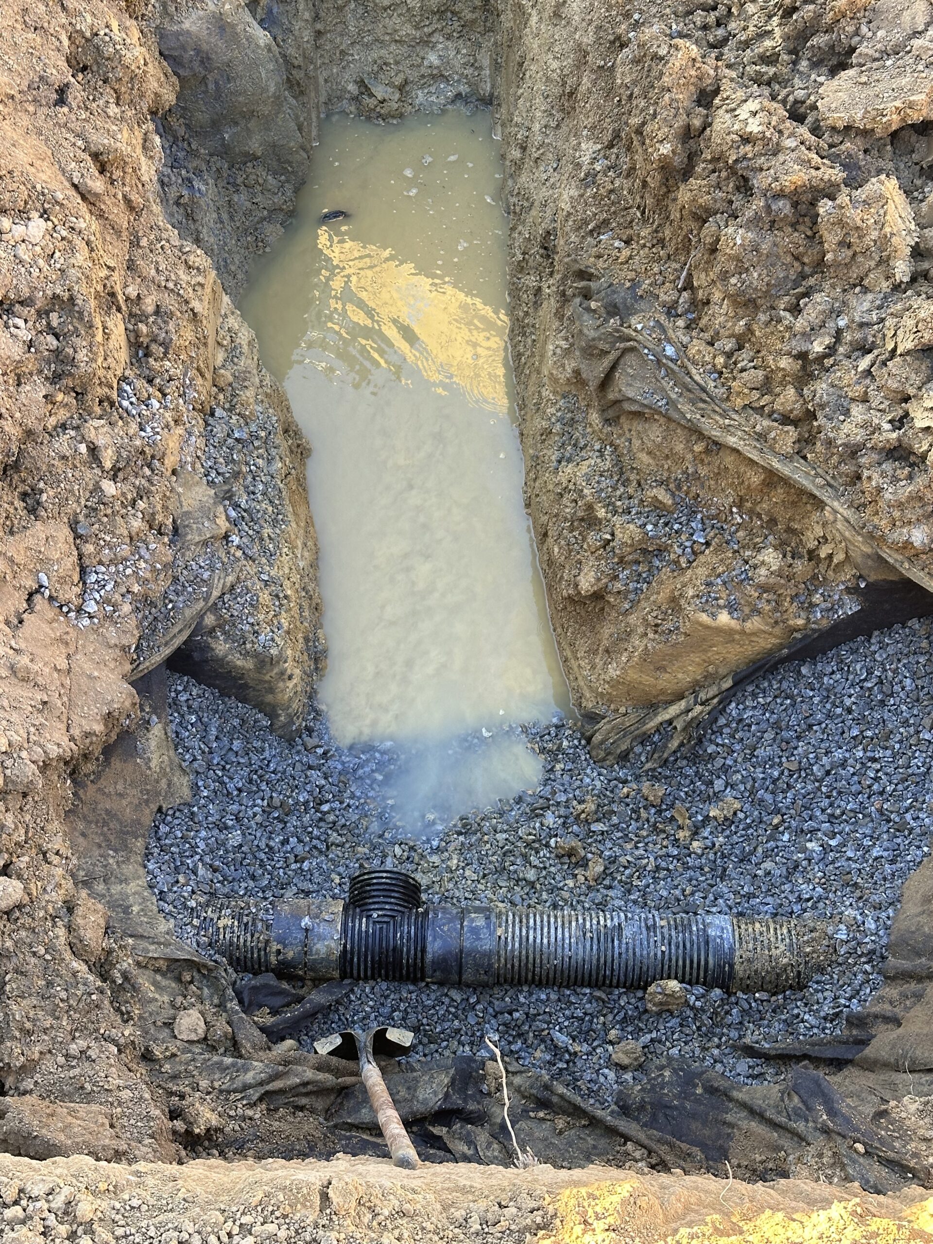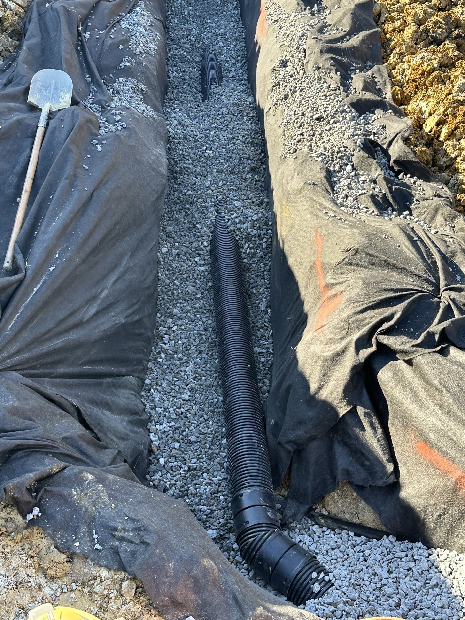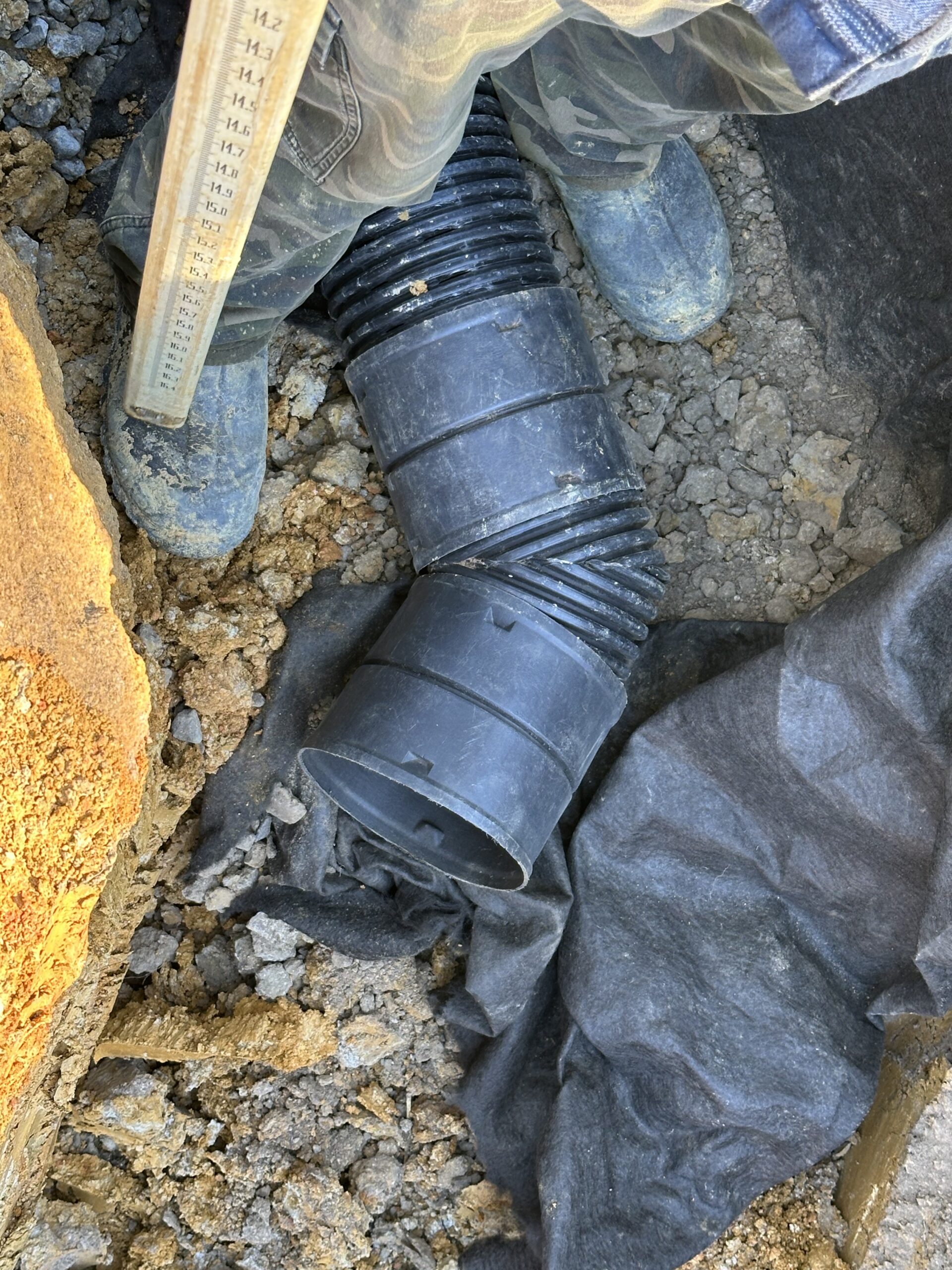 Excavation and installation continued today at the Caseville Road tract for the French drain (“burrito wrap”) project. Work started at point C3 according to the new plan, next to the existing pipeline. The crew excavated the soil, cut the existing pipeline, and installed a T-joint connection. New pipes were installed along the designated line, and the trench was backfilled and compacted. No groundwater or slope instability was observed at the time of excavation.