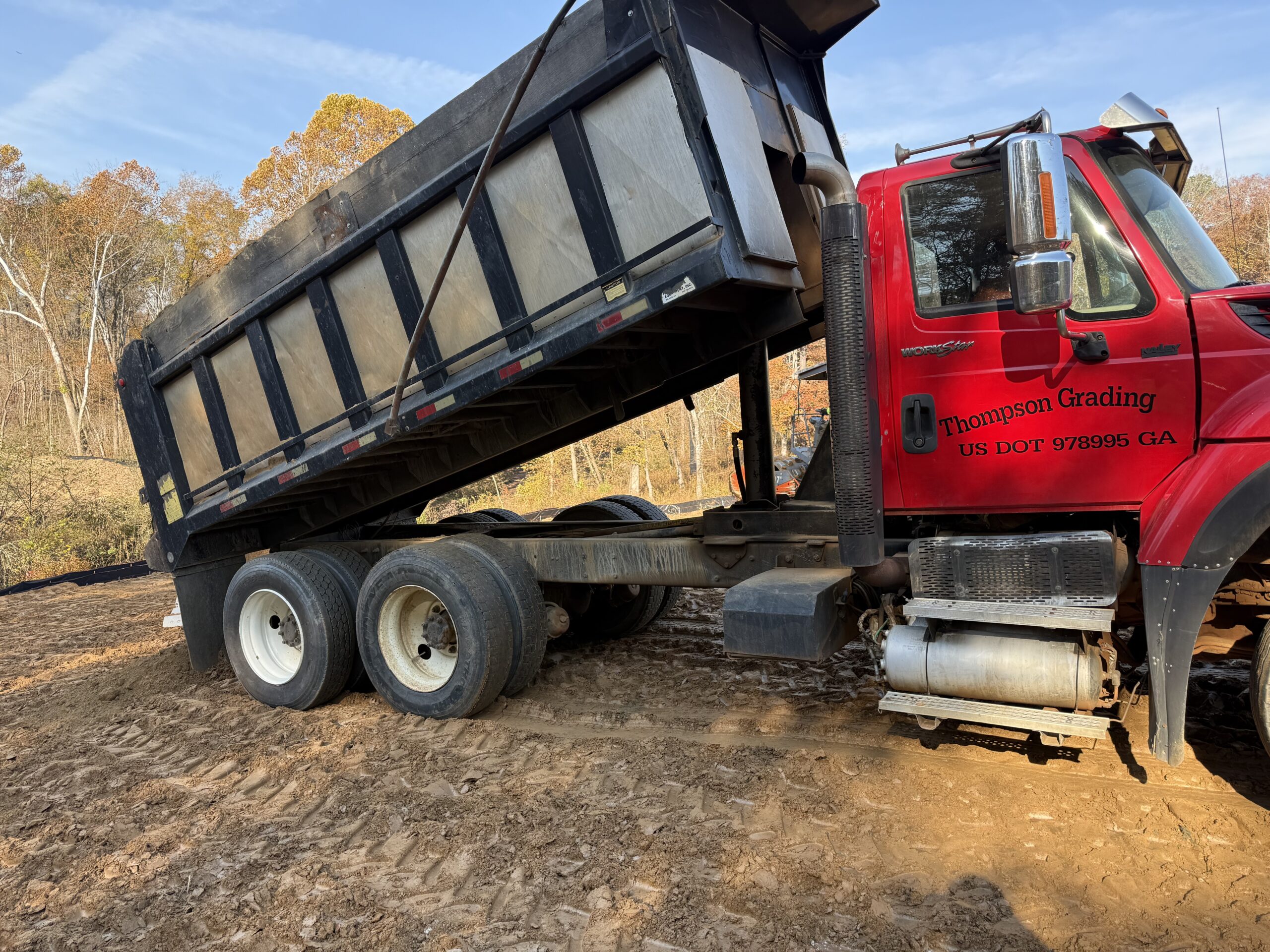 A tandem dump truck was delivering soil to the site.