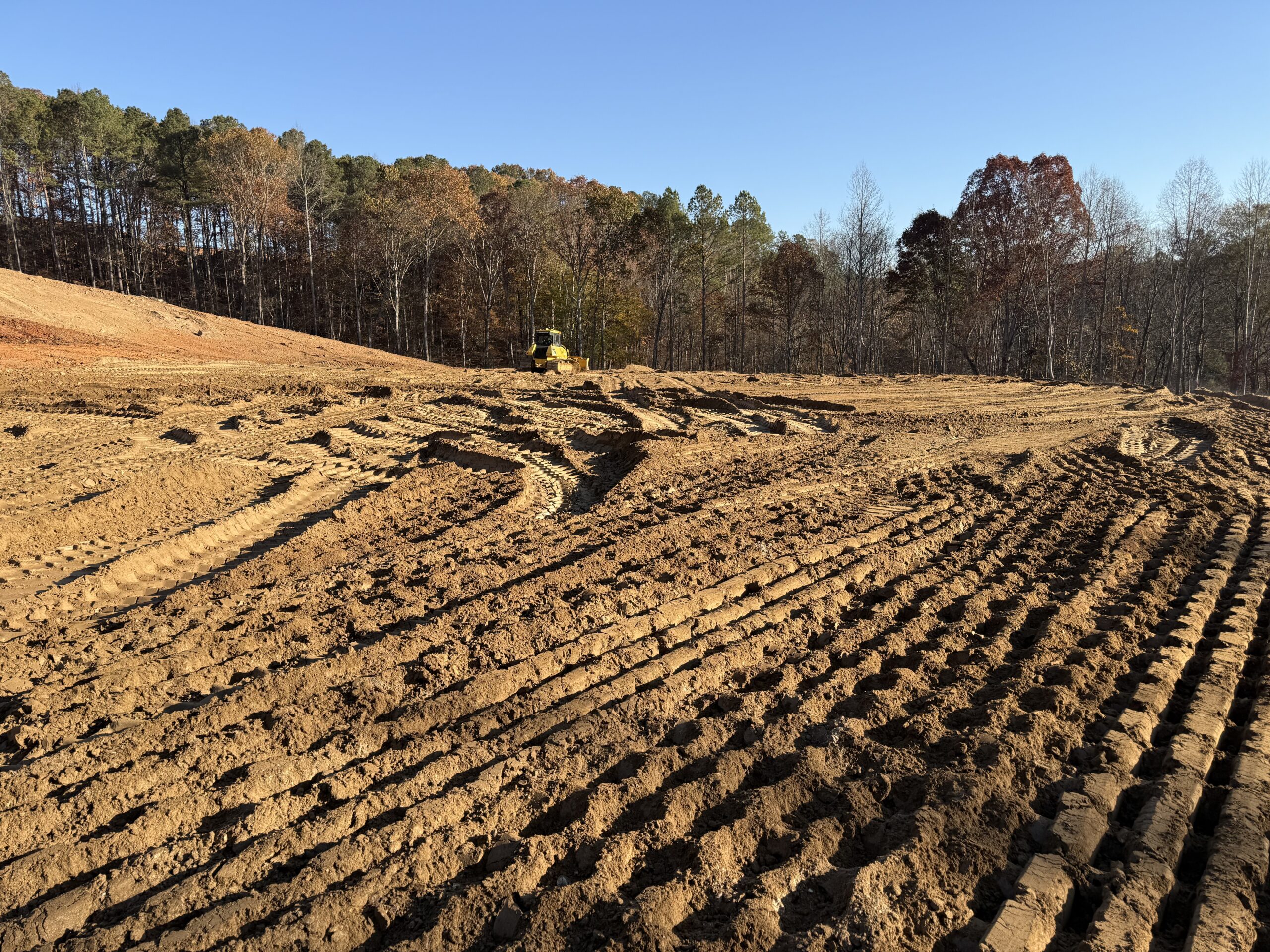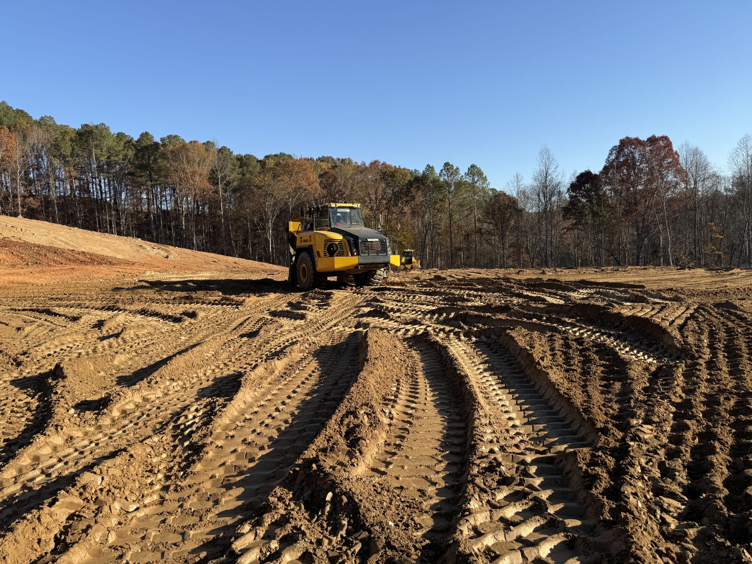 Grading and compaction operations were ongoing with appropriate heavy equipment in use.