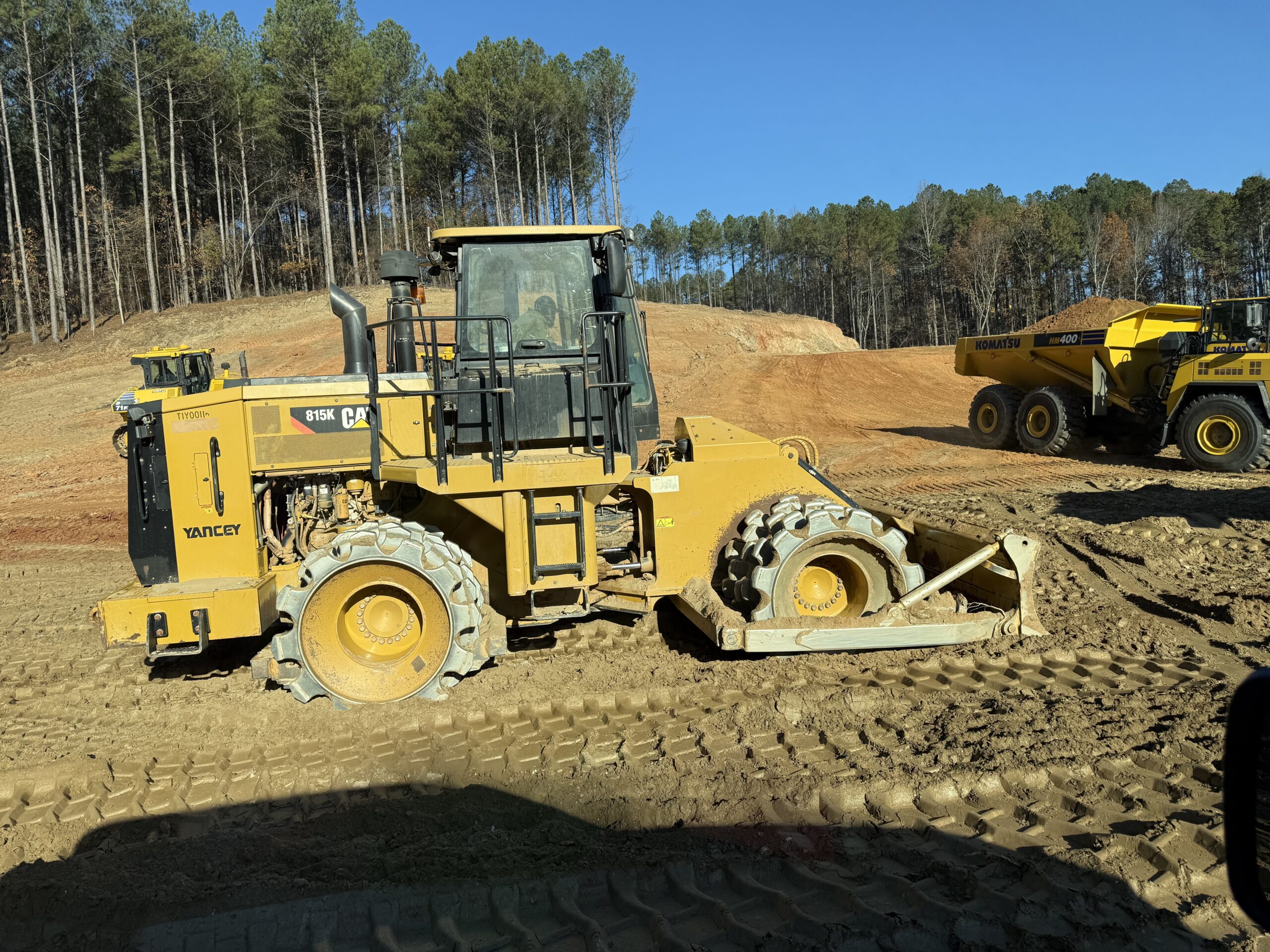 One Caterpillar 815 ride-on sheepsfoot roller compacting the placed material