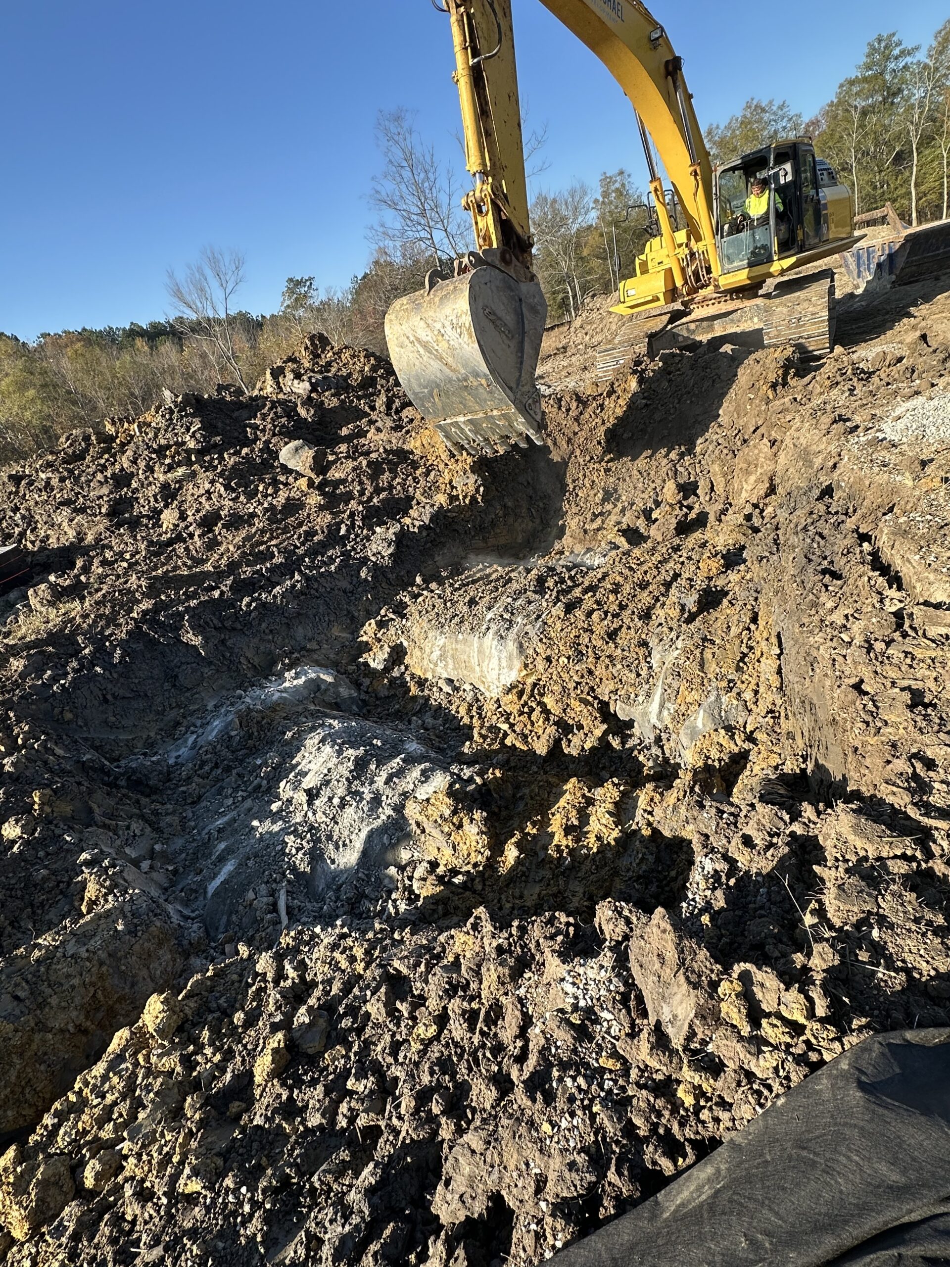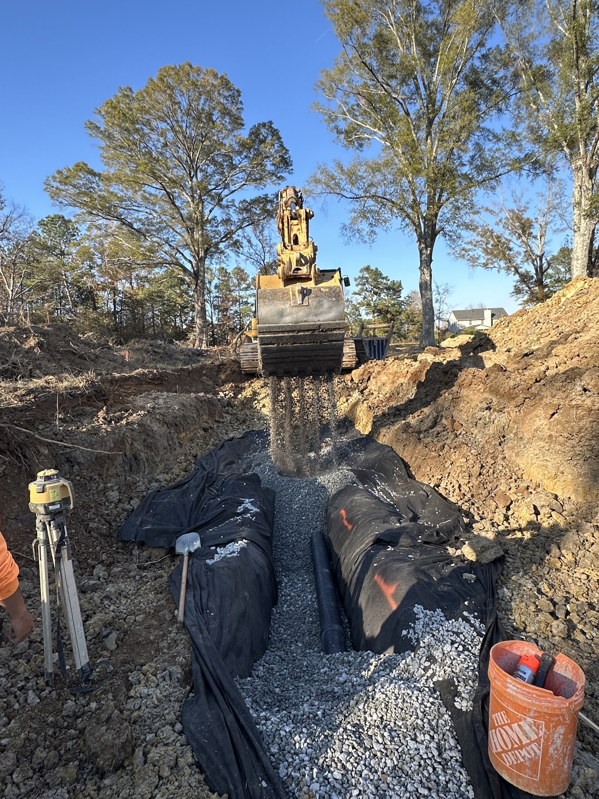 Excavation and installation continued today at the Caseville Road tract for the French drain (“burrito wrap”) project. Work continued at the midway point of C3, where the crew excavated soil and installed pipe. At the area between Buildings #41 through #43, a large rock was encountered in the soil, causing a temporary stop in work. The crew then moved to Building #35, where they cleared the area, excavated soils and connected a T-joint to the existing pipeline. New pipes were installed and backfilled/compacted. No groundwater or slope instability was observed at the time of excavation.