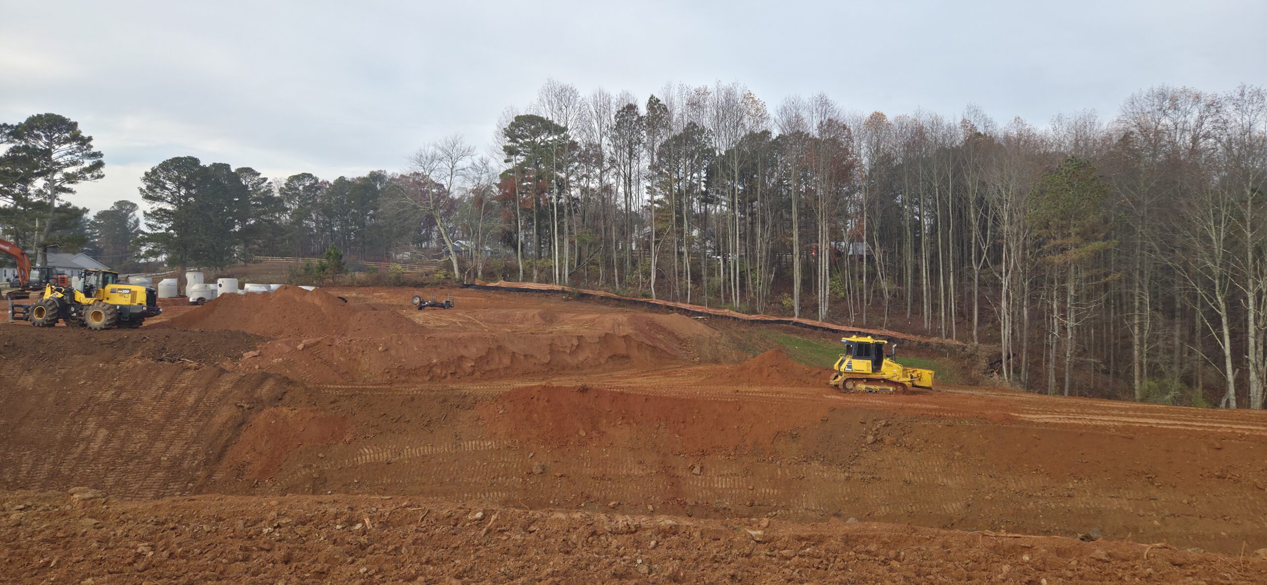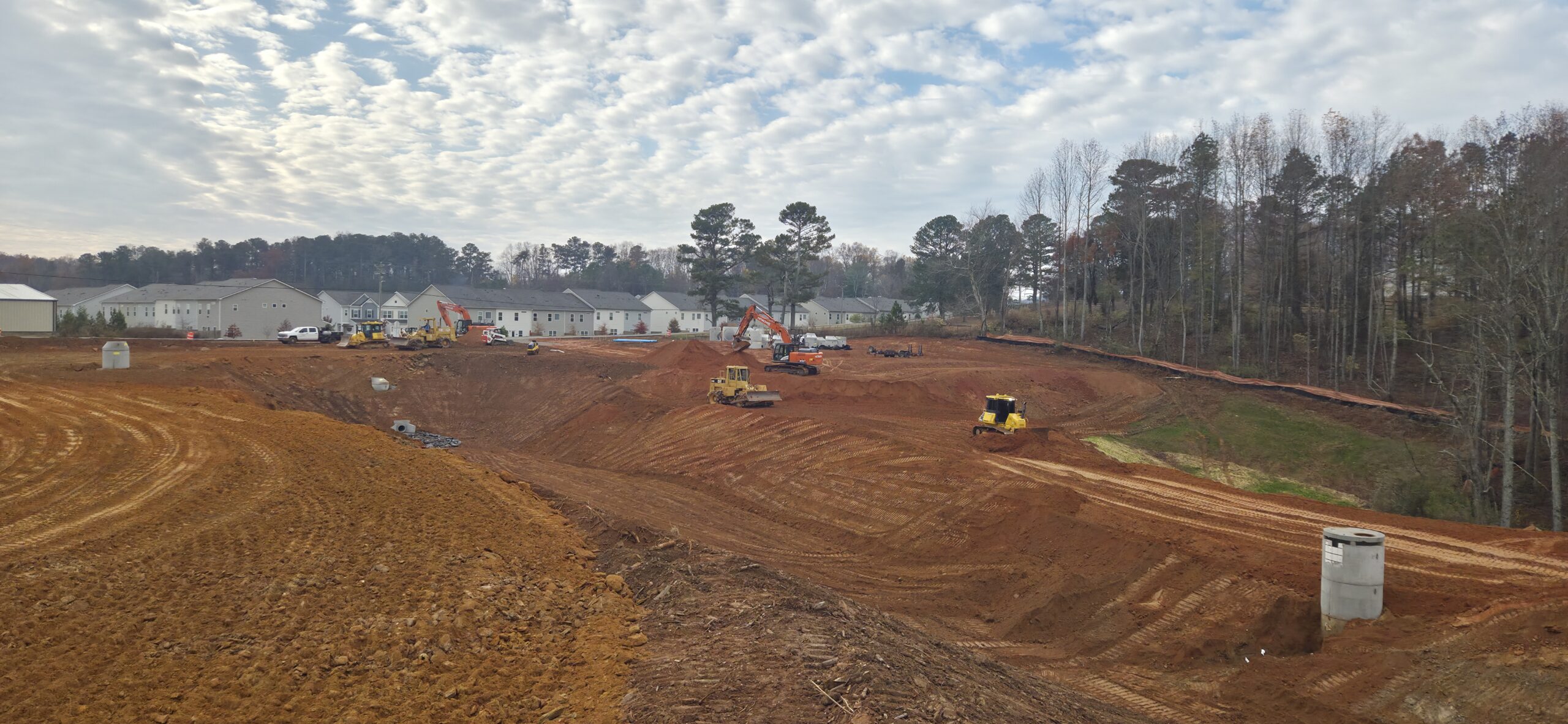 The contractor continued to build up the slope and roadway in front of Lots #4 and #5. The contractor is attempting to build the bank of the detention pond up above the drainage structure before the forecasted rainfall later this evening and this weekend. Density testing was performed, and test results were provided to the contractor. ASEC watched as loaded dump trucks rolled across the lifts to check for stability. There were no signs of severe pumping or rutting present.