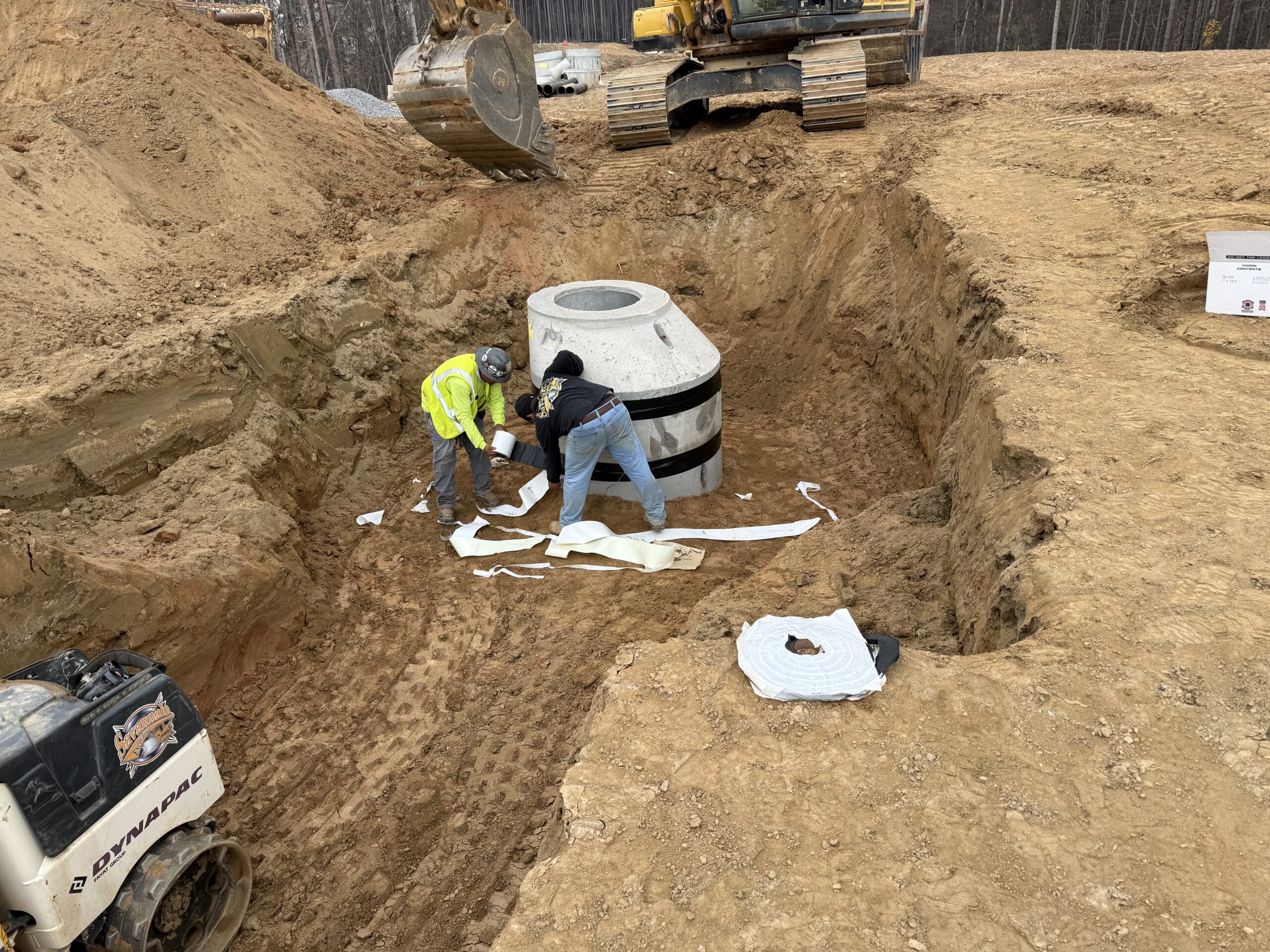 In a separate work area along the Main Parkway Extension, a trench located near the centerline of the future roadway was being completed. Manhole #4 and Manhole #5 had been installed prior to arrival (unobserved), and 12-inch pipe was placed between the two structures. Backfilling operations were performed using a Kobelco 350 excavator to place fill material. Compaction was achieved using a trench packer and a ride-on vibratory sheepsfoot roller (see photos). Three 12-inch lifts were placed and compacted. Each lift was probed following compaction. Additional compaction was requested on each lift.