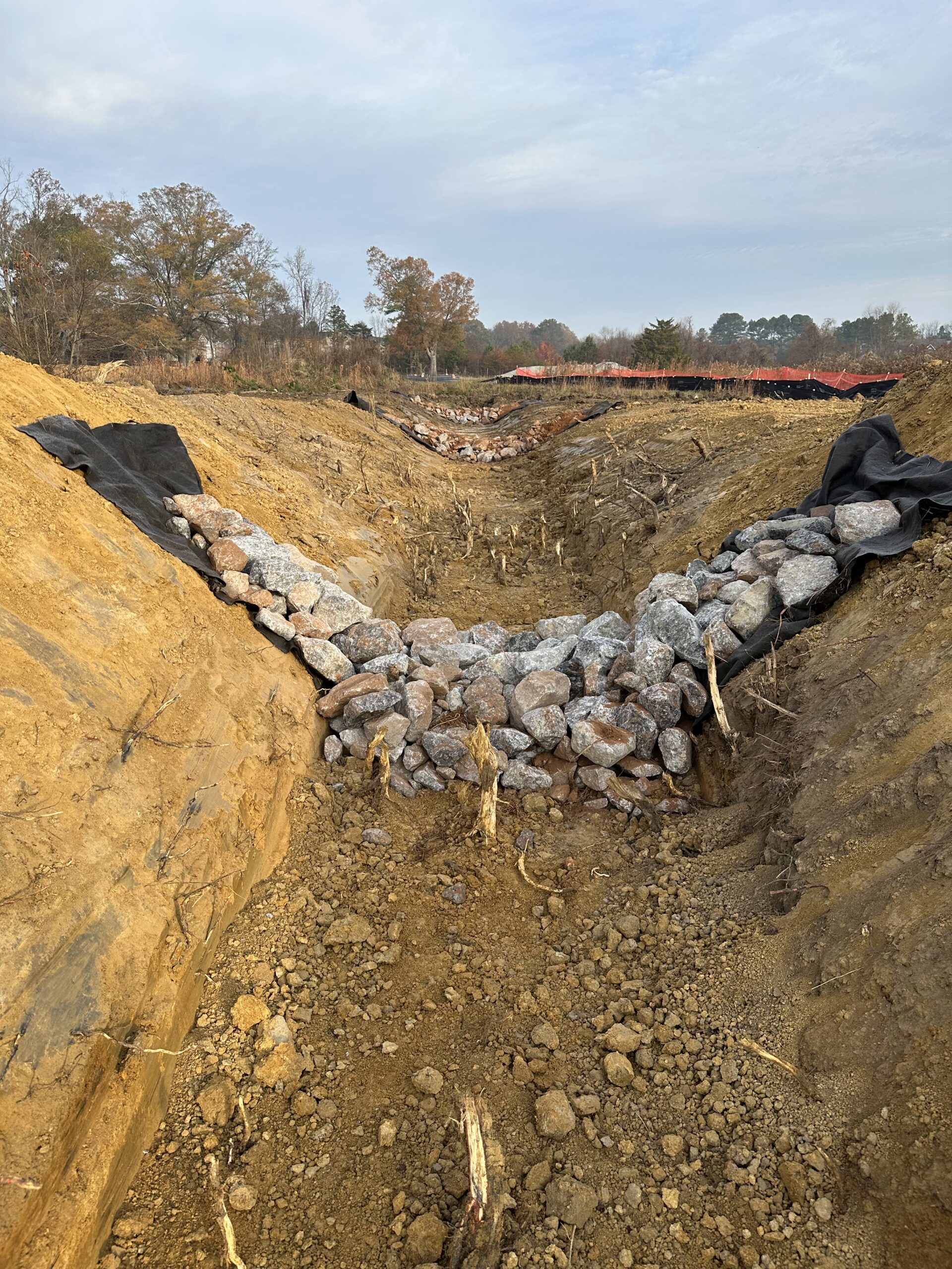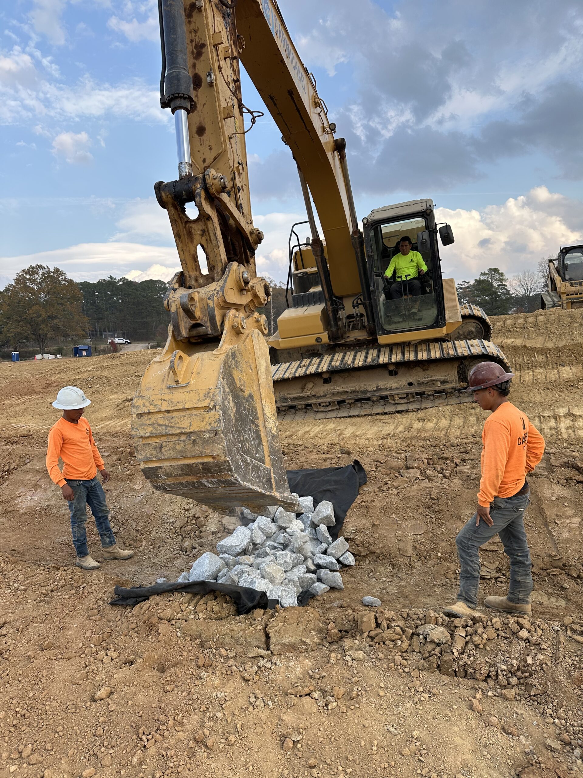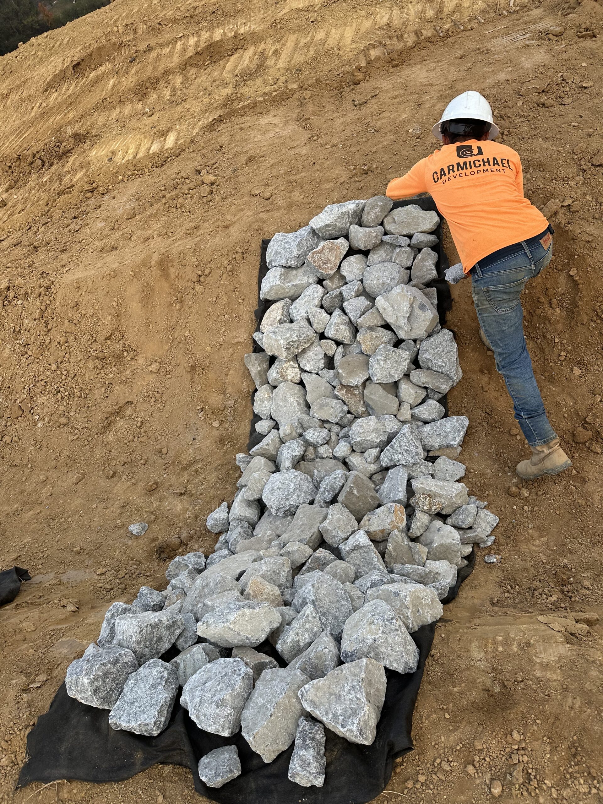 At SD3-B, the crew installed the drainage access in the northeast direction, leveled the area, and placed three riprap sections as per the plan.