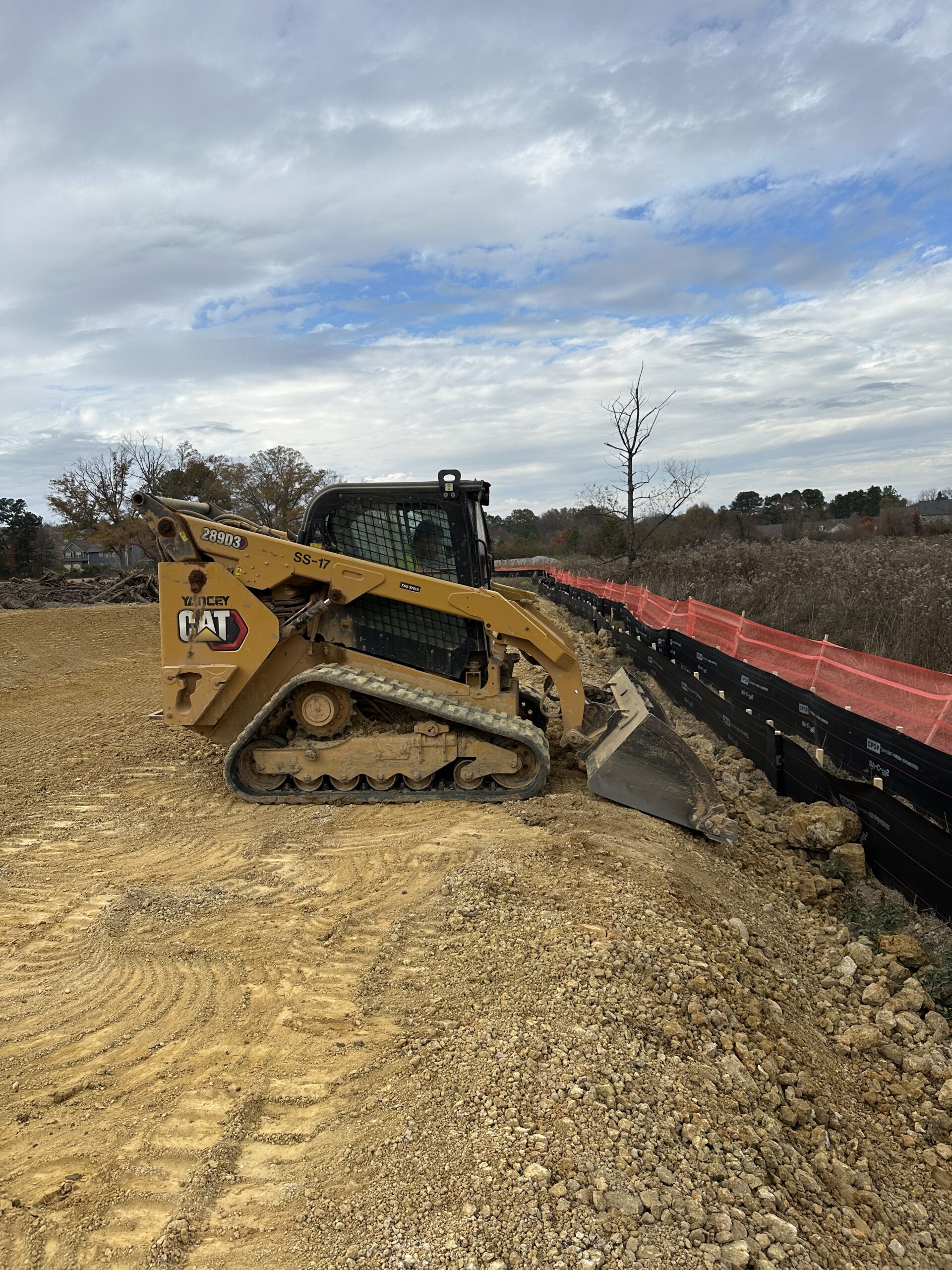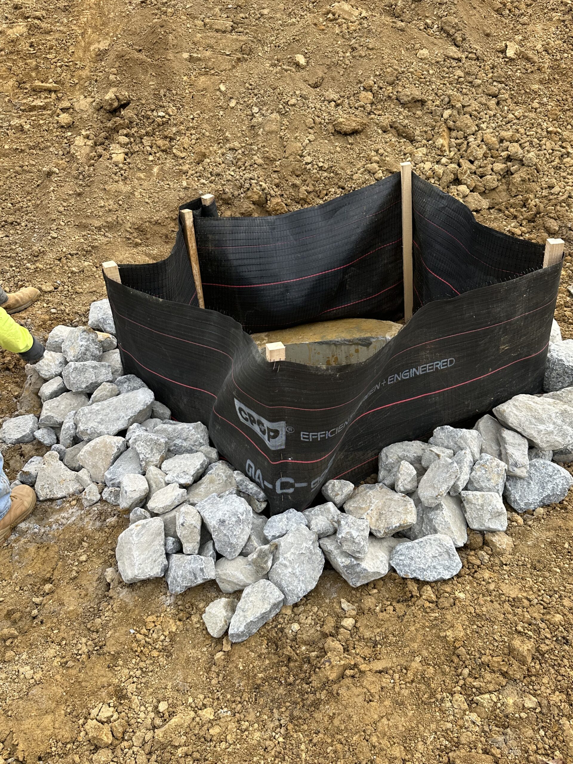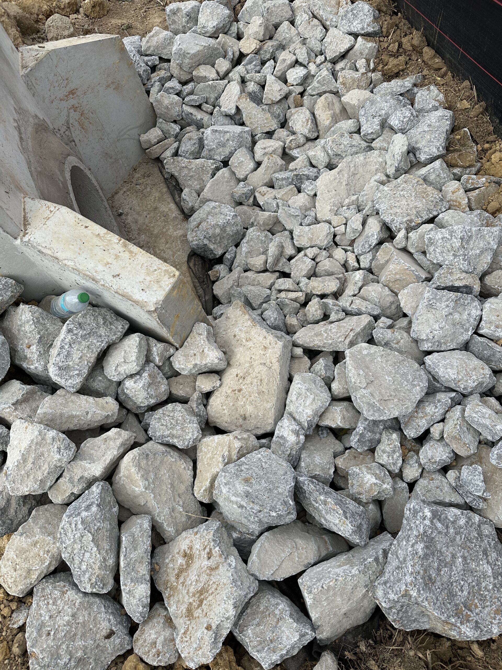 A silt-fence barrier was installed around the concrete storm drain structure at SD3-B, and riprap was placed around the barrier for protection. Additional riprap was also placed around the concrete headwall. The pond slope was graded and leveled, and the stockpiled soil was moved to one side.