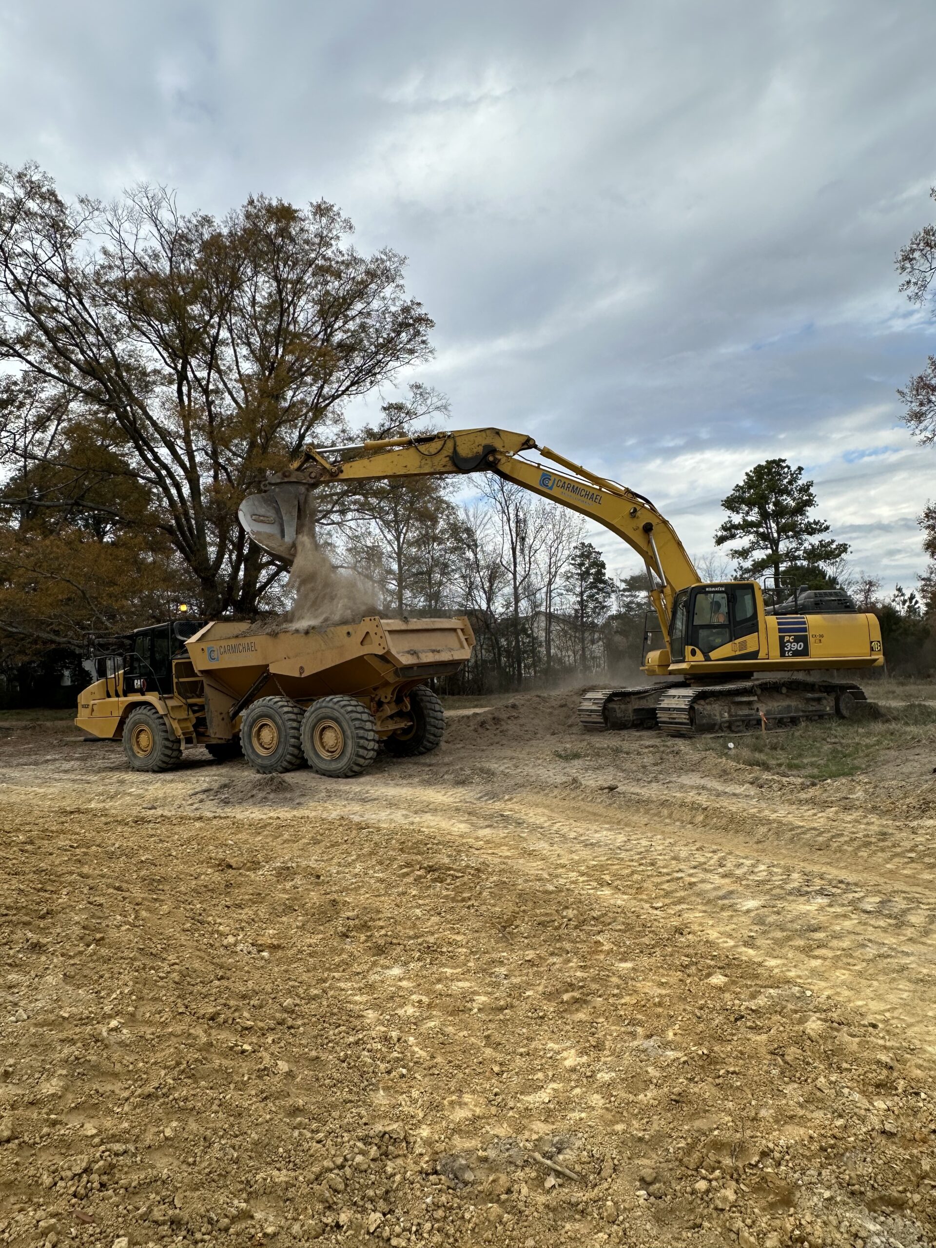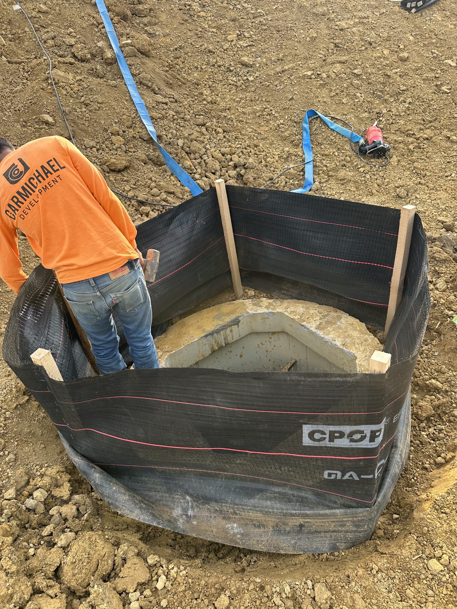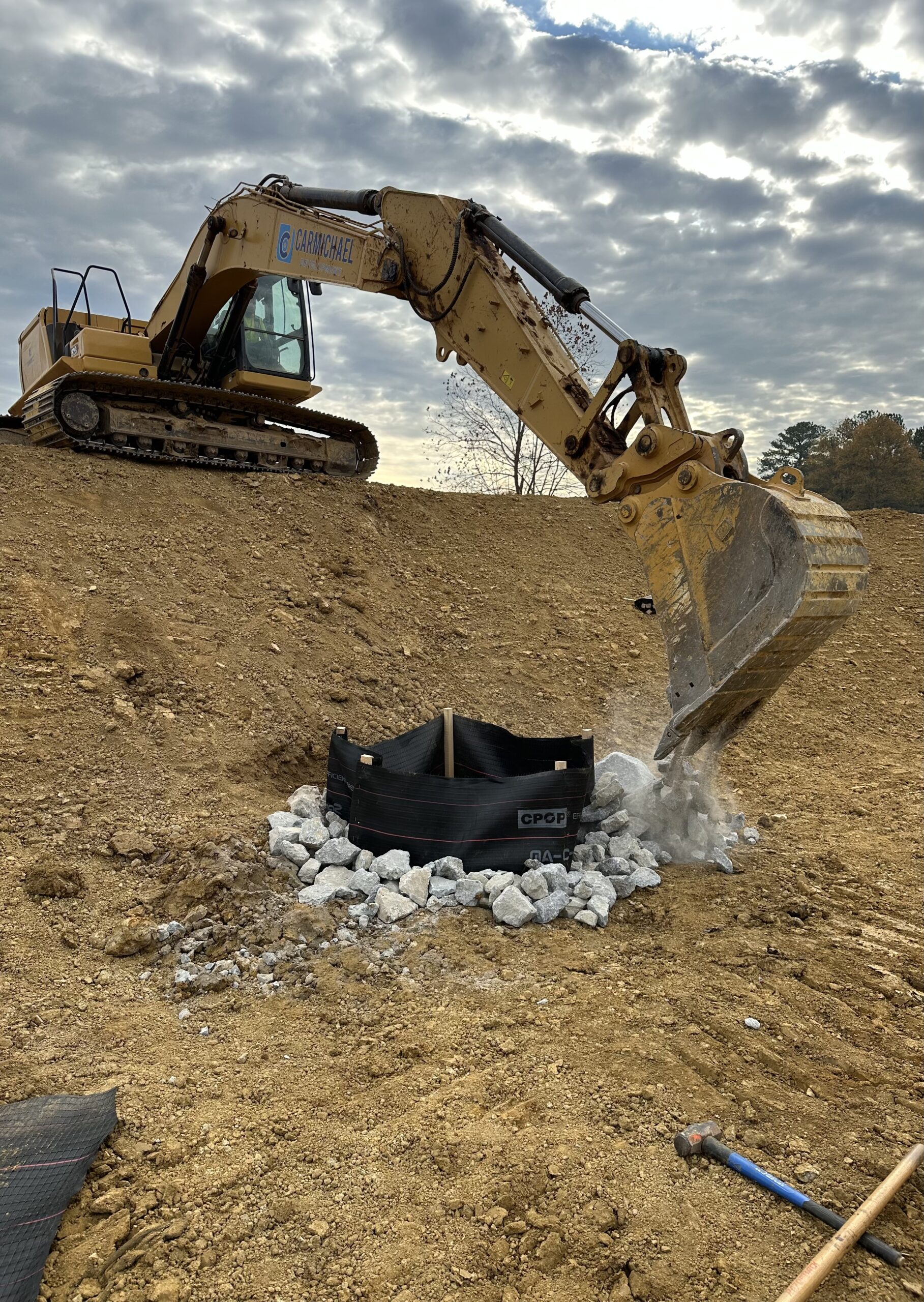 A silt-fence barrier was installed around the concrete storm drain structure at SD3-B, and riprap was placed around the barrier for protection. Additional riprap was also placed around the concrete headwall. The pond slope was graded and leveled, and the stockpiled soil was moved to one side.