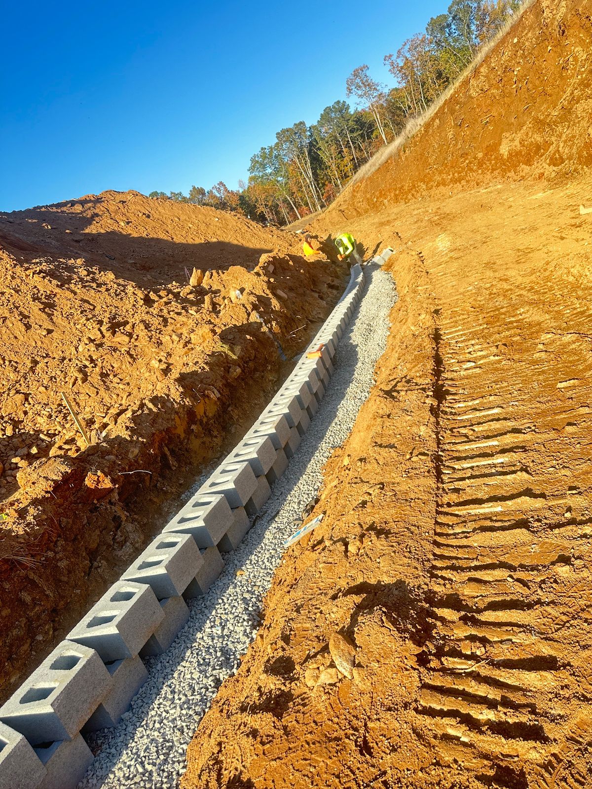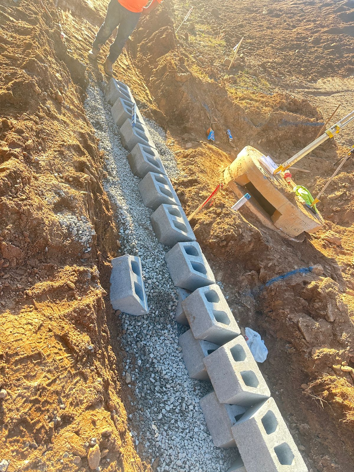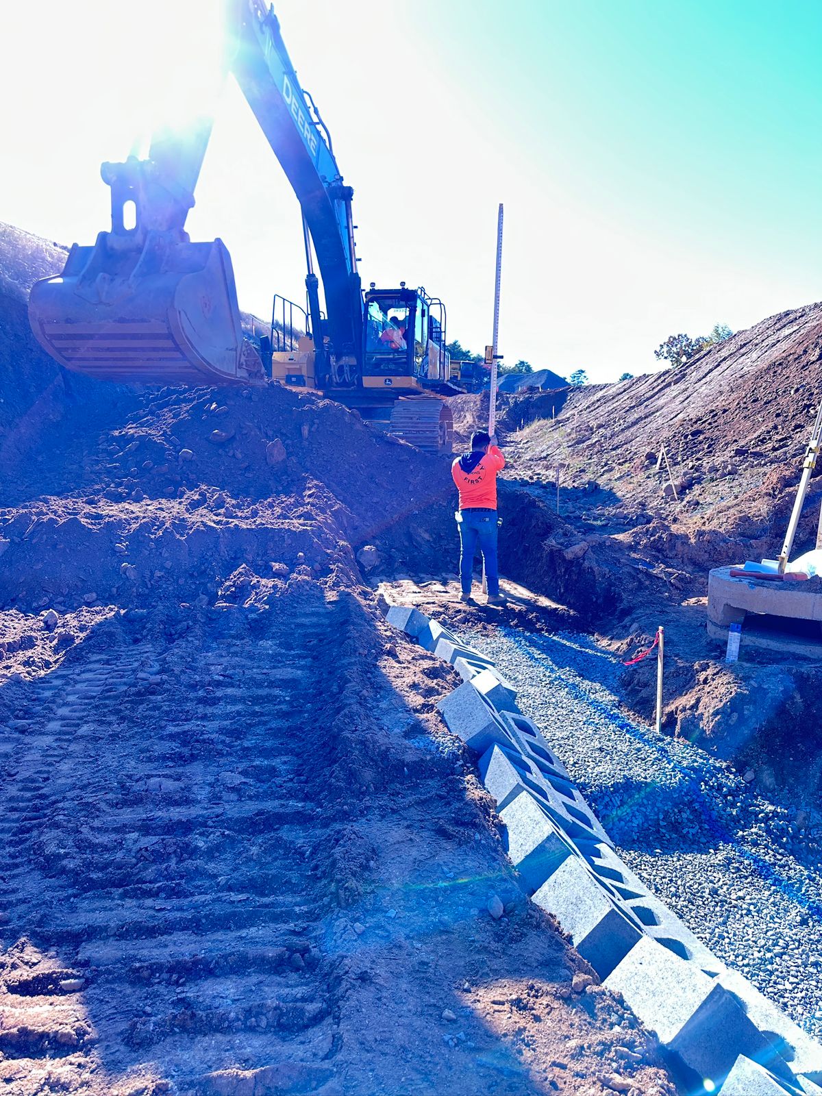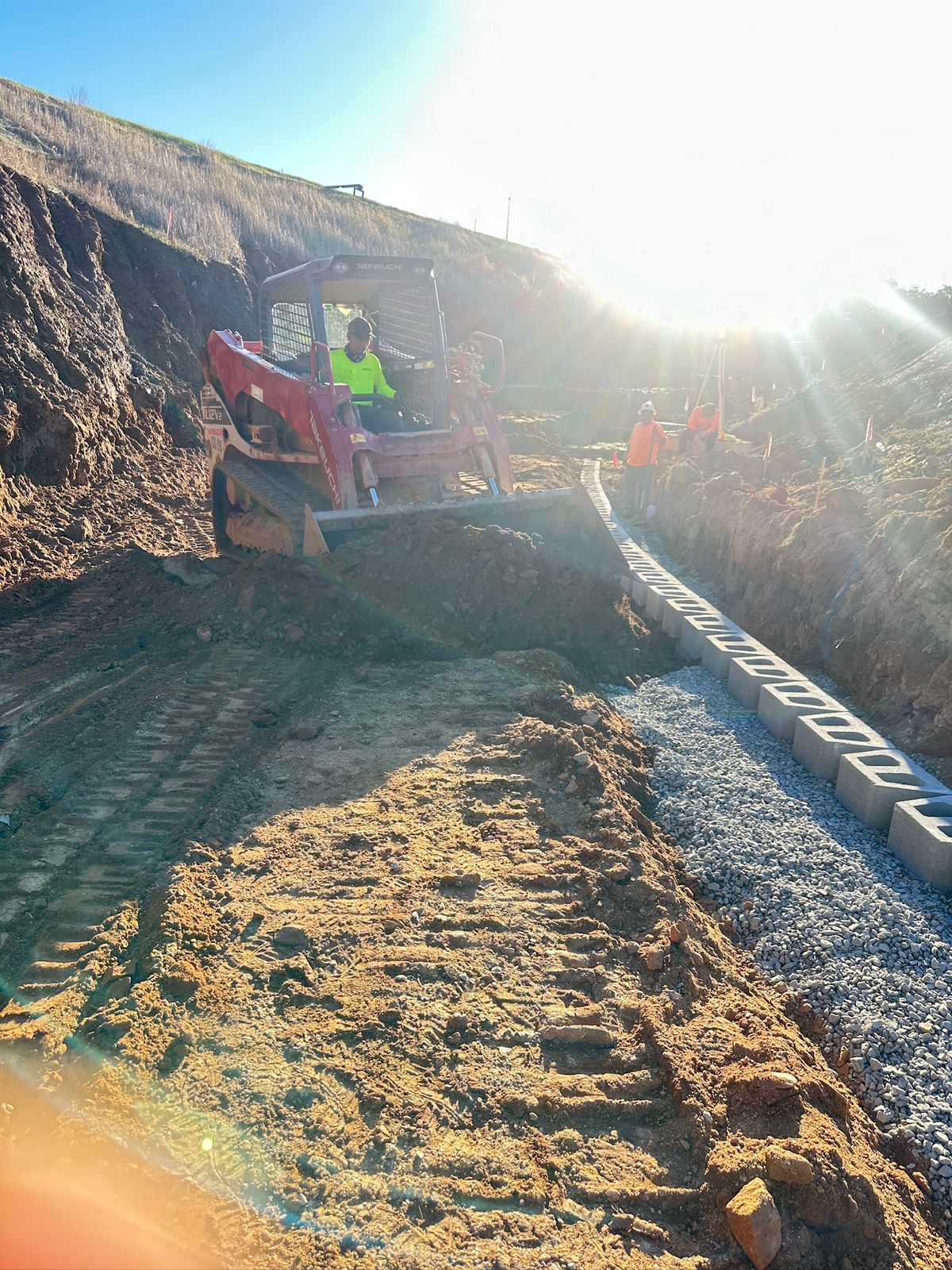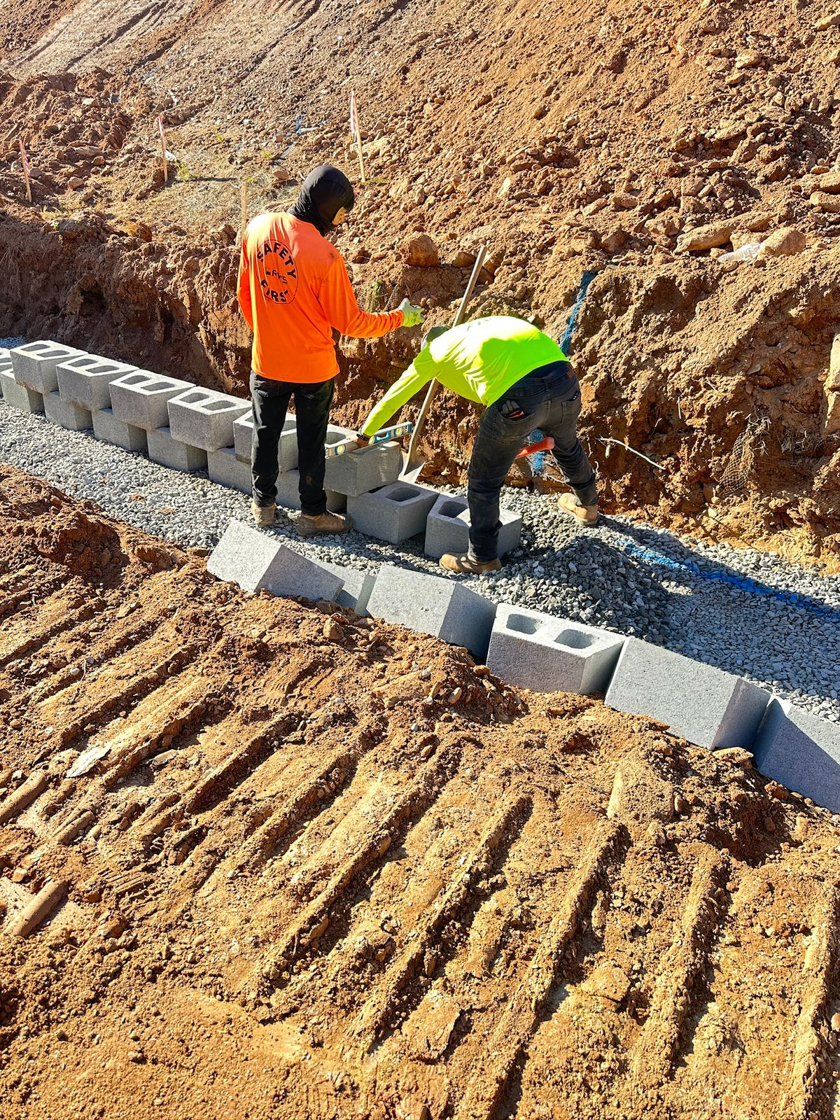 Following the confirmation of soil competency, the crew proceeded with retaining-wall construction. Concrete bricks—each measuring 8 inches in height—were placed in two rows, providing a total initial wall height of 16 inches. Work began at Station 293 near the manhole and continued toward Station 180 where the next manhole is located.