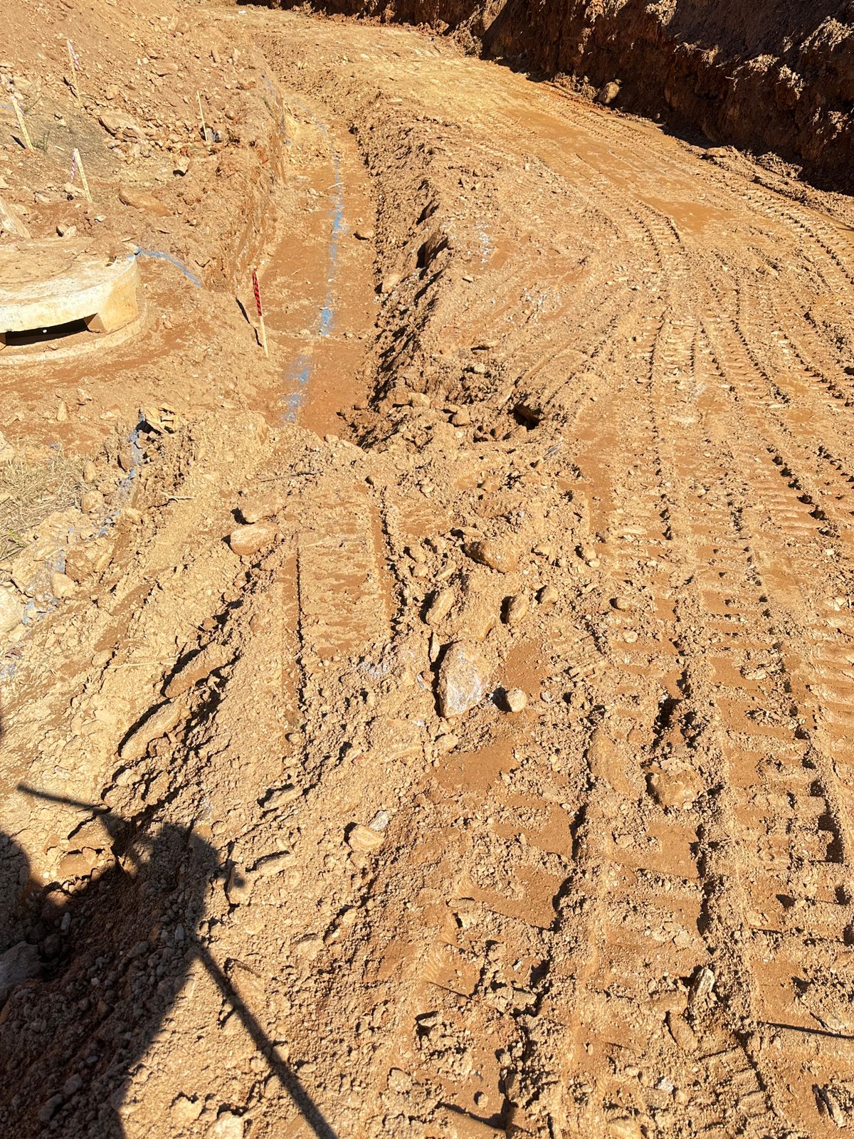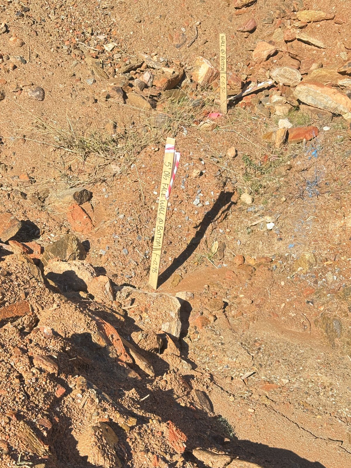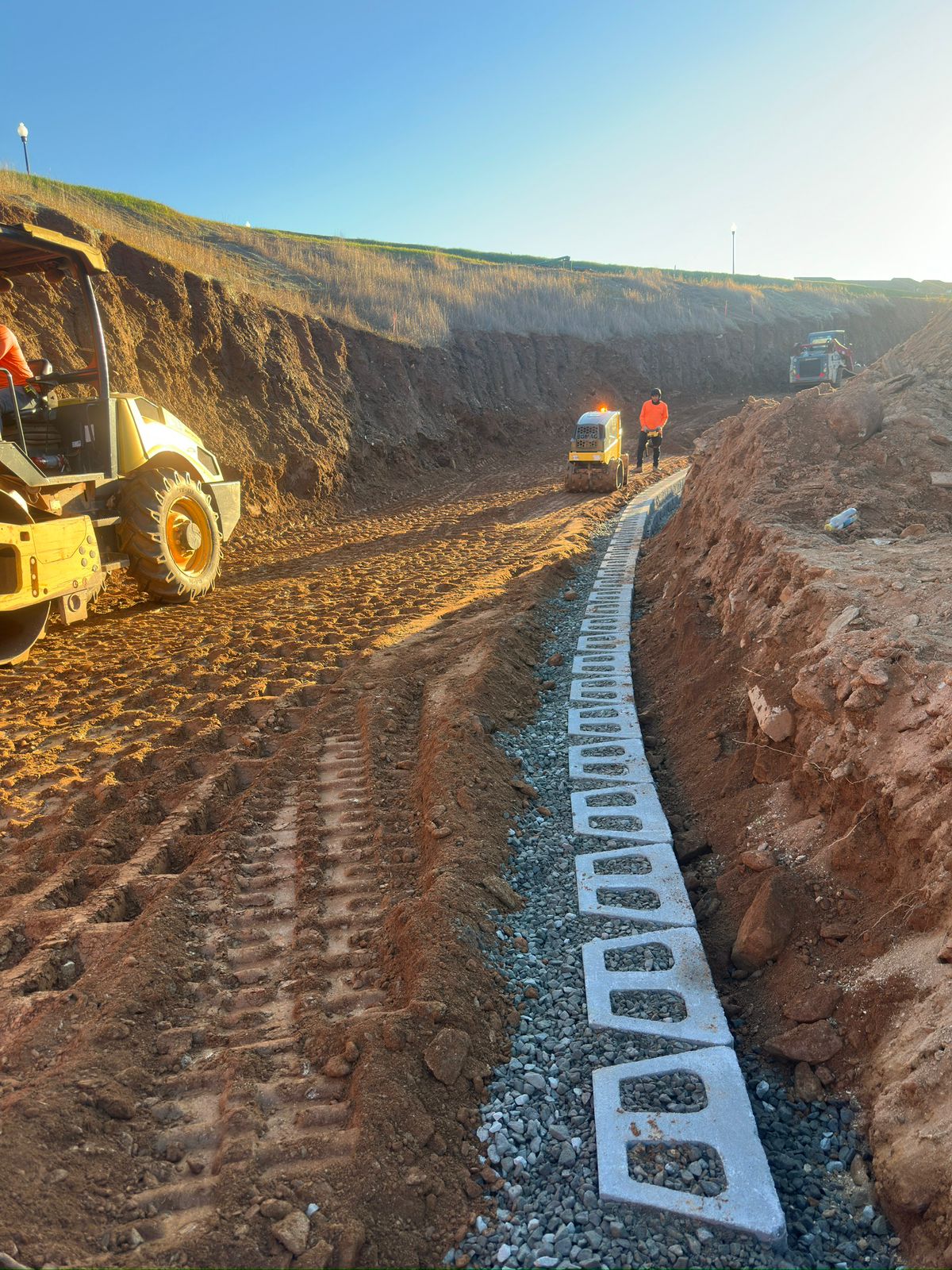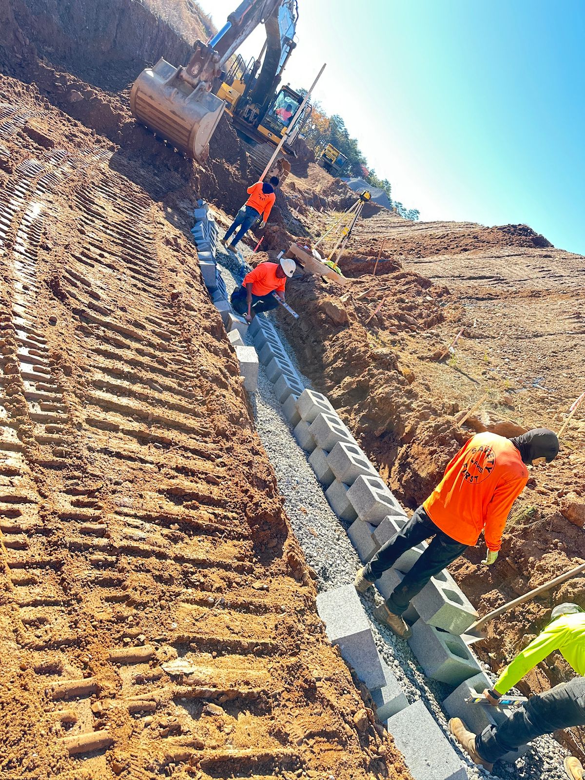 Following the confirmation of soil competency, the crew proceeded with retaining-wall construction. Concrete bricks—each measuring 8 inches in height—were placed in two rows, providing a total initial wall height of 16 inches. Work began at Station 293 near the manhole and continued toward Station 180 where the next manhole is located.