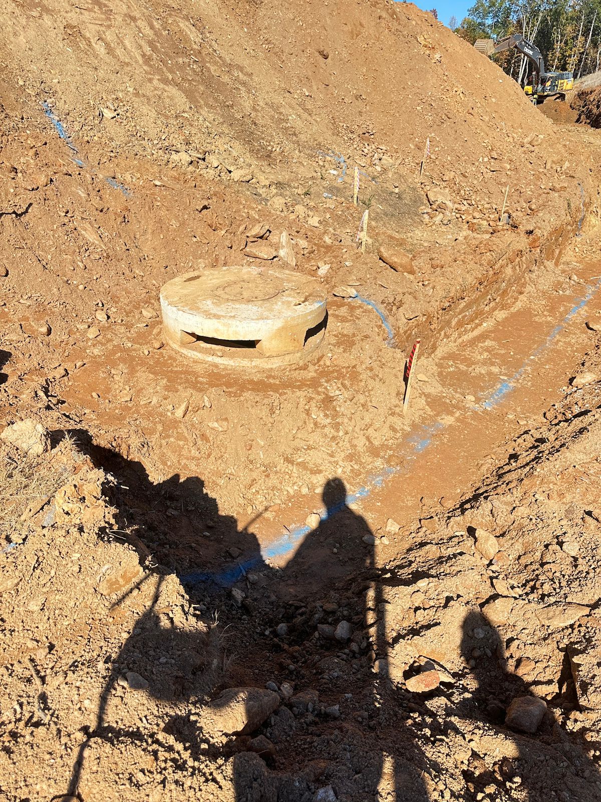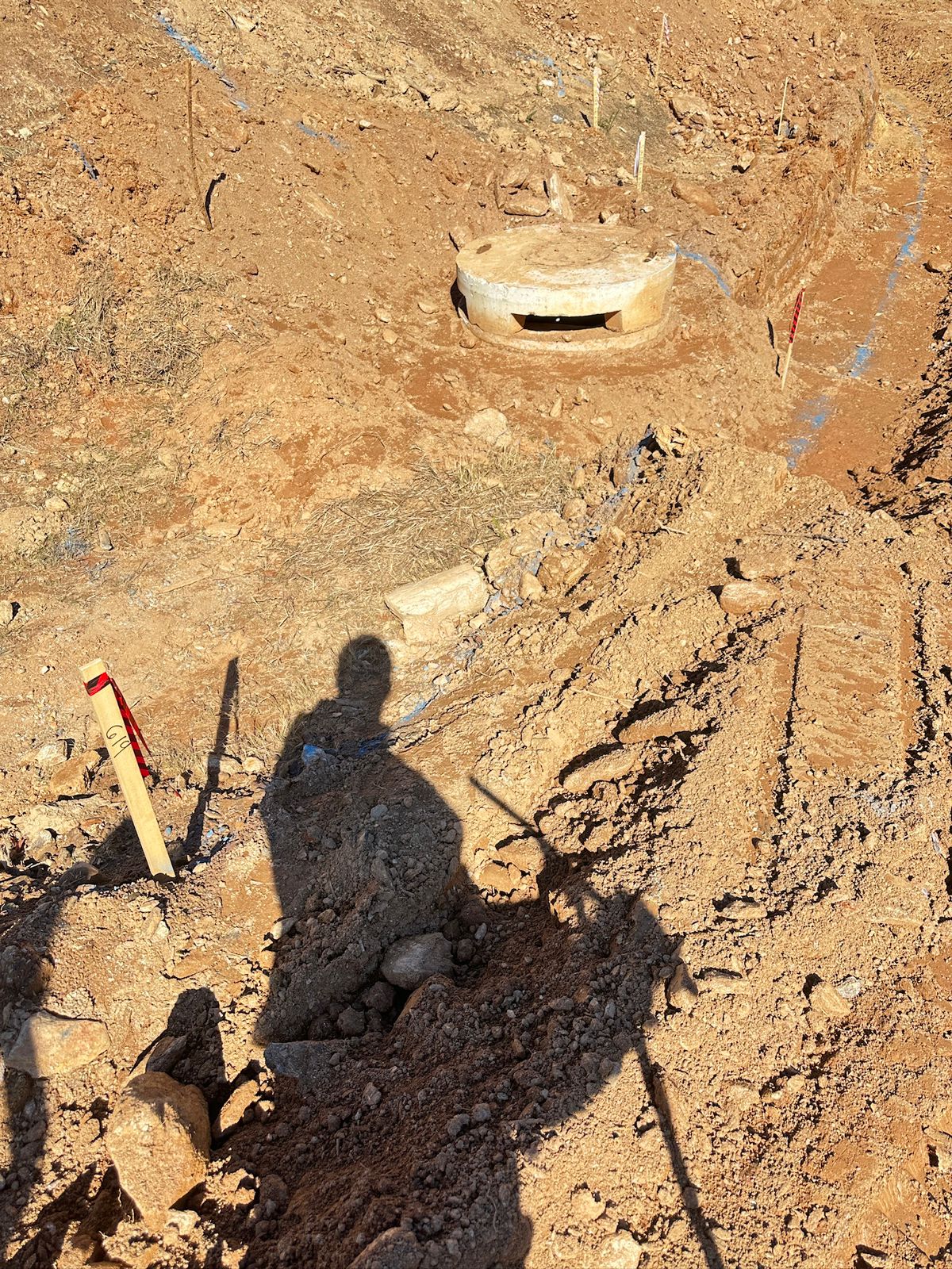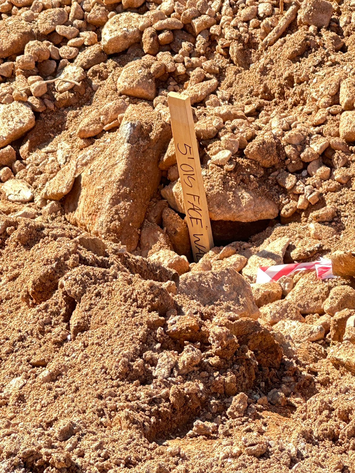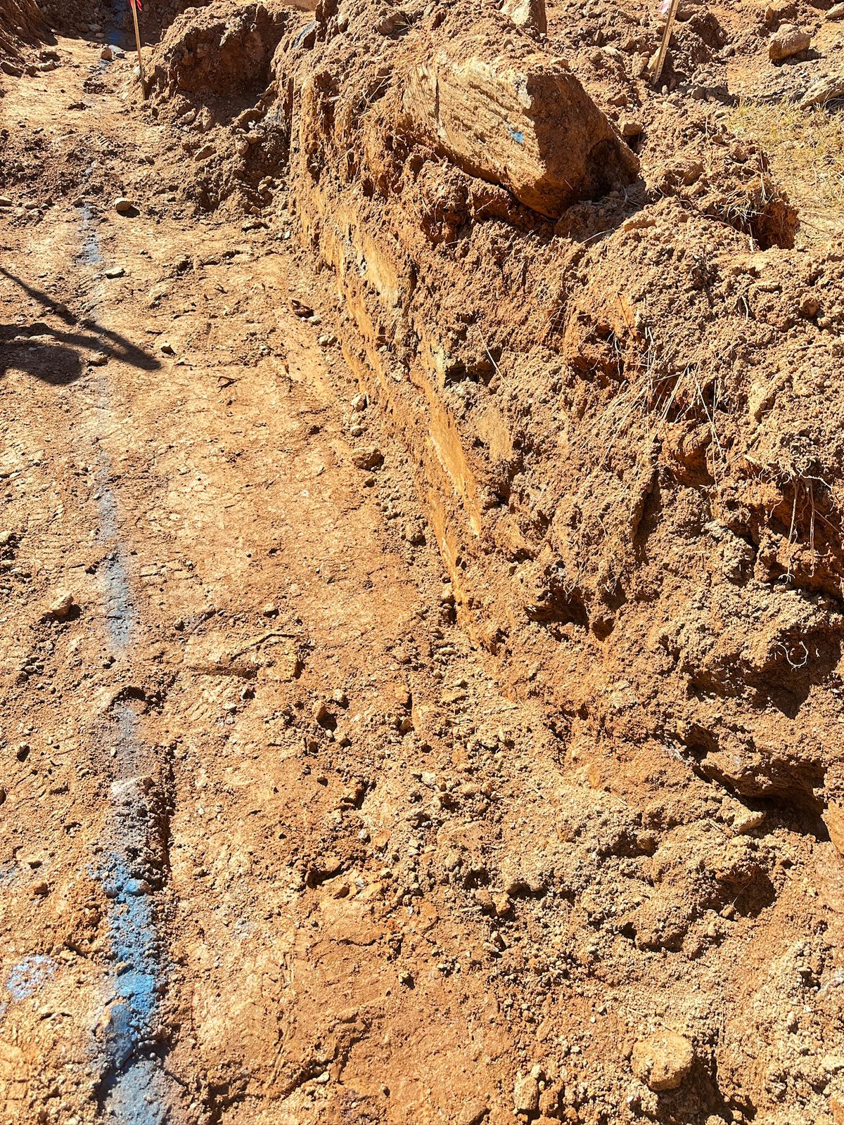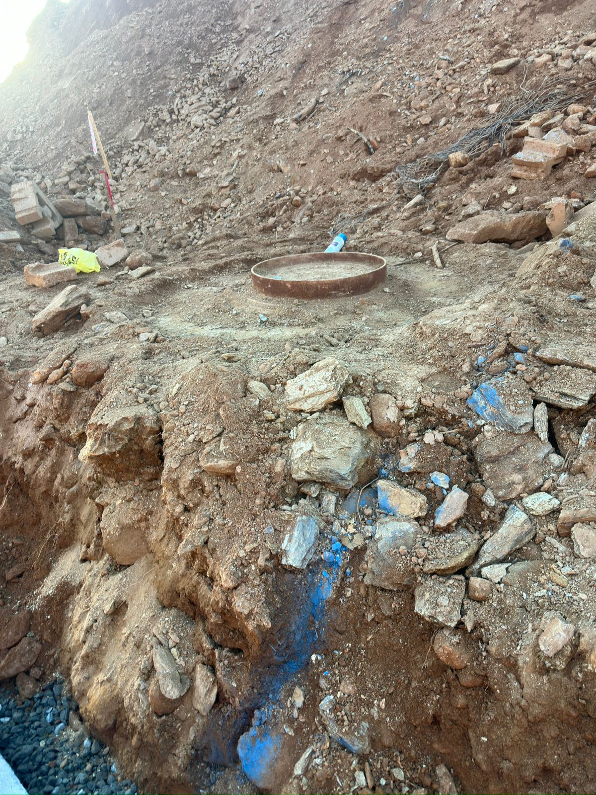 Following the confirmation of soil competency, the crew proceeded with retaining-wall construction. Concrete bricks—each measuring 8 inches in height—were placed in two rows, providing a total initial wall height of 16 inches. Work began at Station 293 near the manhole and continued toward Station 180 where the next manhole is located.