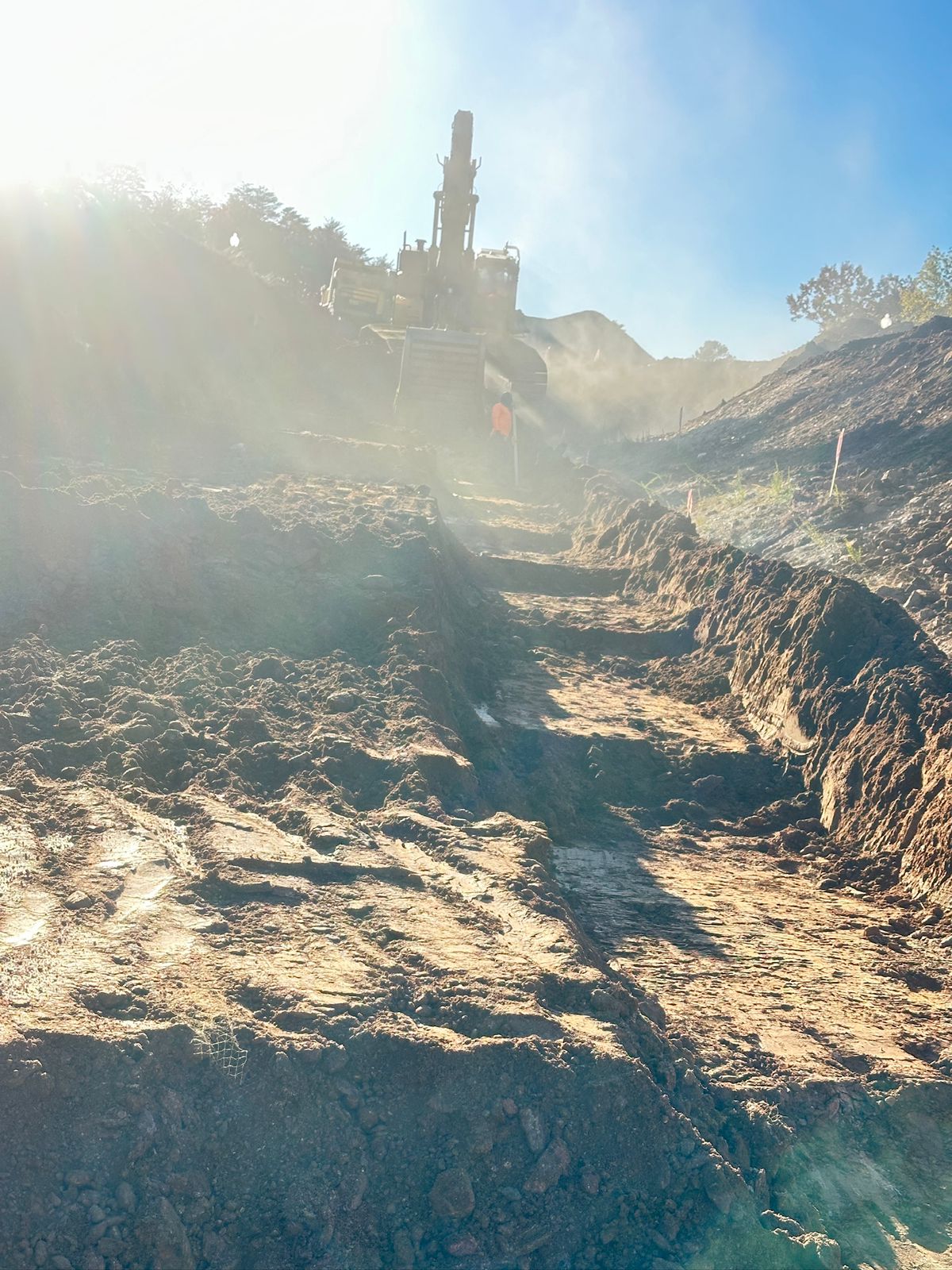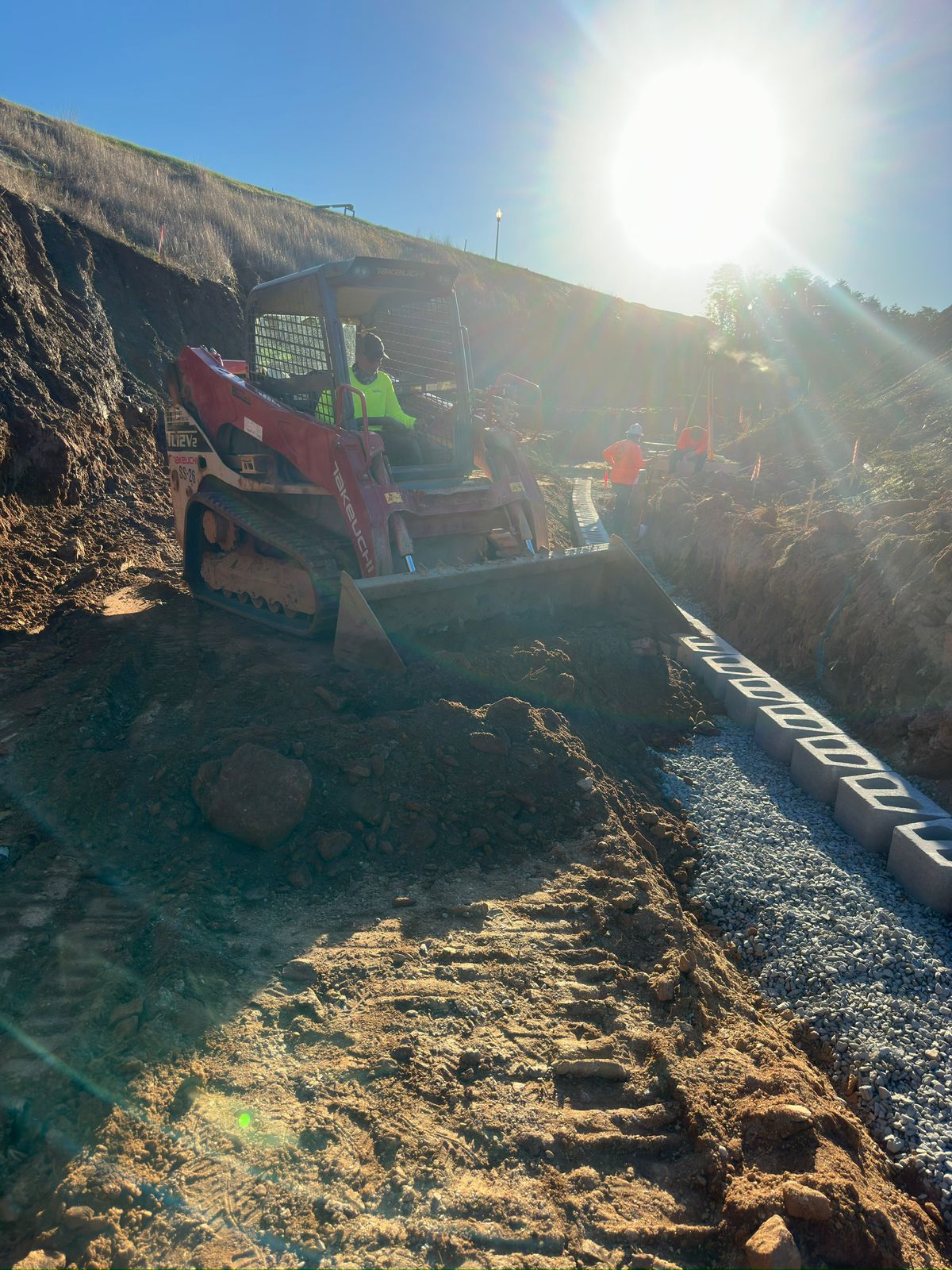 After placing the first 16-inch lift behind the wall section, the crew began backfilling and compacting the soil up to the top of the two brick courses. Once compaction was completed, field density testing was performed. All compaction results passed, achieving approximately 95% compaction, meeting project requirements and confirming the suitability of the placed backfill.