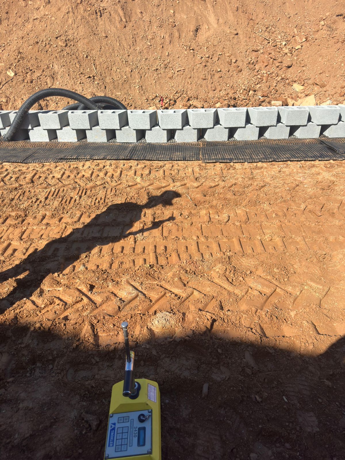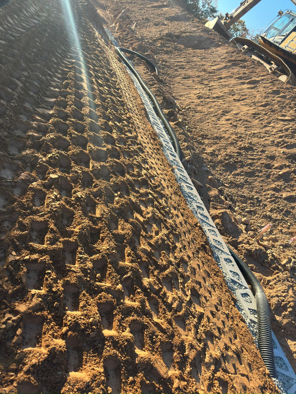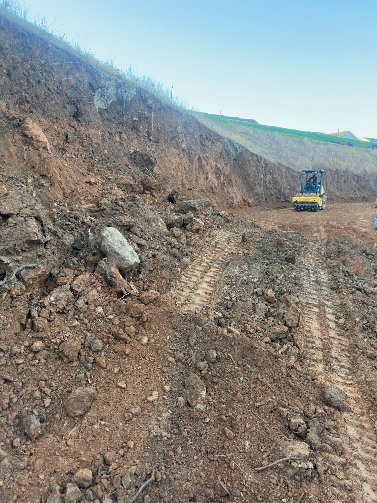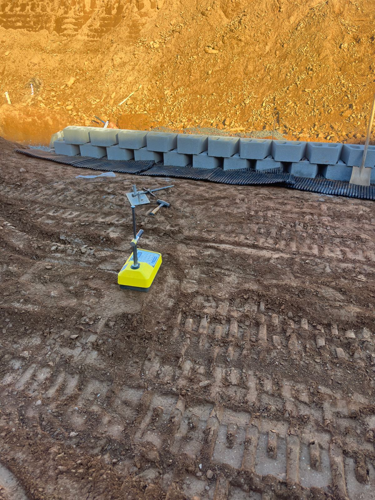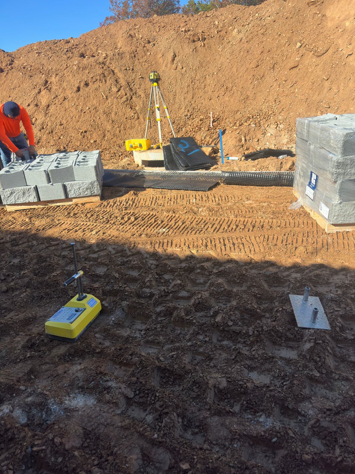 The contractor began the day by clearing and removing soil from the backside of the slope to achieve the required cut depth for the full design height of the retaining wall.