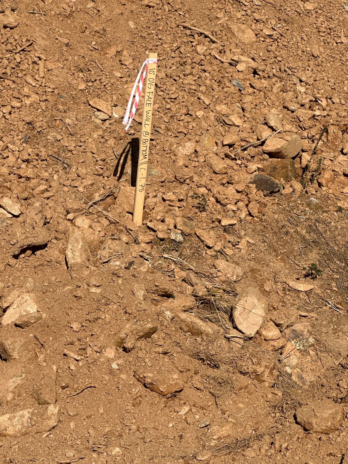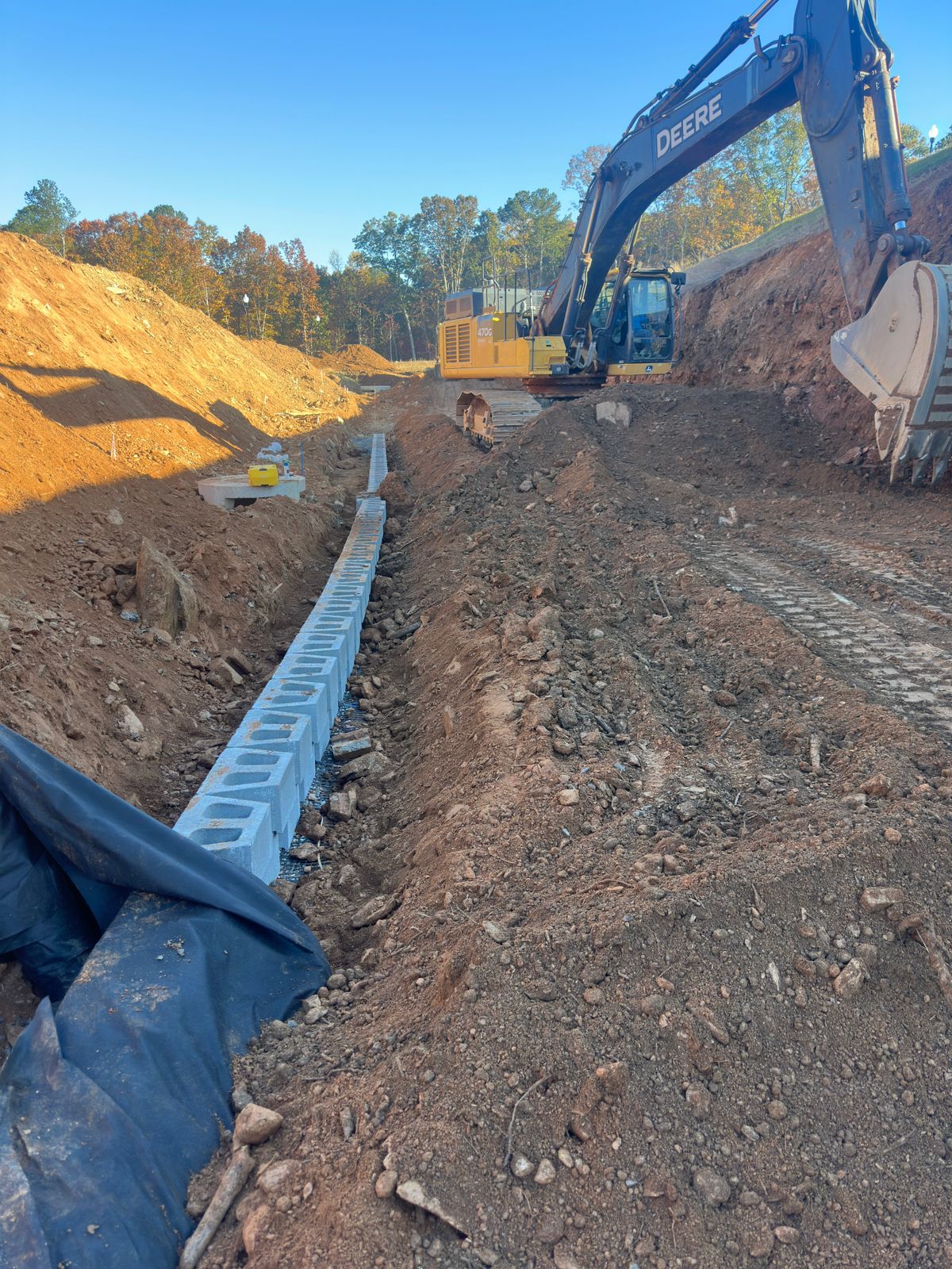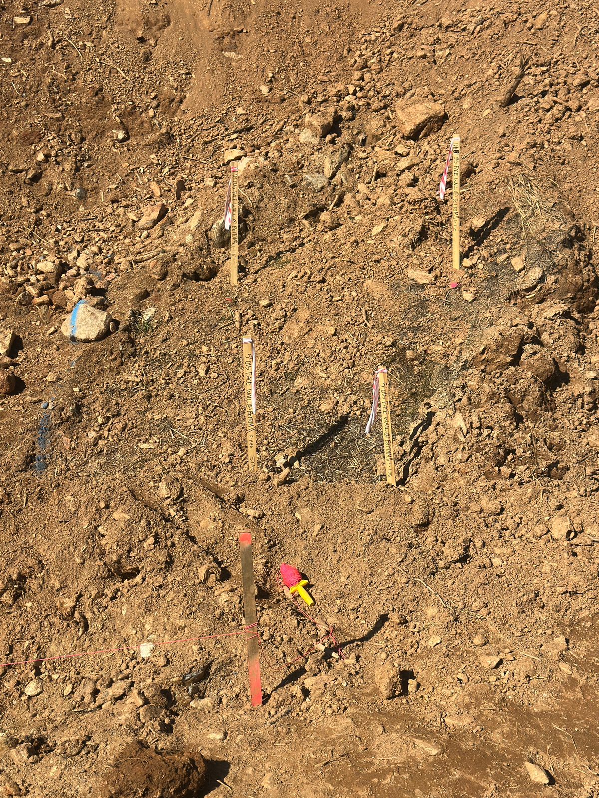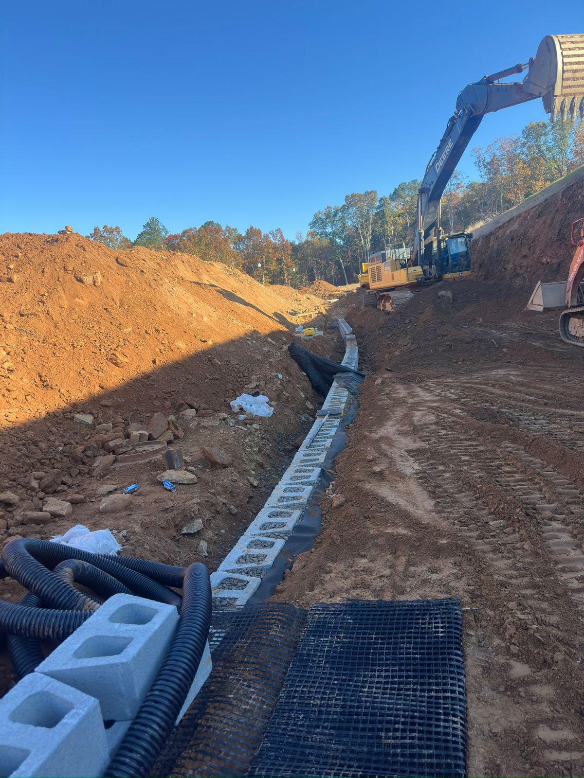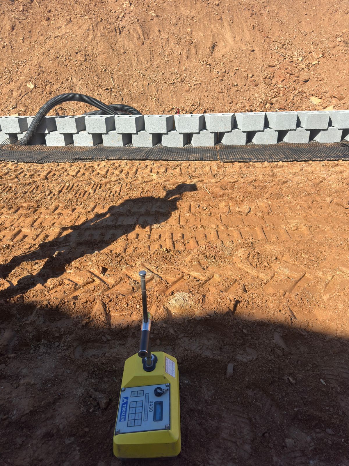 The contractor began the day by clearing and removing soil from the backside of the slope to achieve the required cut depth for the full design height of the retaining wall.