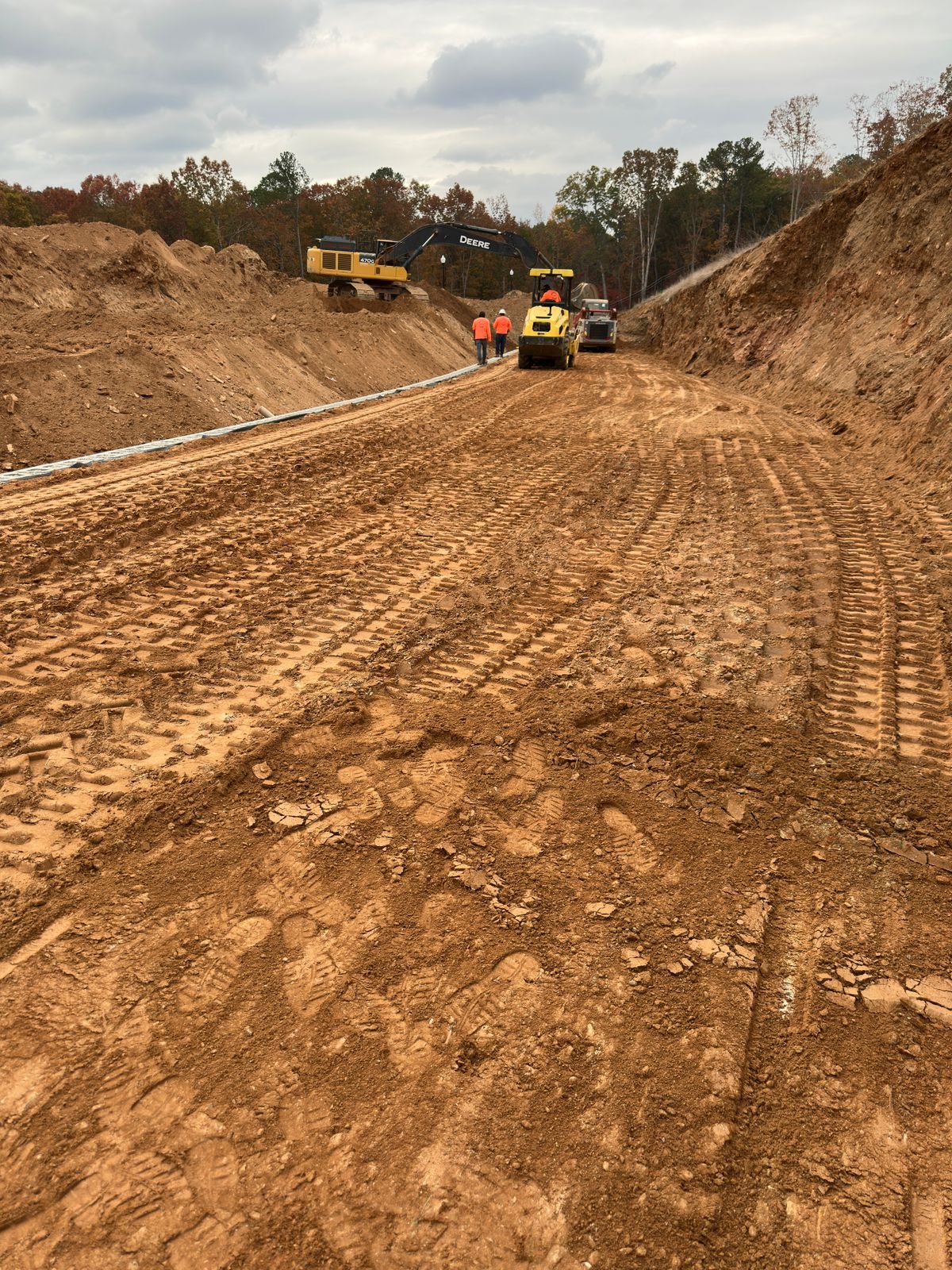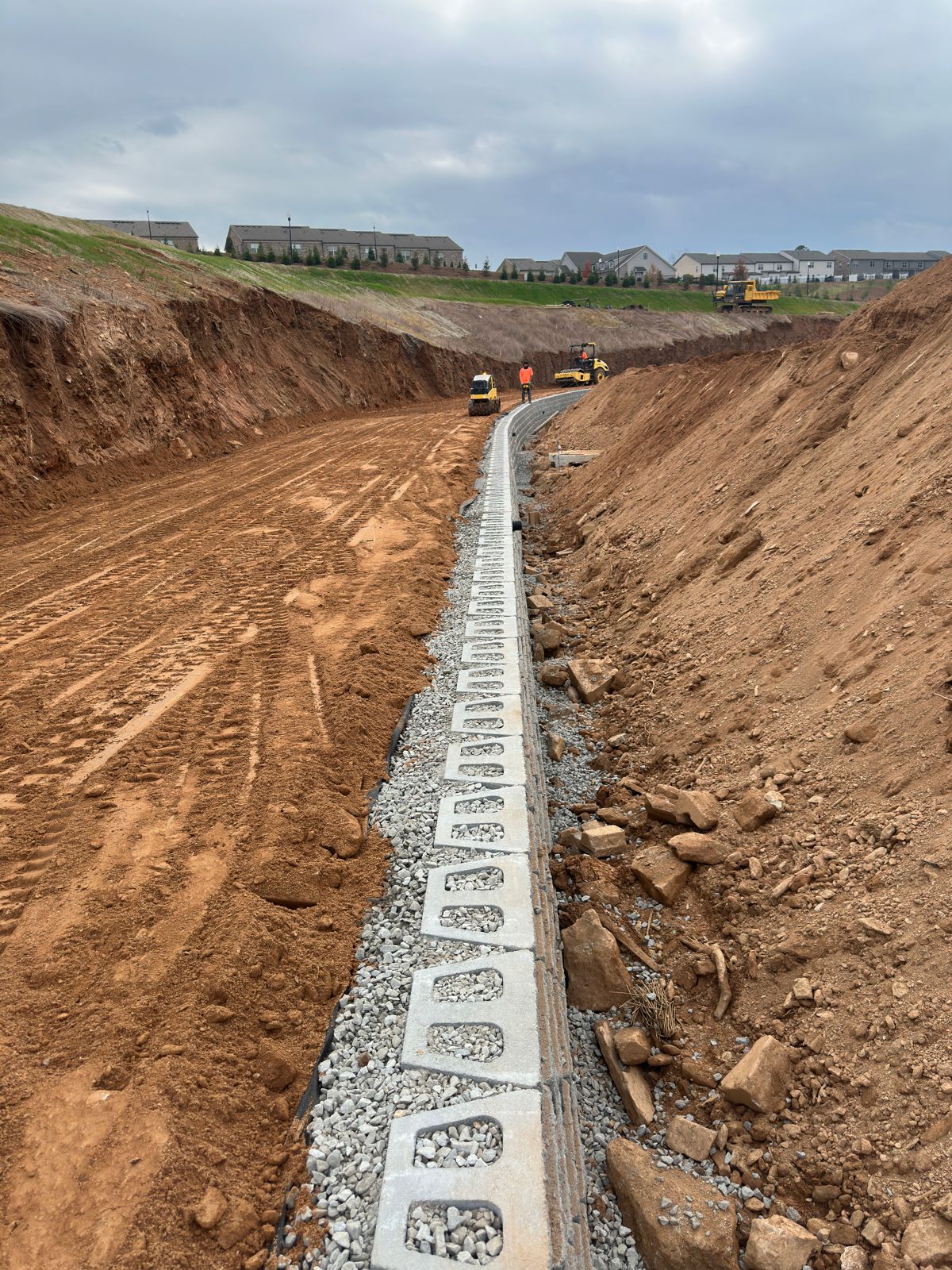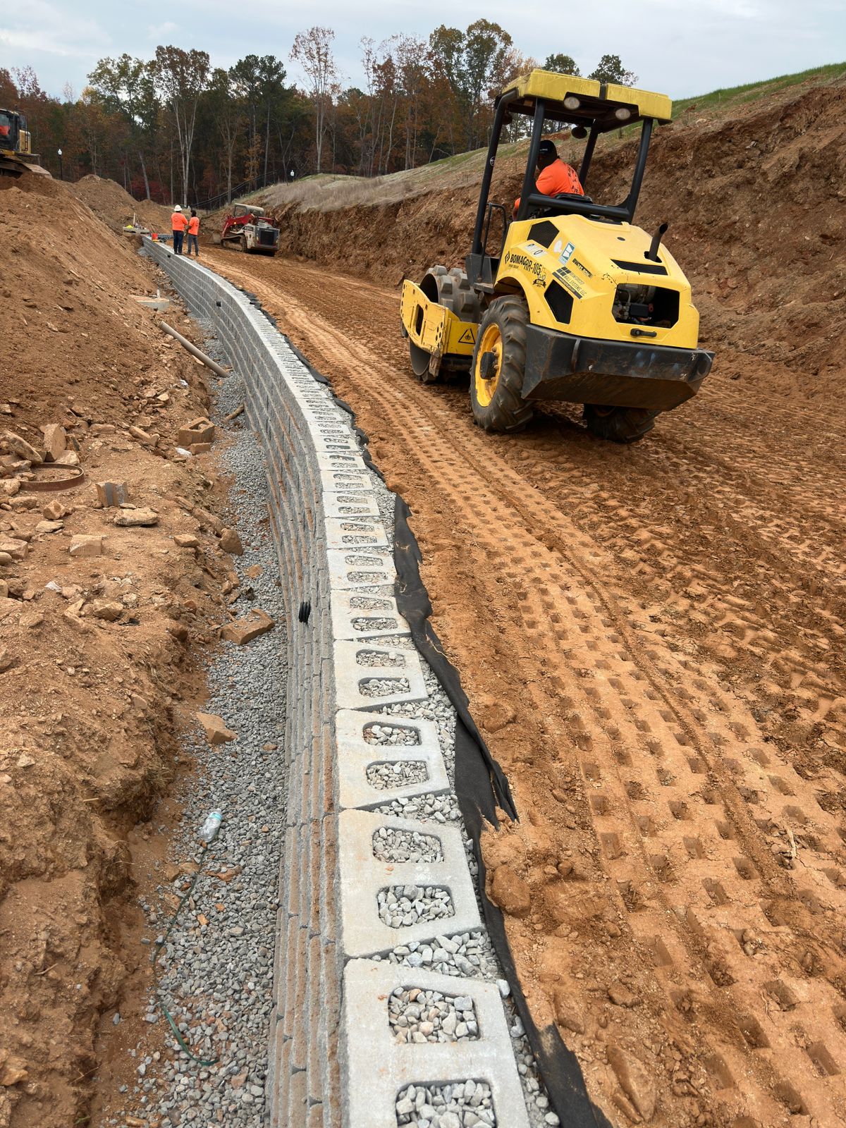 Once the grade was set, the crew placed the aggregate backfill and installed the plastic separation sheet. Backfilling was performed in 6-inch intervals, with the plastic cover positioned between the layers as required. This process was repeated until the full 16-inch lift height was achieved. Compaction was not performed between the 6-inch increments; instead, all compaction was completed after the full 16-inch lift was in place.