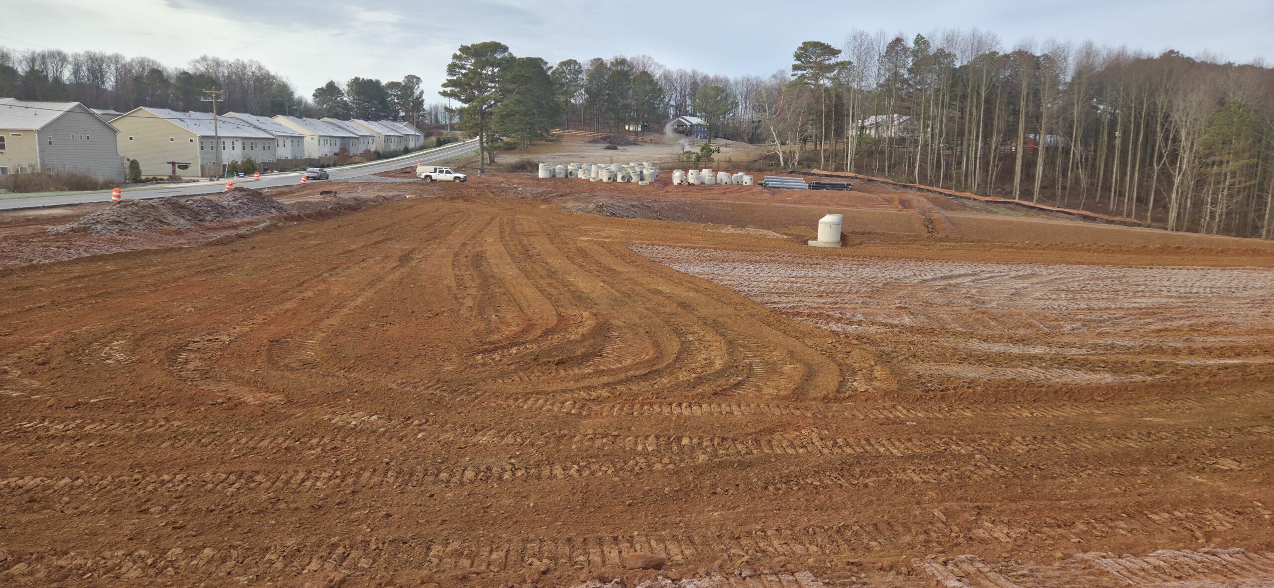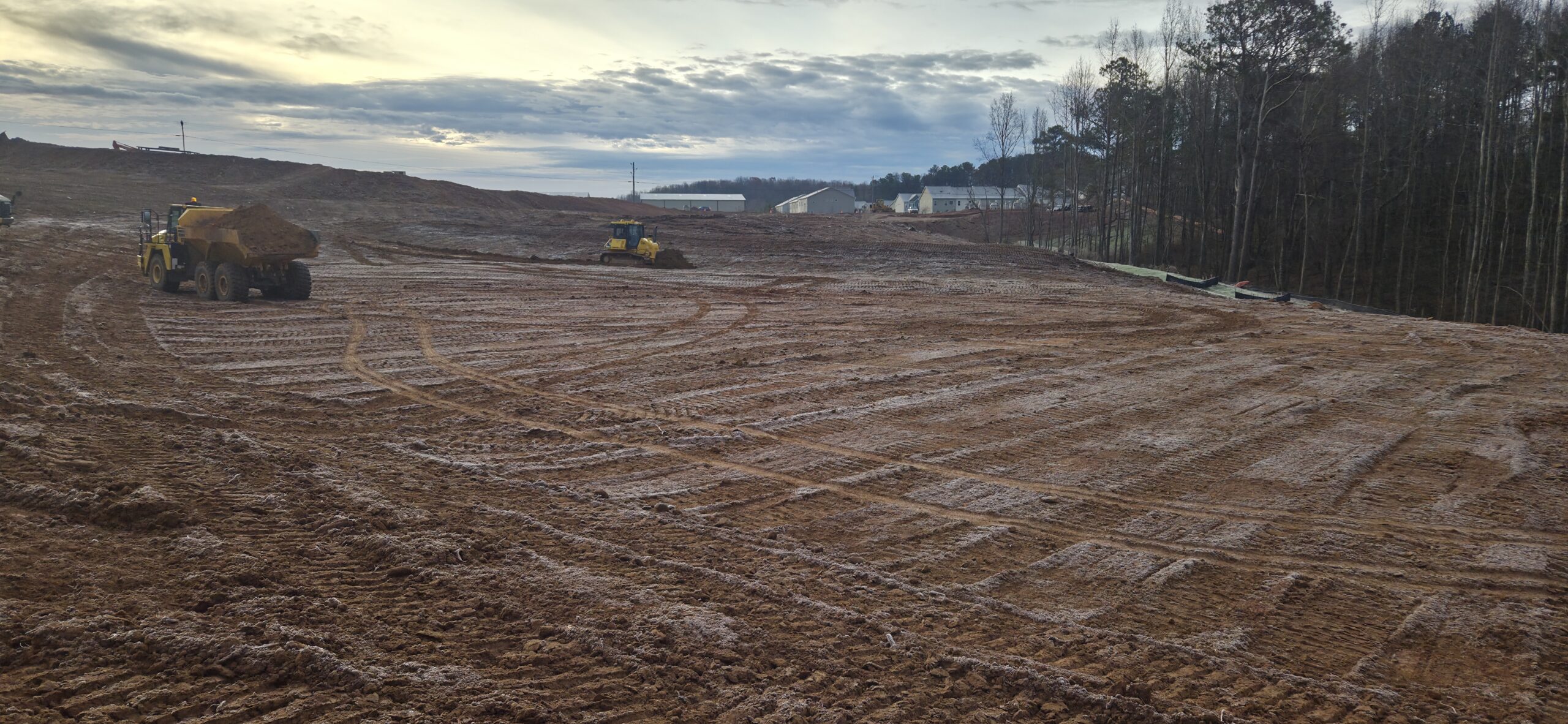 observation/testing of the placement of fill/backfill. Upon arrival to the site, the site appeared to be frozen from low temperatures over the previous night. The contractor spent the morning stripping away any frosted ground before placing fill. As the sun comes out at temperatures rise, the frosted ground turns into mud. The contractor focused their efforts on lots #8 – #13 and #52 – #60 area. after removal of frosted ground, the contractor began placing lifts of approx. 6in to 8in in size and compacted via sheep’s foot roller. Density testing was conducted, and test results were provided to the contractor.