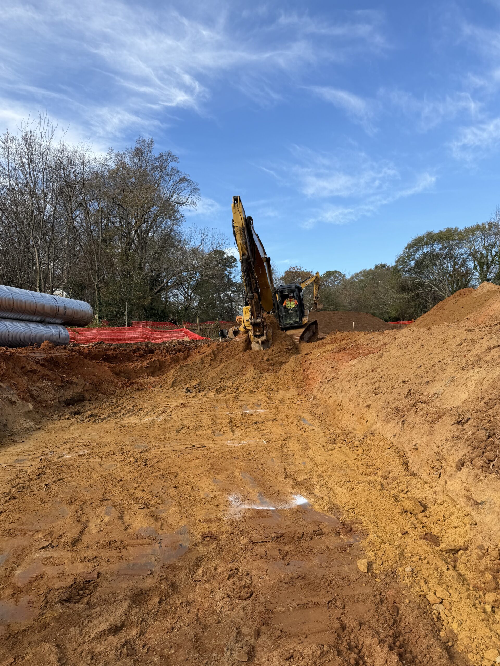 Work began at Pond 2 with the excavation of the stormwater detention trench. The crew excavated the area to an approximate depth of 6–7 feet and a length of 90 lineal feet, following the project design drawings. Excavation was carried out using a CAT hydraulic excavator, and the trench walls and base were shaped to the required lines and grades.