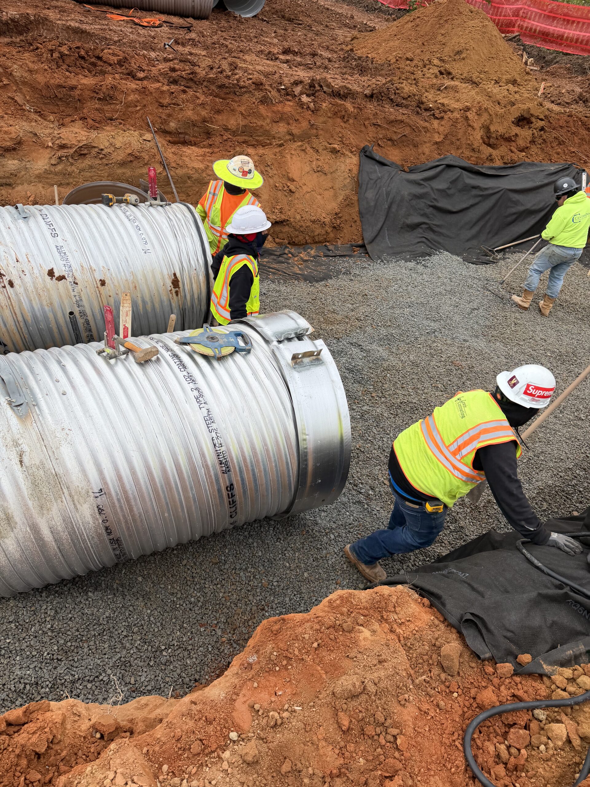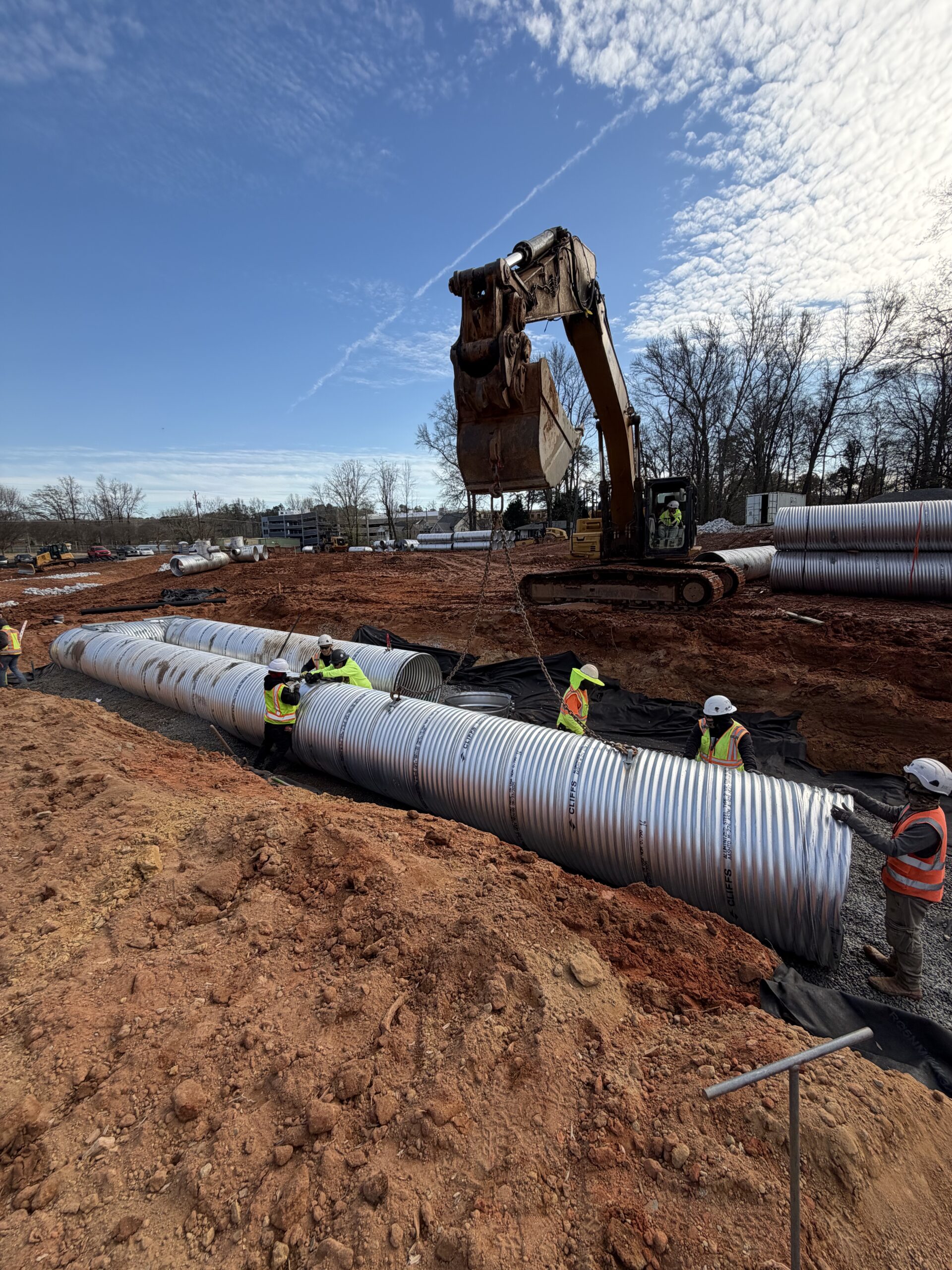 The crew then continued installing the Underground Stormwater Detention System (USDS). Large 36-inch diameter corrugated metal pipes (CMPs), each approximately 20 feet in length, were placed on the stone base.
