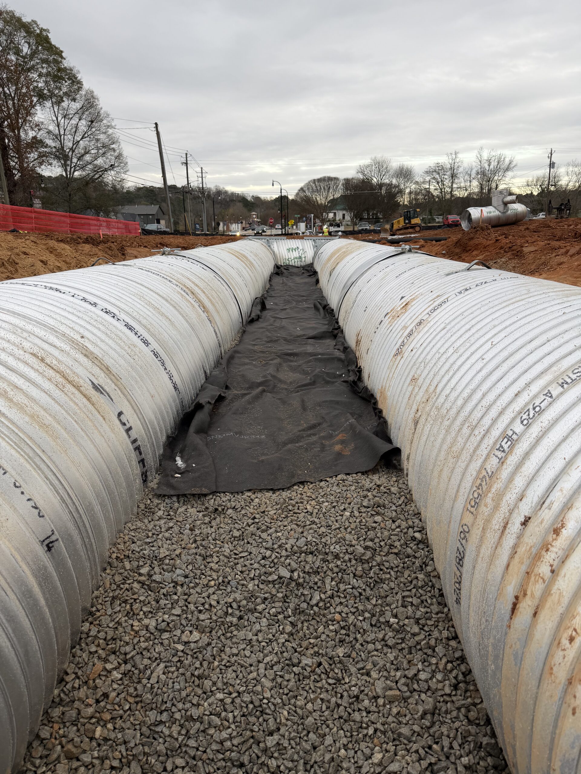 Two parallel detention pipes were installed side-by-side, with an approximately 3-foot gap between them as required for stone coverage and structural spacing. The crew connected CMP sections to achieve a combined installed length of approximately 78 feet during today’s work operations.