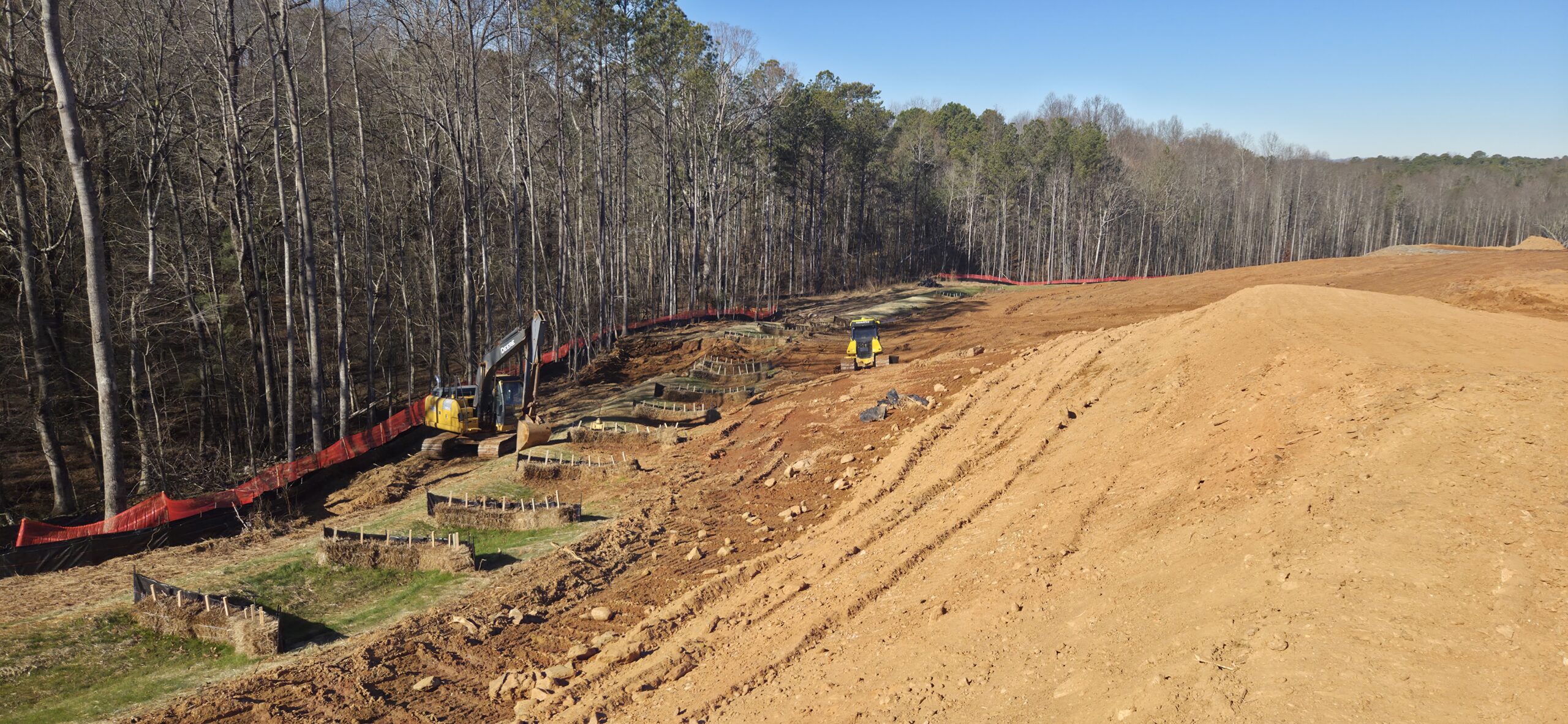 The pipe crew is installing storm line in a greenspace located by the front entrance of the site.