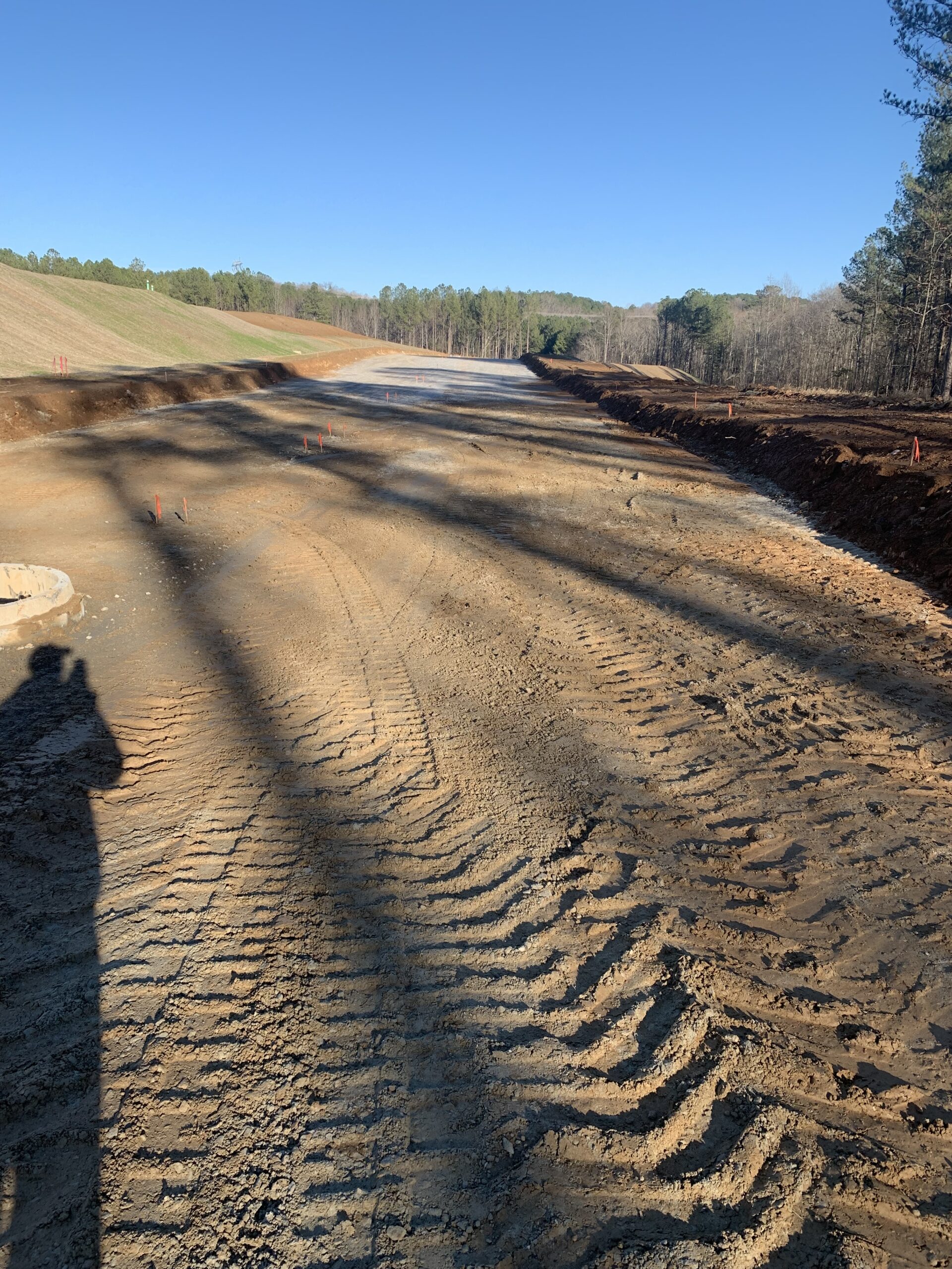 The pipe contractor was on site continuing to install 30″ RCP storm line between structures D9 and D10. Also continued 30″ from D10 installing two joints of pipe. All pipe was bedded on residual soils or rock.