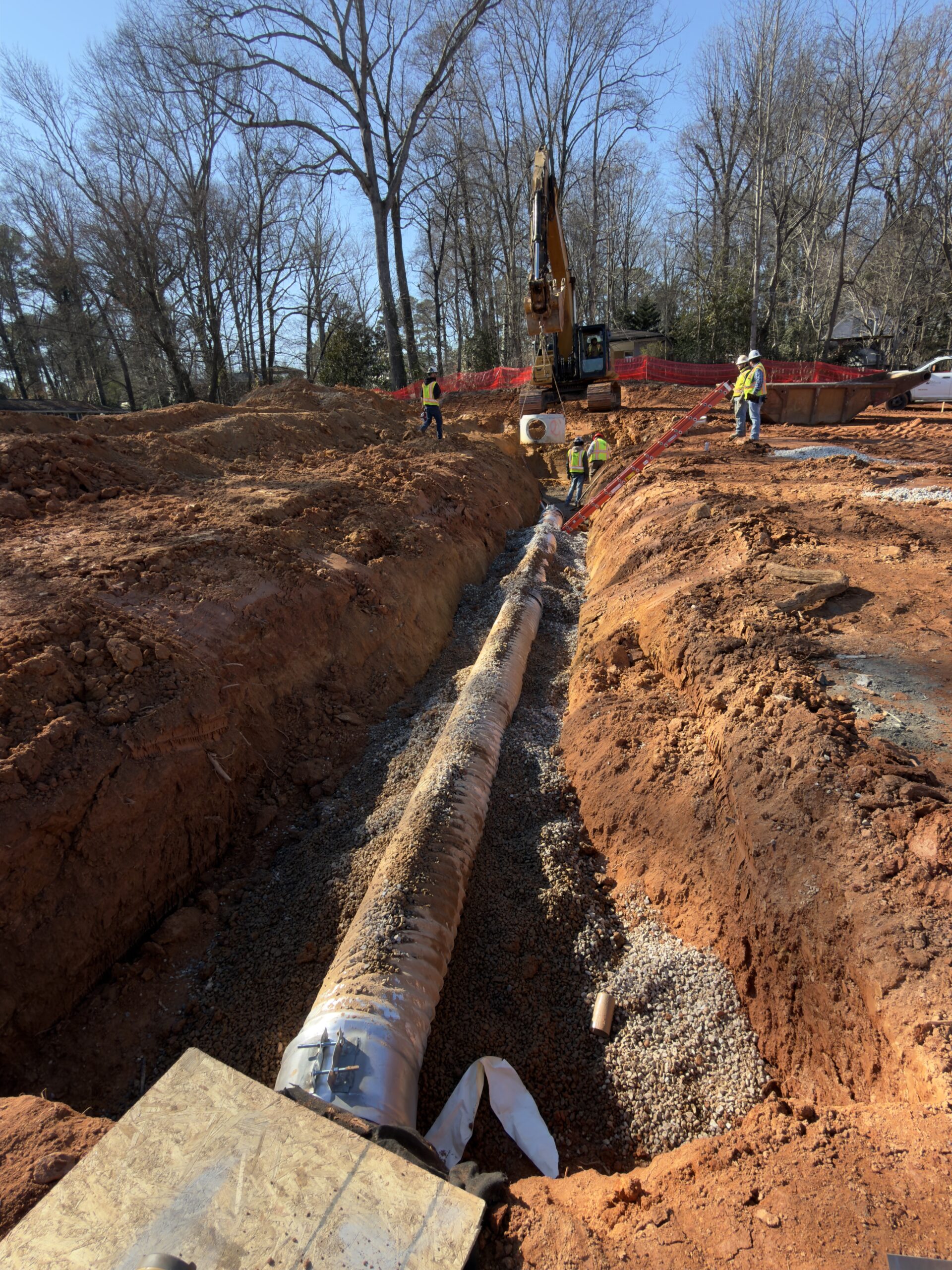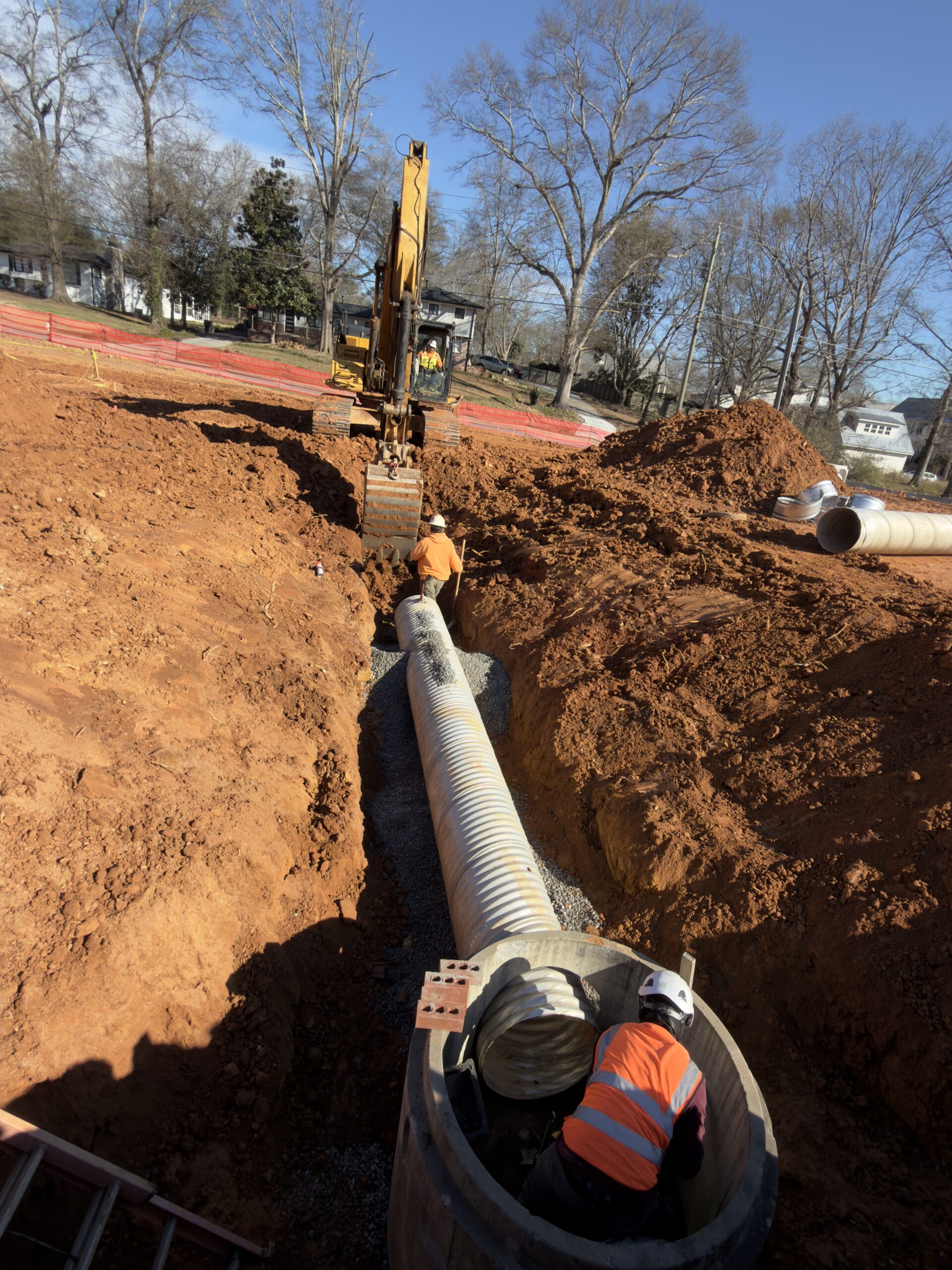 Crew 1 began work at locations B2–B3. The crew excavated the soil to the required depth and dimensions to accommodate the proposed manhole and storm pipe installation. A manhole was installed at B2 and connected to the existing CMP by inserting the pipe into the inlet of the manhole and aligning it to the required grade. From the manhole outlet, storm pipe installation continued in the north direction for approximately 39 feet using 24-inch diameter pipe. All pipe and manhole connections were sealed with concrete. Upon completion of the pipe installation, backfill material was placed around the manhole and pipe in lifts, and each lift was compacted.