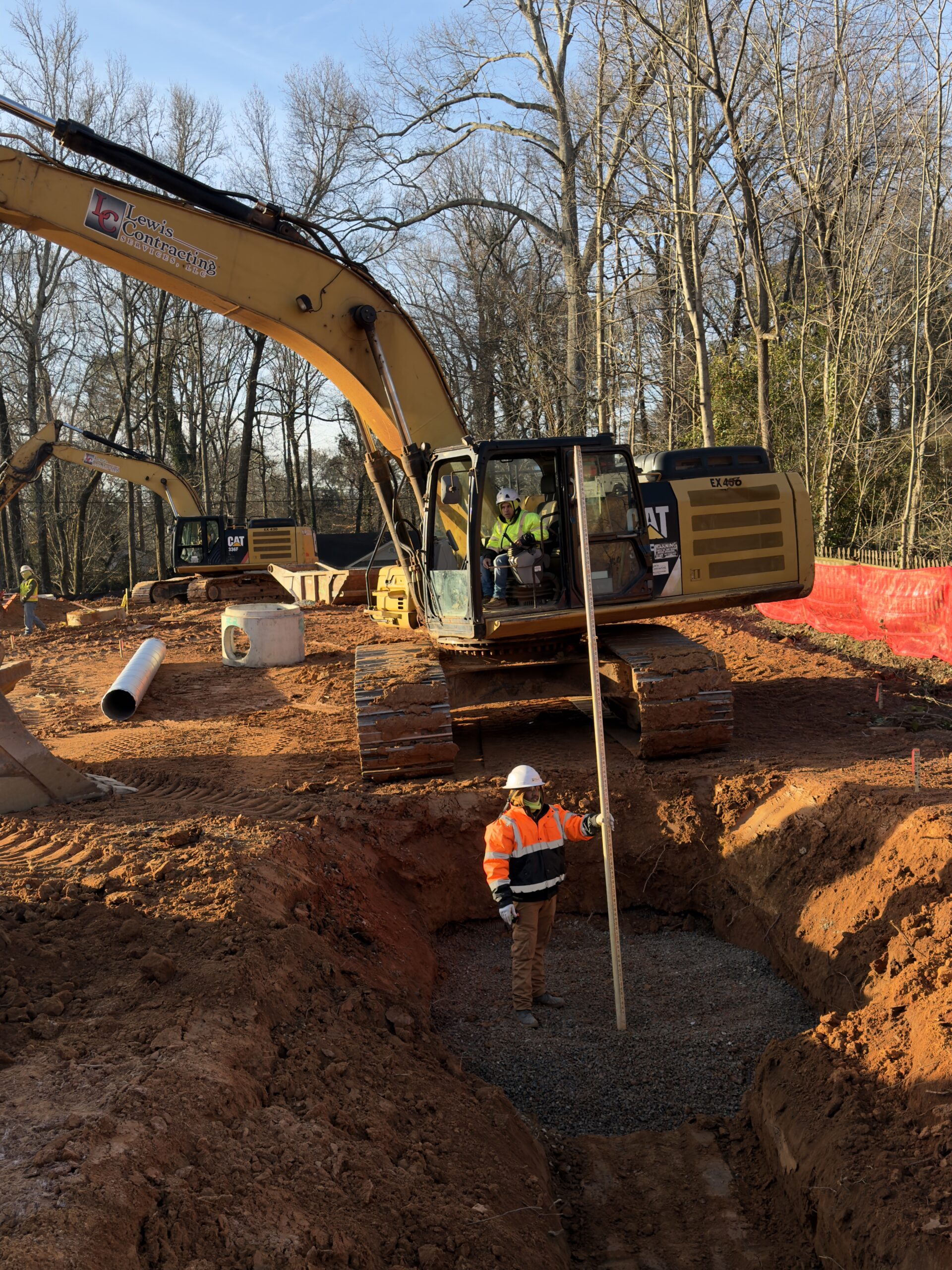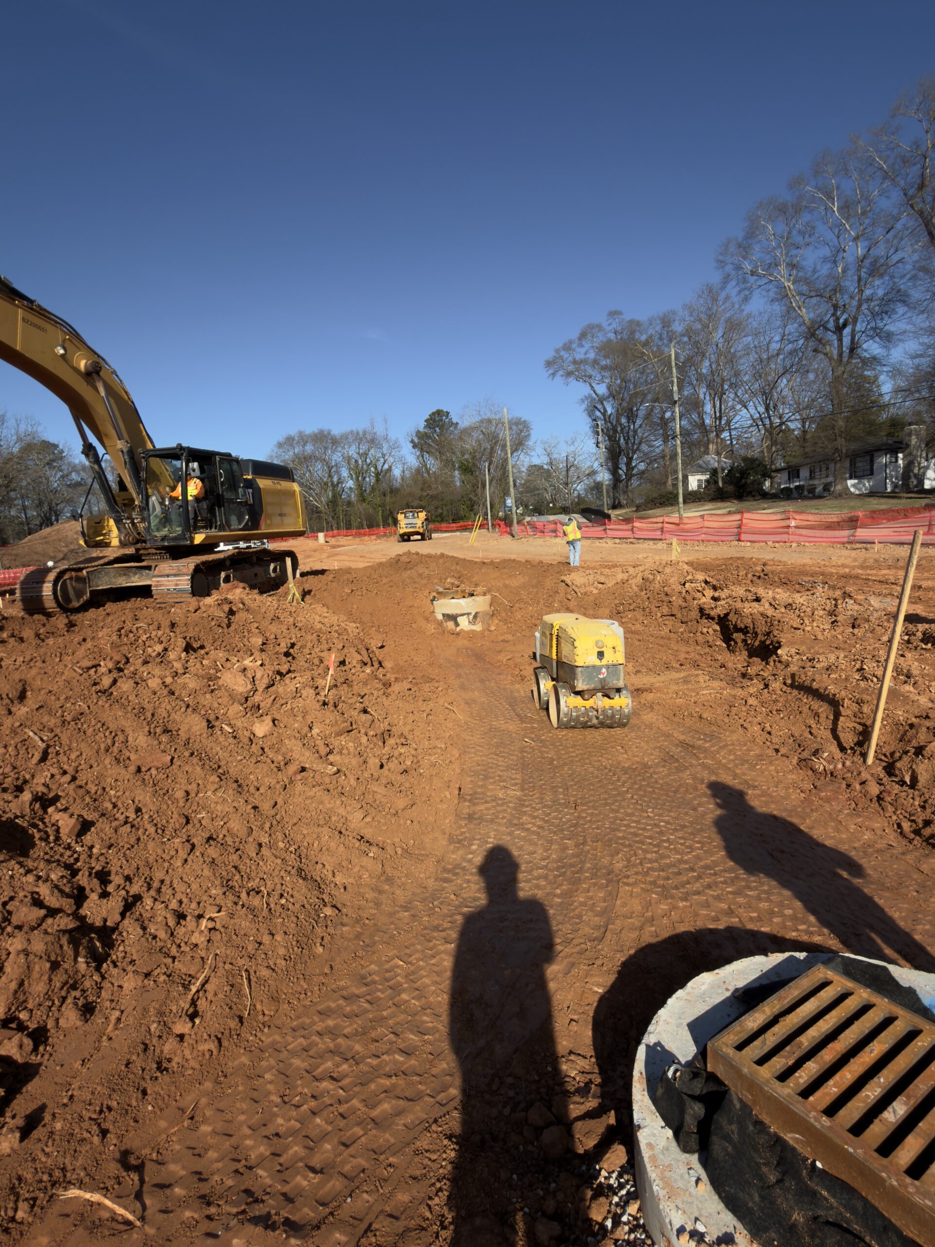 Crew 1 performed backfilling operations at locations B3–B5. Backfill material was placed around the installed manholes and storm pipes in lifts of approximately 6–8 inches. Each lift was compacted using a drum roller for the general backfill and a jumping jack plate compactor around the manholes and confined areas.