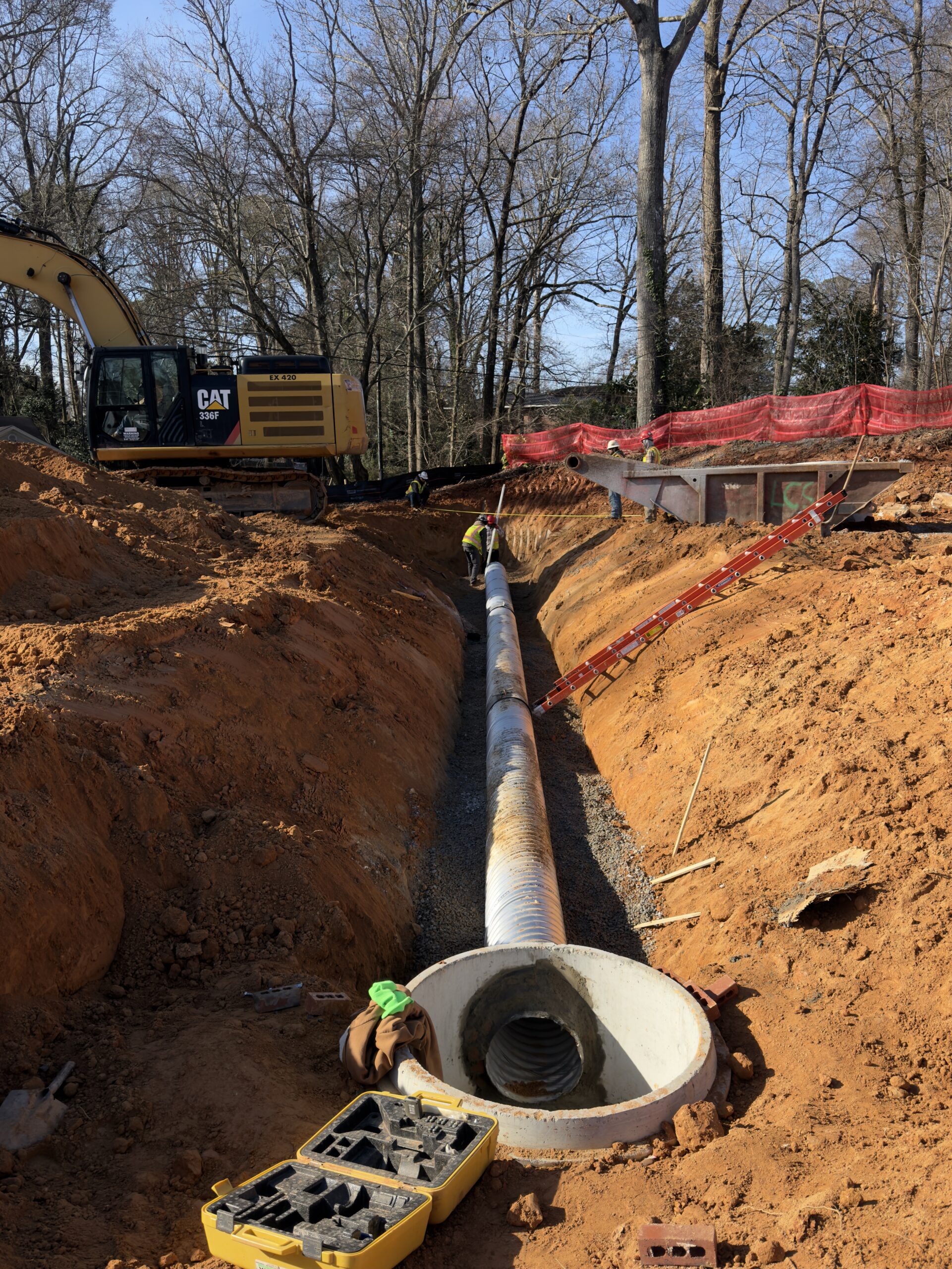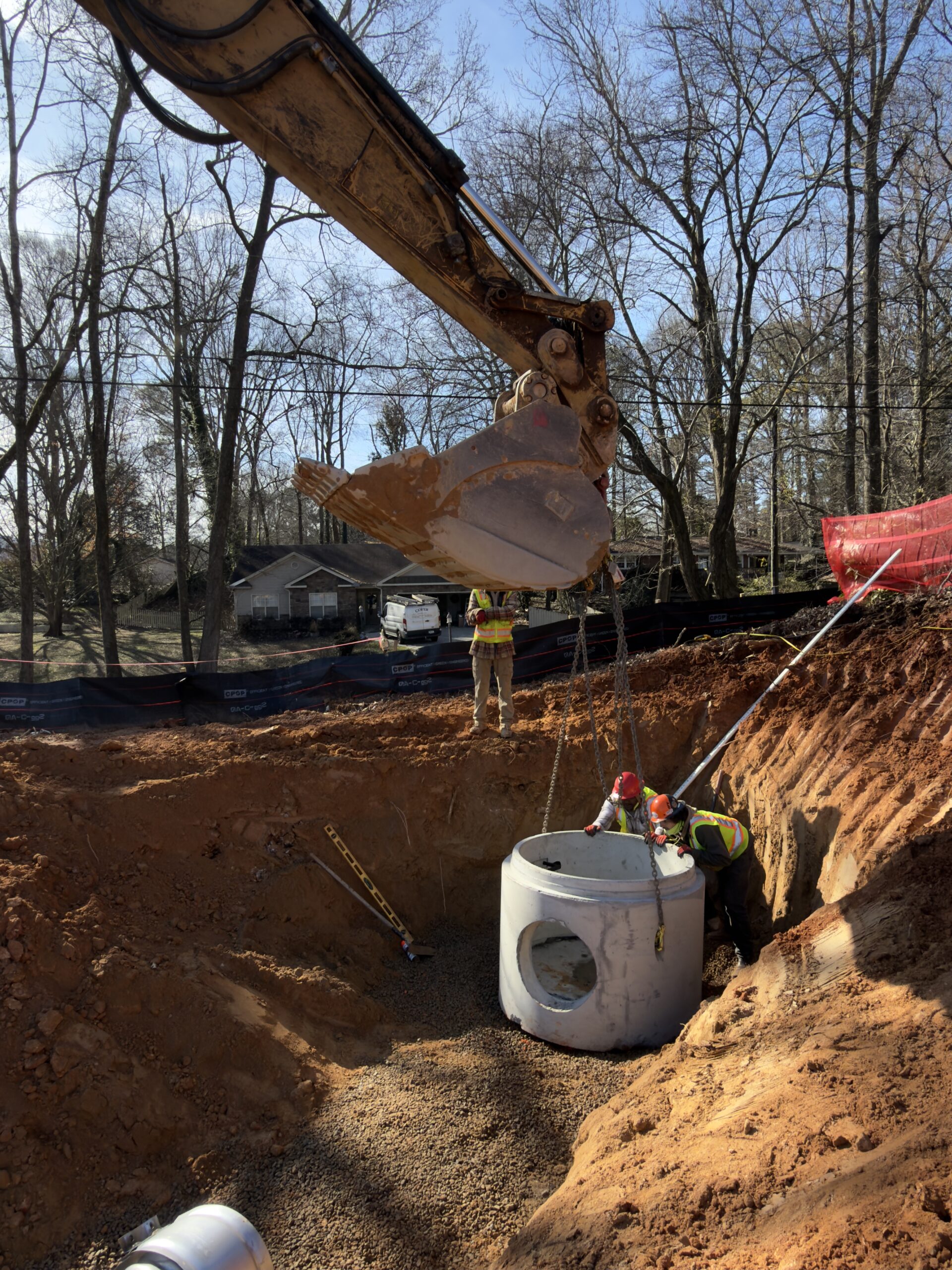 At the same time, Crew 2 began work between points C1 and B6. The crew excavated the soil to the required depth and leveled the subgrade to prepare for pipe installation. Gravel bedding was then placed and graded. Corrugated metal pipes (CMP) were installed from B6 toward C1 and aligned to the specified grade. At C1, a manhole was installed and connected to the incoming pipe. The gap between the manhole and the pipe was sealed with concrete. Following installation, backfill material was placed around the manhole and pipe in lifts of approximately 6–8 inches and compacted.