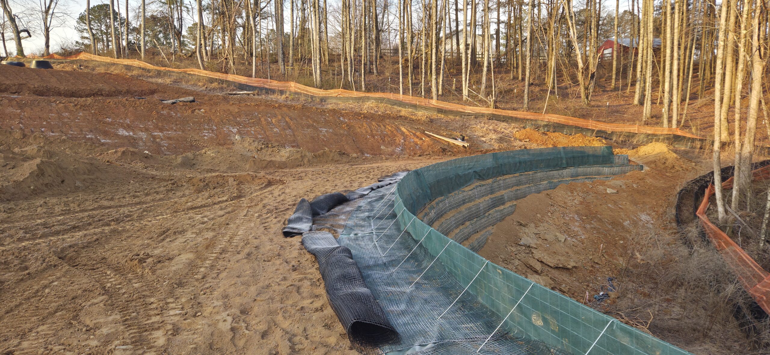 The wall crew continued installation of retaining wall #5. Due to their equipment breaking down, the grading crew has been helping the wall crew install the wall. The wall crew is spreading soil in lifts of approximately 8 inches in thickness, and the grading crew has been using their vibrating sheep-foot roller to compact the lifts. Density testing was performed, and test results were provided to the contractor.