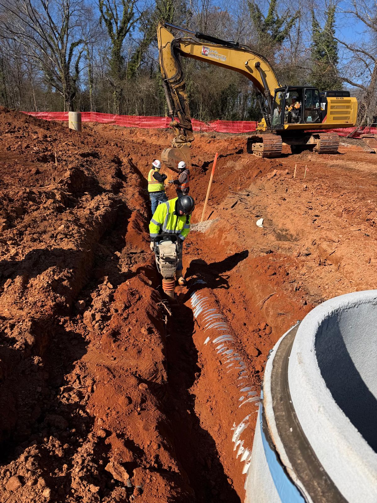 Crew 2 began backfilling operations from point E1 toward Detention Pond 1. A single lift of backfill material was placed that exceeded the recommended 6-to-8-inch lift thickness. Compaction testing was performed and results did not meet the specified density requirements. The failure was attributed to excessive lift thickness and high moisture content in the soil. The area will require reworking by scarifying and aerating the material, reducing lift thickness, allowing the soil to dry, and re-compacting to achieve the required density before additional backfill is placed.
