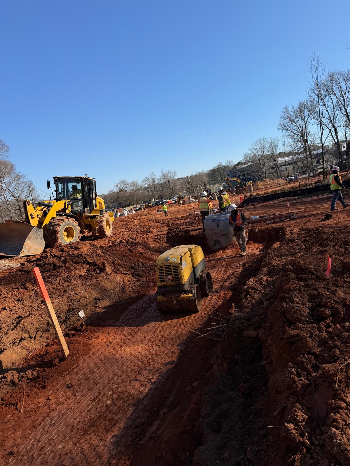 Crew 1 began backfilling operations at locations B8–B9. Backfill material was placed in lifts of approximately 6–8 inches. The first two lifts were compacted using a jumping-jack compactor. The next two lifts were compacted with a double-drum roller. The fifth lift was compacted using a sheep-foot roller.