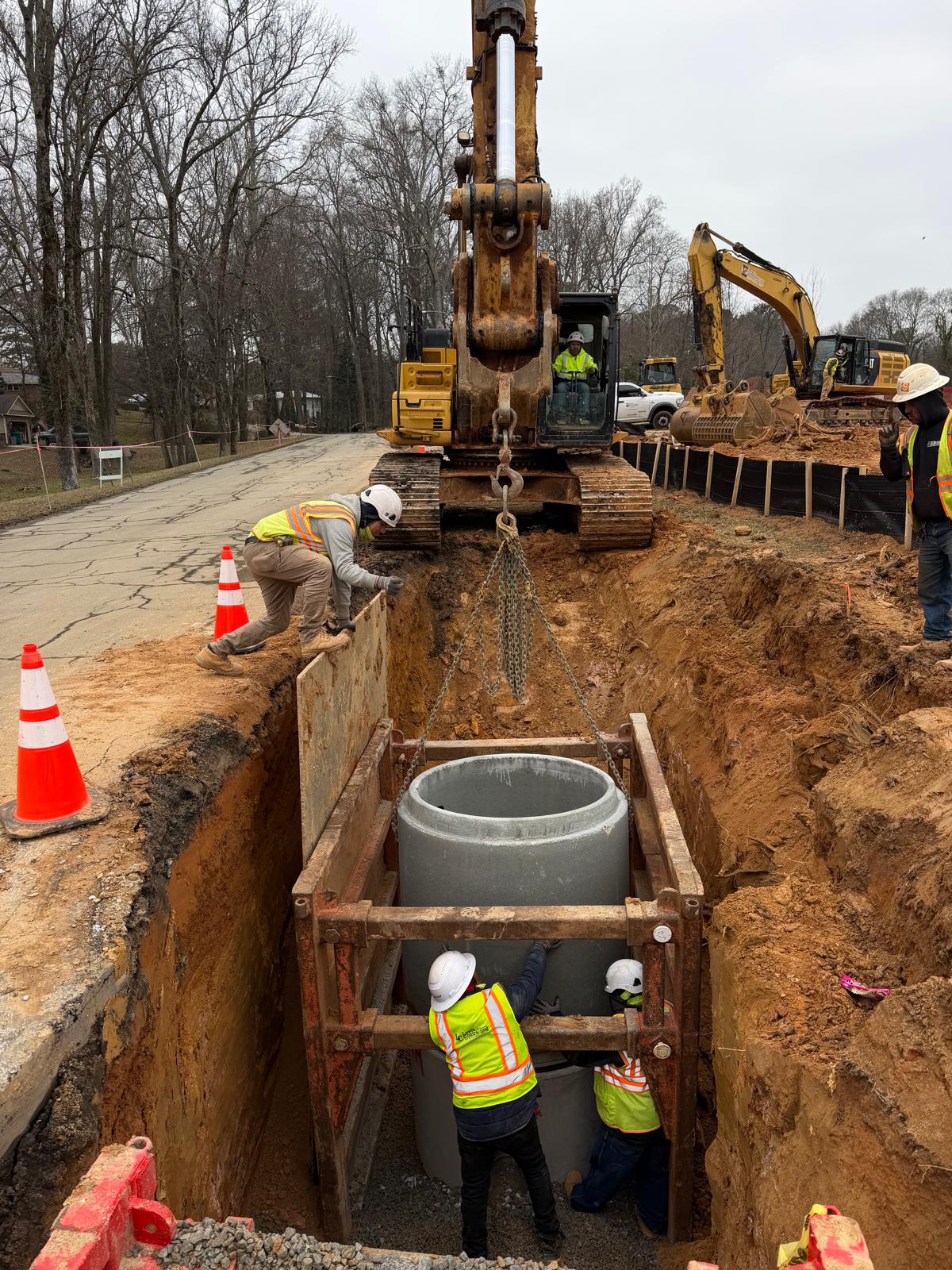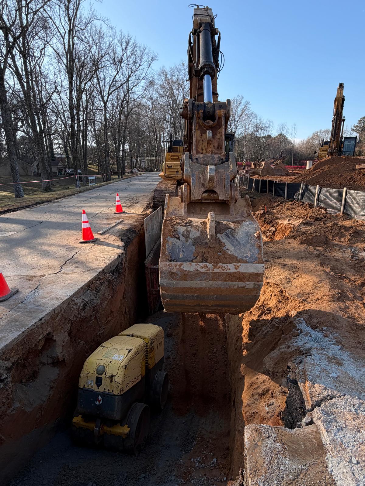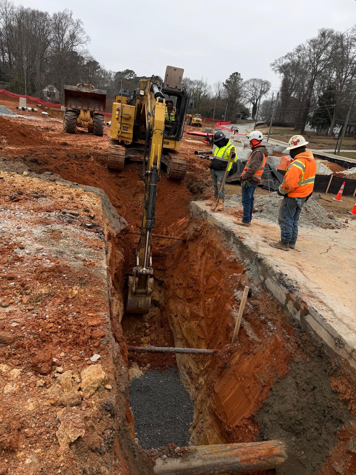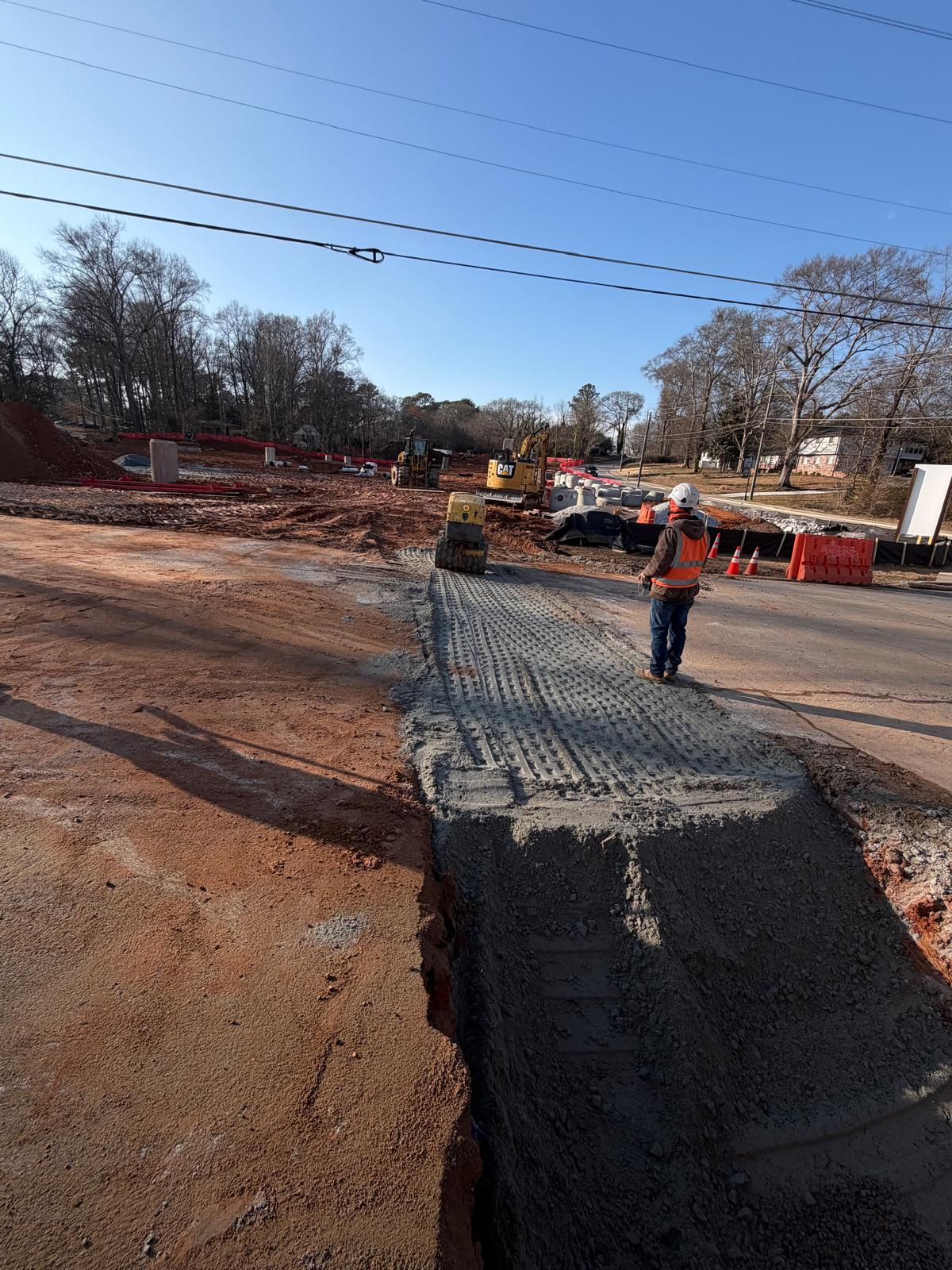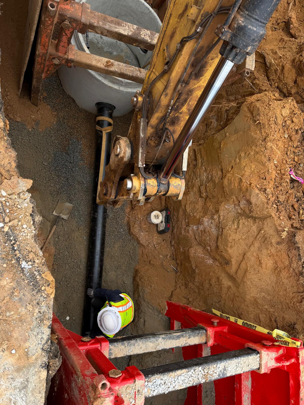 Crew 2 began work between existing manholes V0 and V1. The crew installed an 8-inch ductile iron pipe extending toward V1 for a total length of approximately 57 feet. Following installation, backfill operations were performed using suitable soil material placed in controlled lifts of approximately 6–8 inches. Each lift was compacted using a double-drum roller.