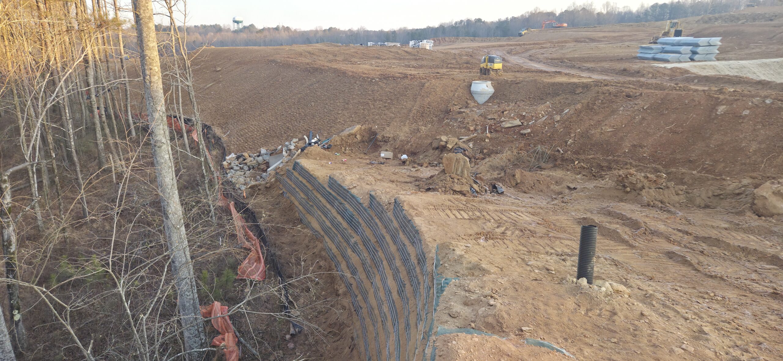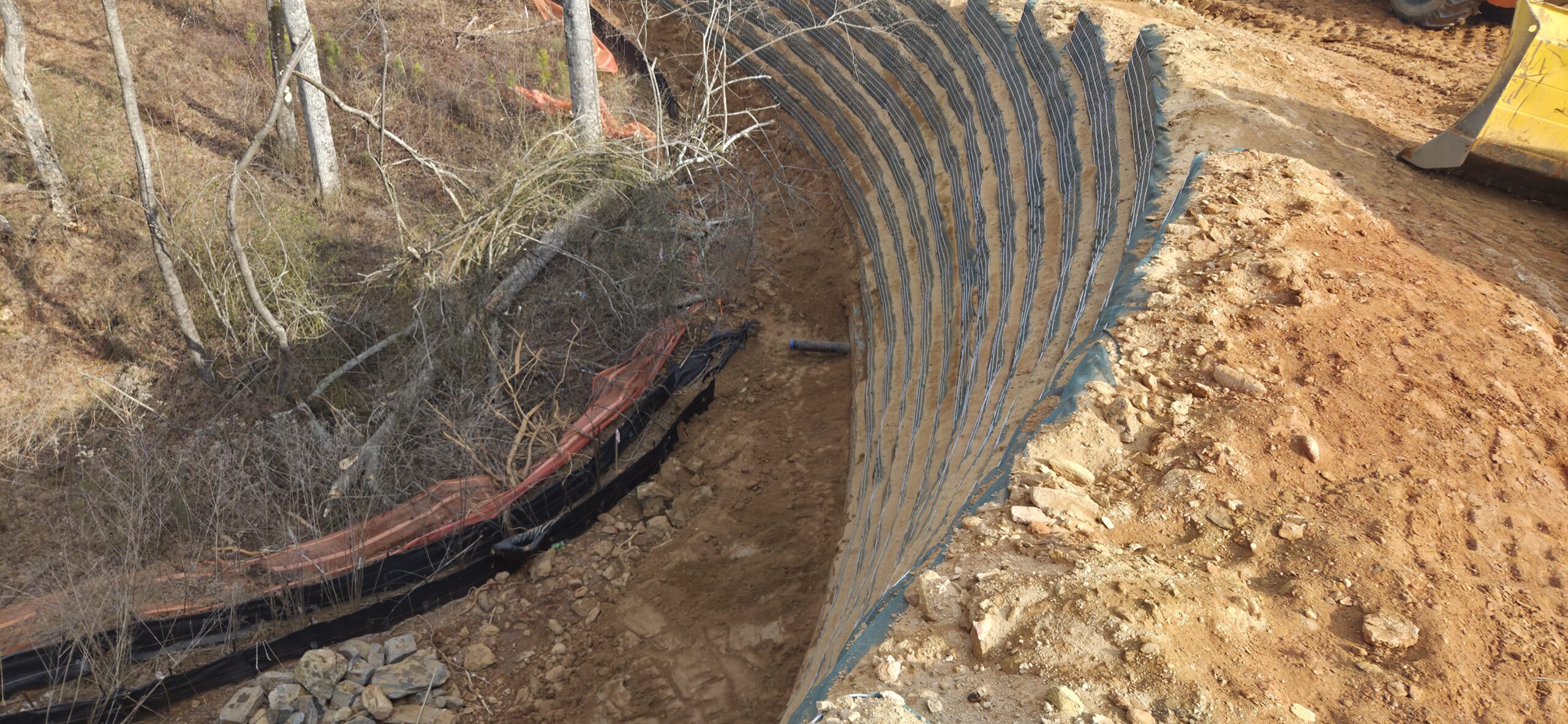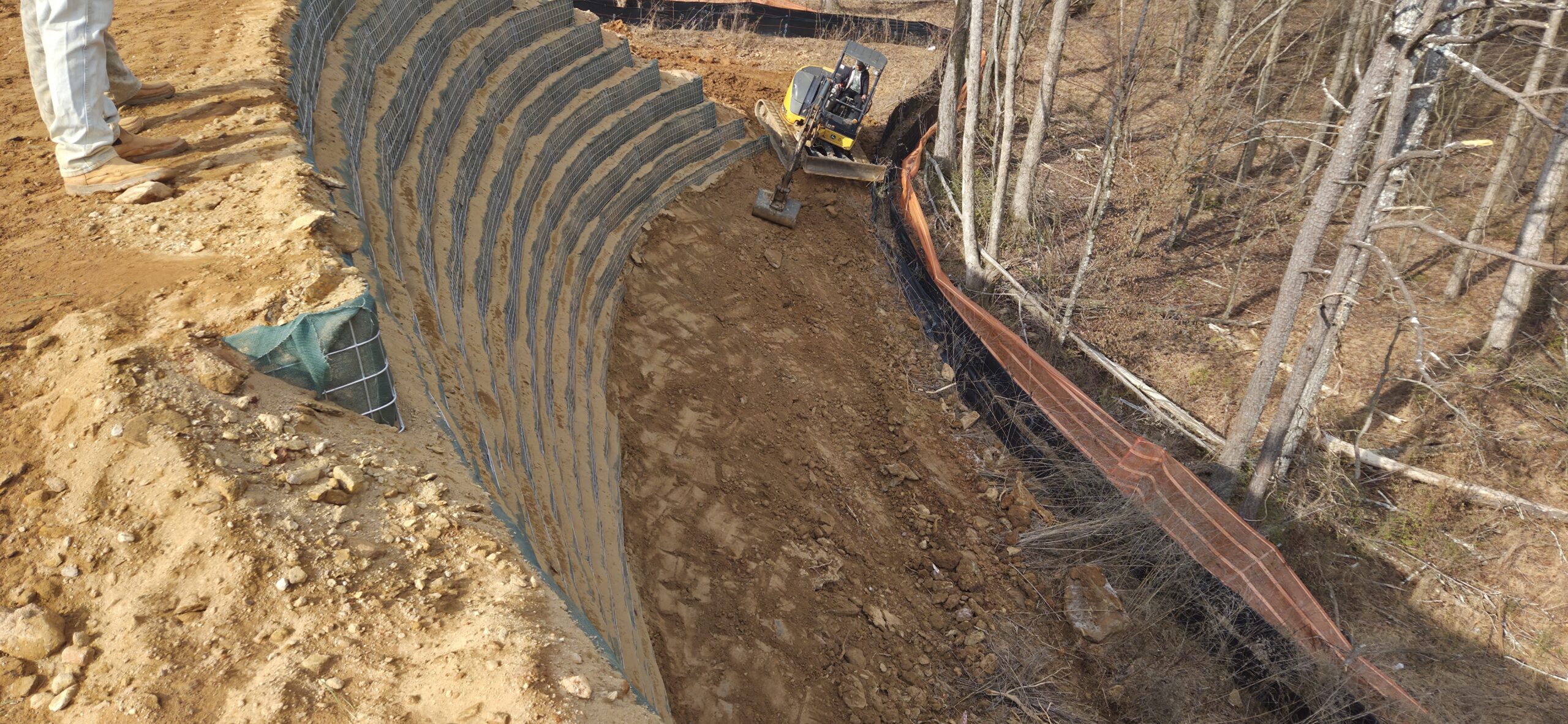 The wall crew showed up to clean up loose dirt around the wall (as requested by the grading contractor). The wall crew threw a large amount of soil/large rocks over the wall during the installation of retaining wall #5, and it has clogged up the silt fence along the property line. The wall crew spread the piled-up soil and compacted it with the excavator’s bucket. This area will be spread with grass to help with erosion control.