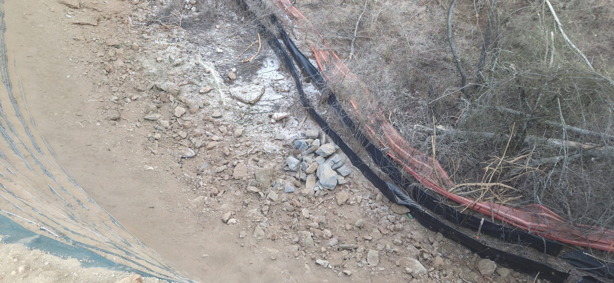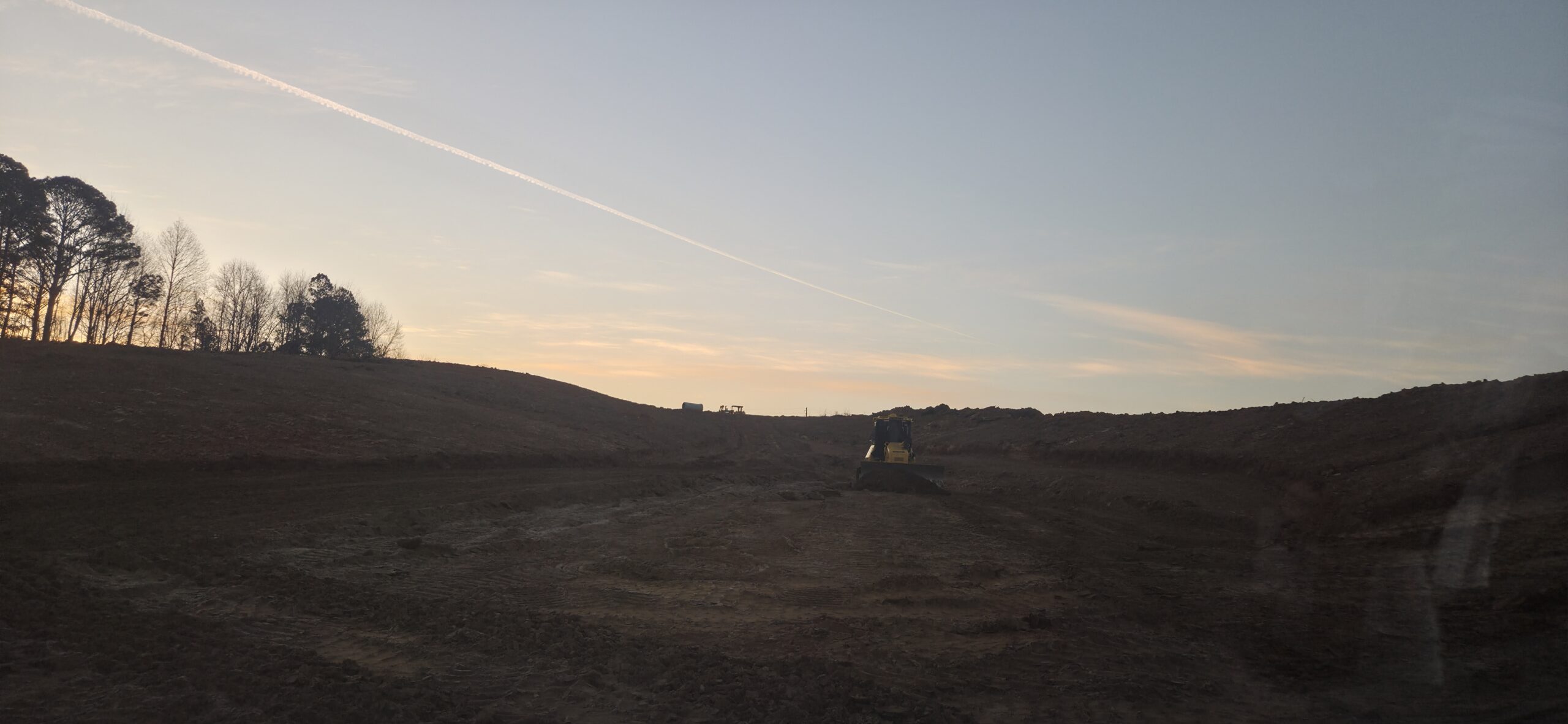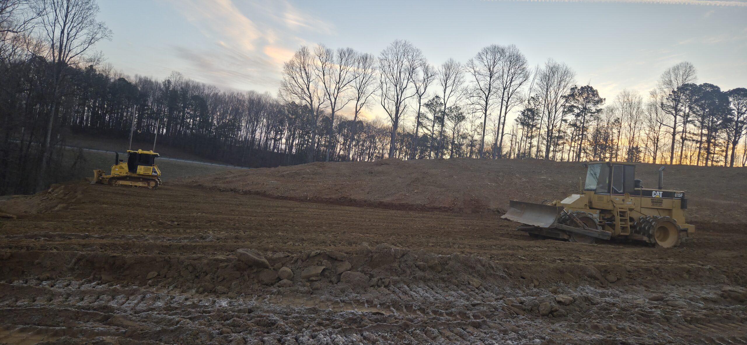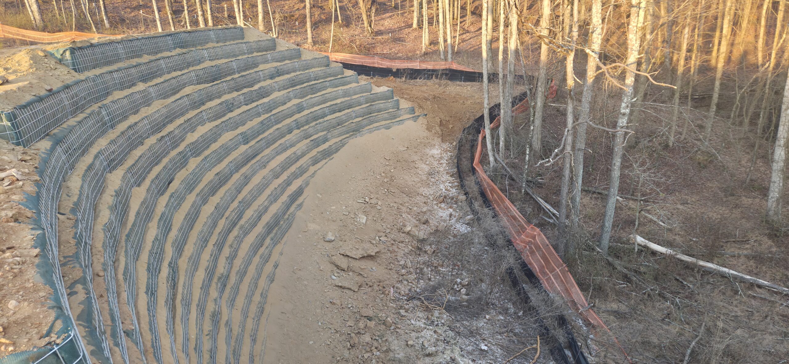 The wall crew showed up to clean up loose dirt around the wall (as requested by the grading contractor). The wall crew threw a large amount of soil/large rocks over the wall during the installation of retaining wall #5, and it has clogged up the silt fence along the property line. The wall crew spread the piled-up soil and compacted it with the excavator’s bucket. This area will be spread with grass to help with erosion control.