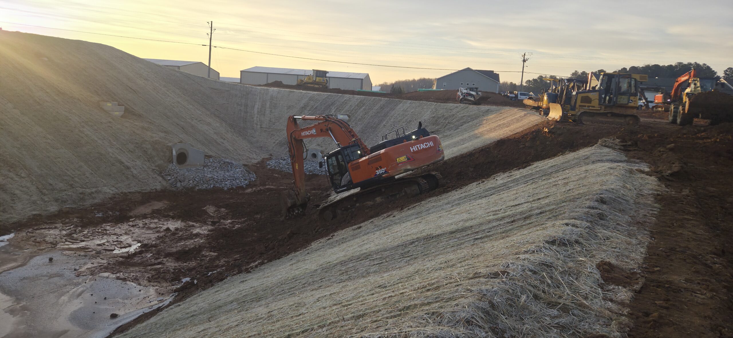 The pipe crew de-mucked the front detention pond and stockpiled the mud/topsoil to be placed in greenspace areas at a later time. Riprap was placed around the OCS/drainage structures located in the pond. The pipe crew then began installing sewer line SSMH1.5 to SSMH3.0. This area was density tested and test results were provided to the contractor.