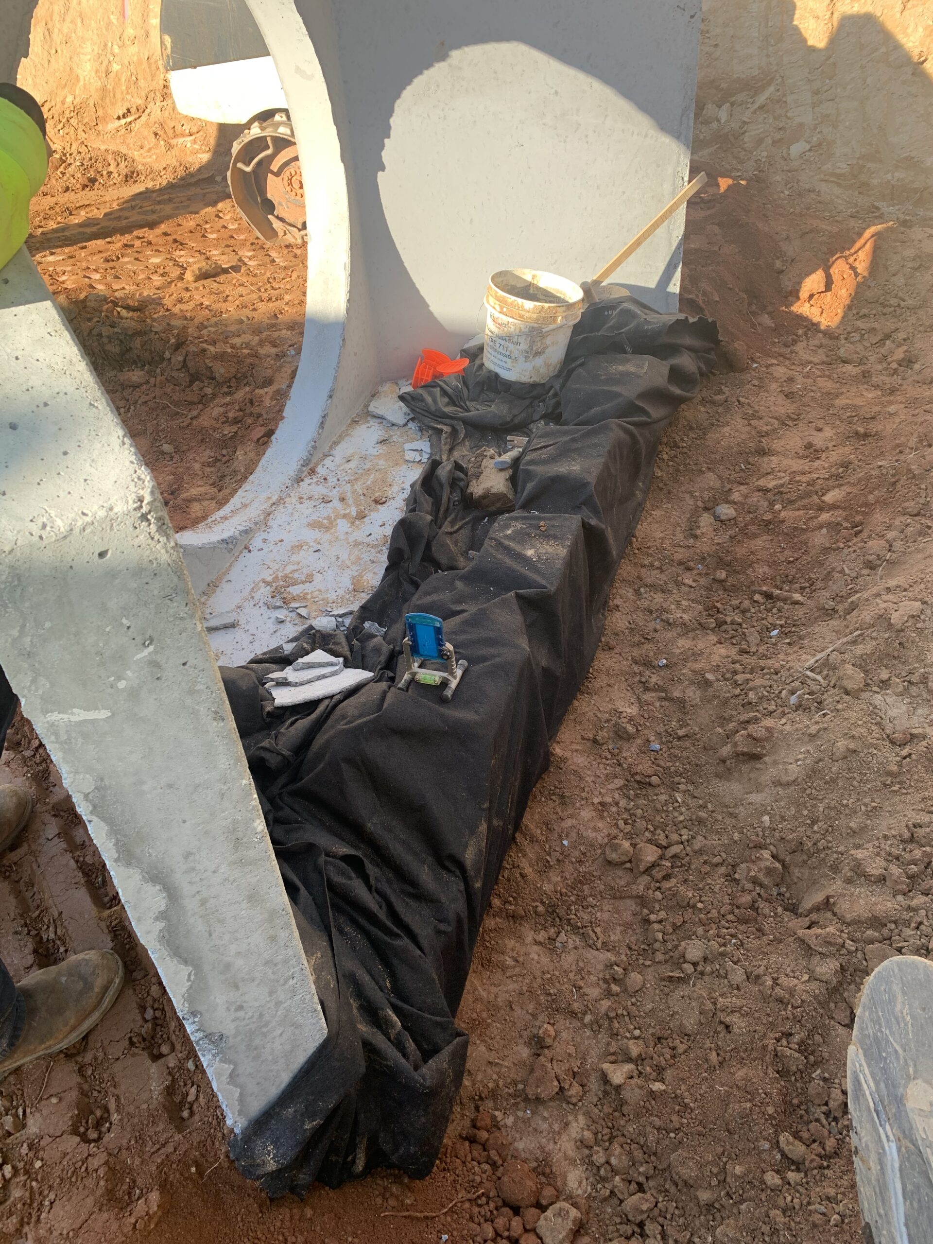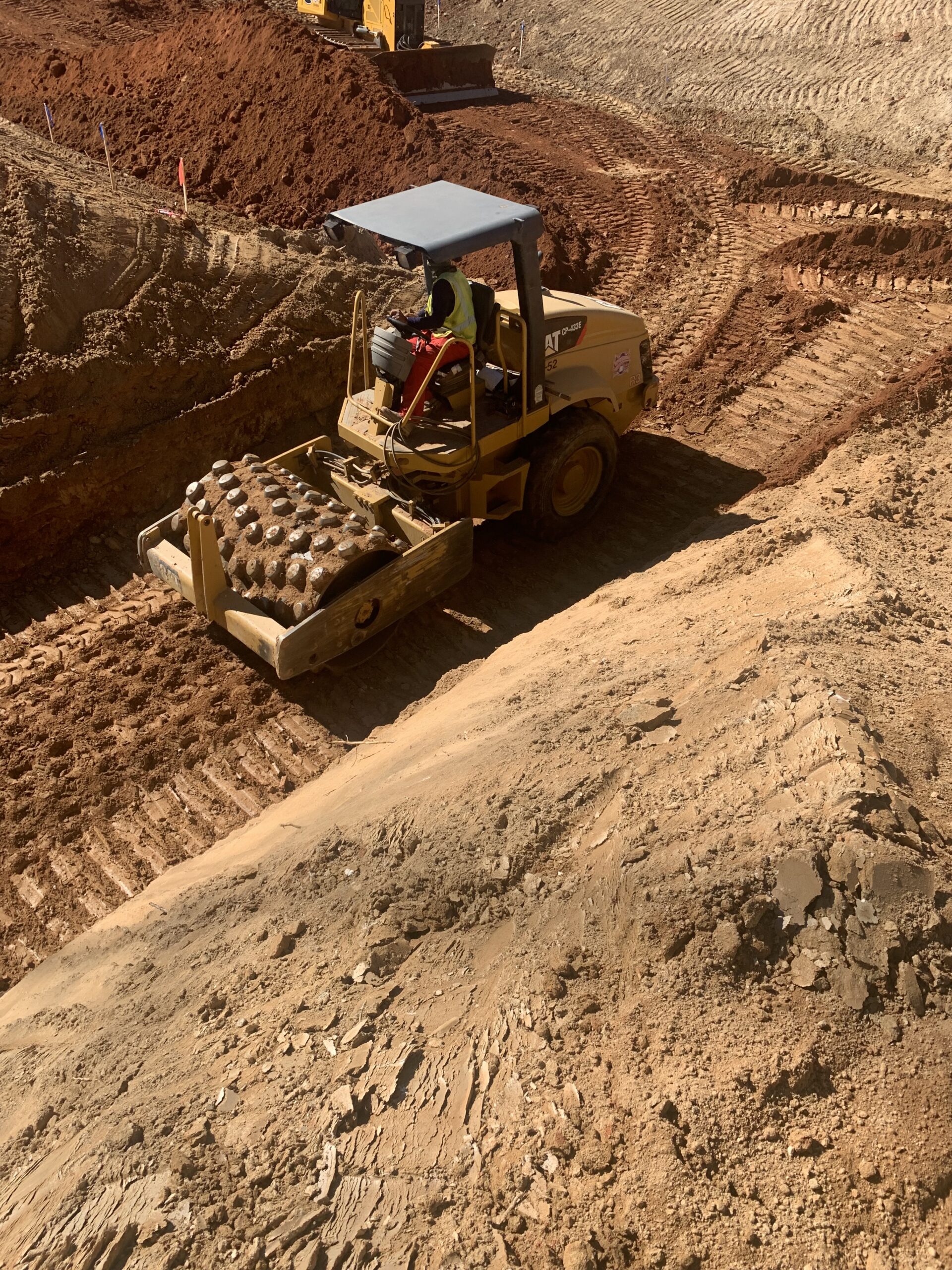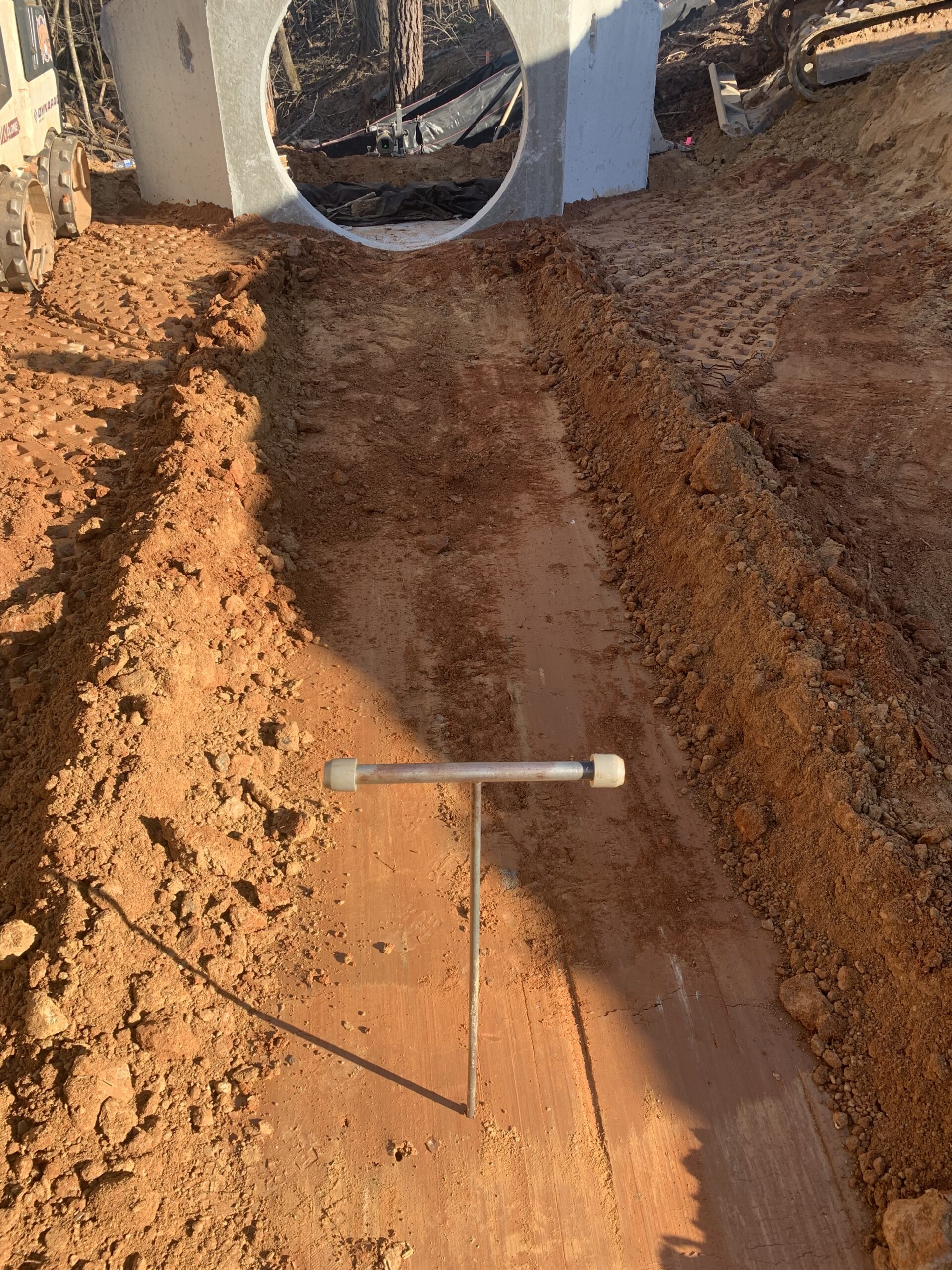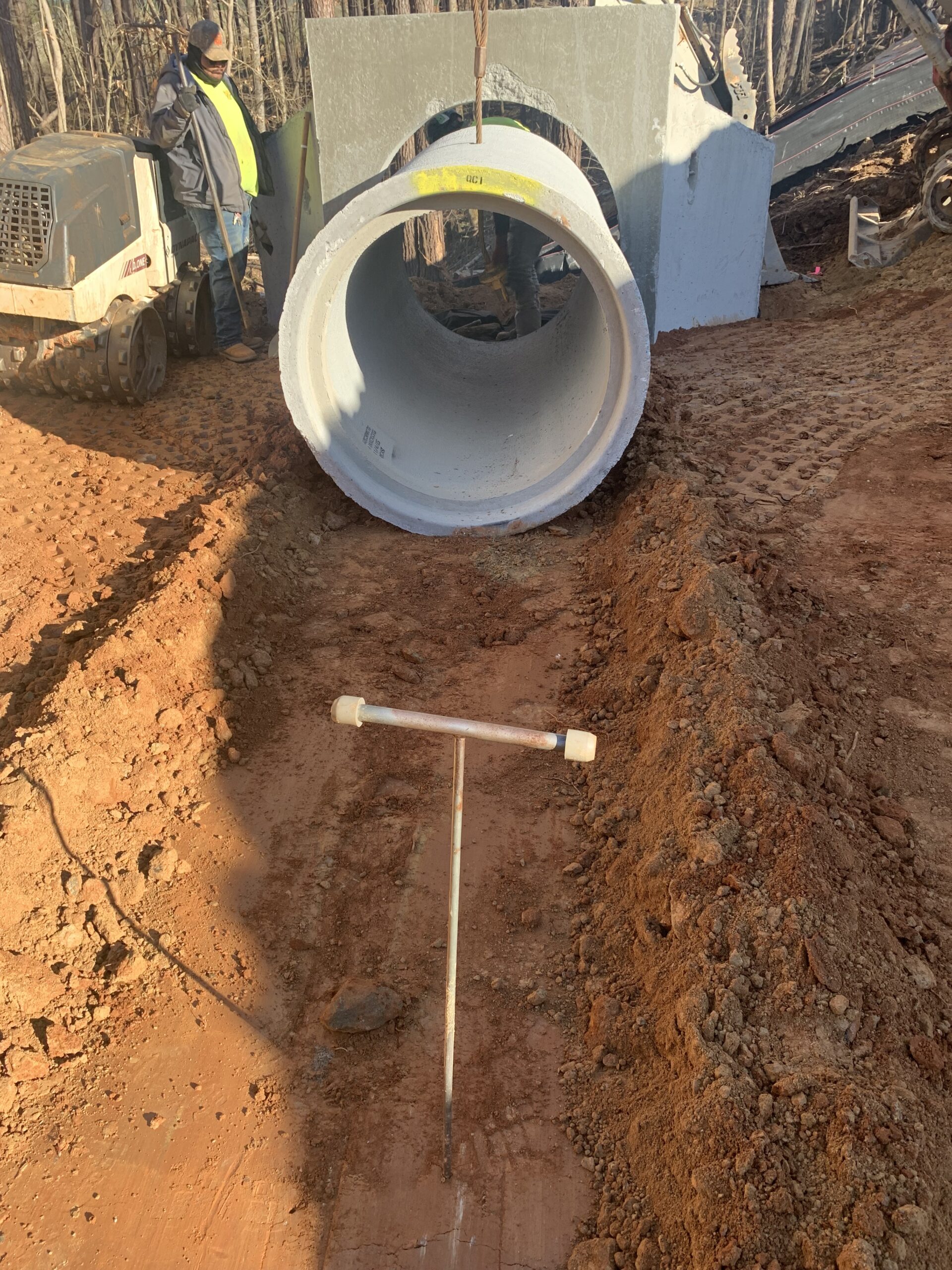 On the above date our representative was on site to observe the pipe contractor (Savanna) begin excavating to install a 48″ RCP outlet pipe between the OCS structure and headwall #3. As recommended, the contractor undercut existing sandy silt soils to replace with clay-based soils. The undercut was extended -2′ beneath bottom of design elevation for the pipe into residual materials. The undercut soils were replaced with suitable compacted clay base soils. The contractor set headwall structure #3 placed on filter fabric and begin laying a 48″ RCP outlet line from the headwall toward the OCS structure in which the pipe was bedded on suitable compacted clay base soils.
