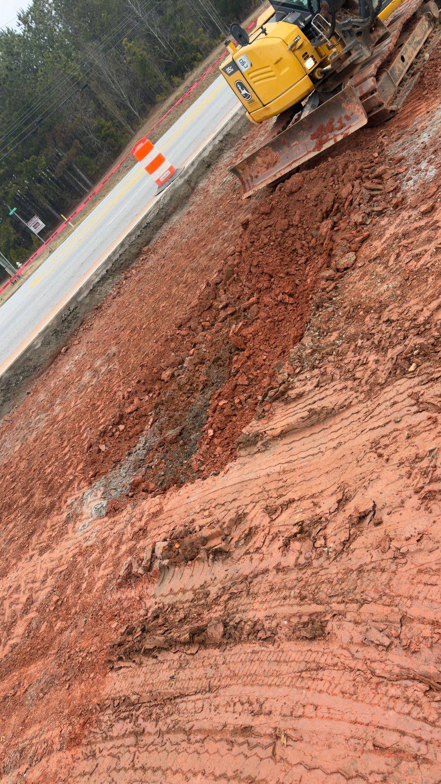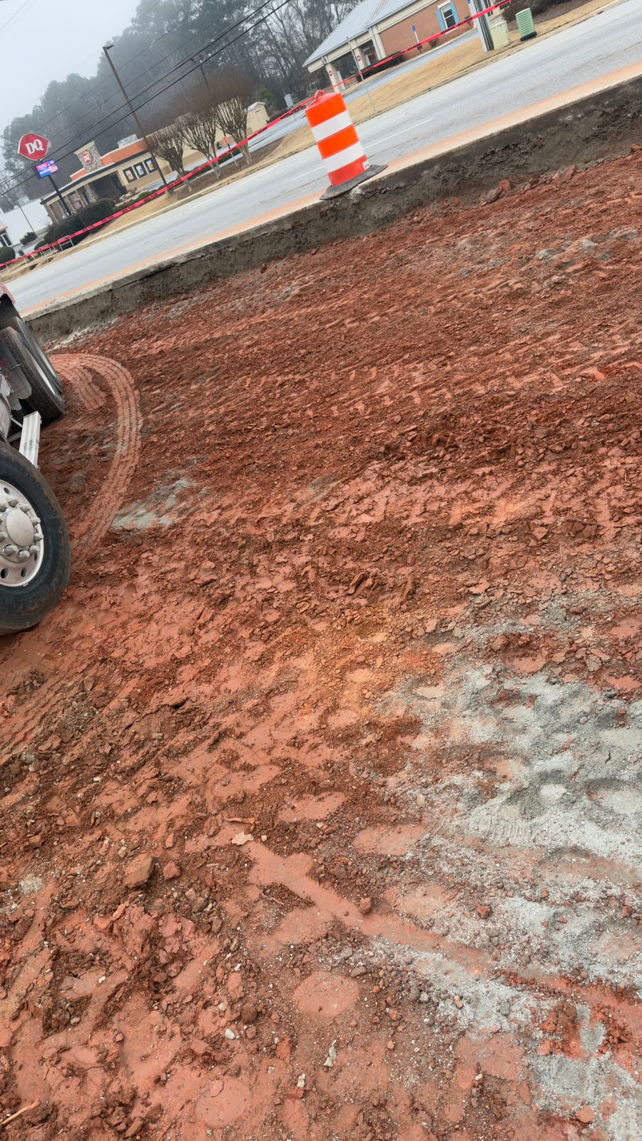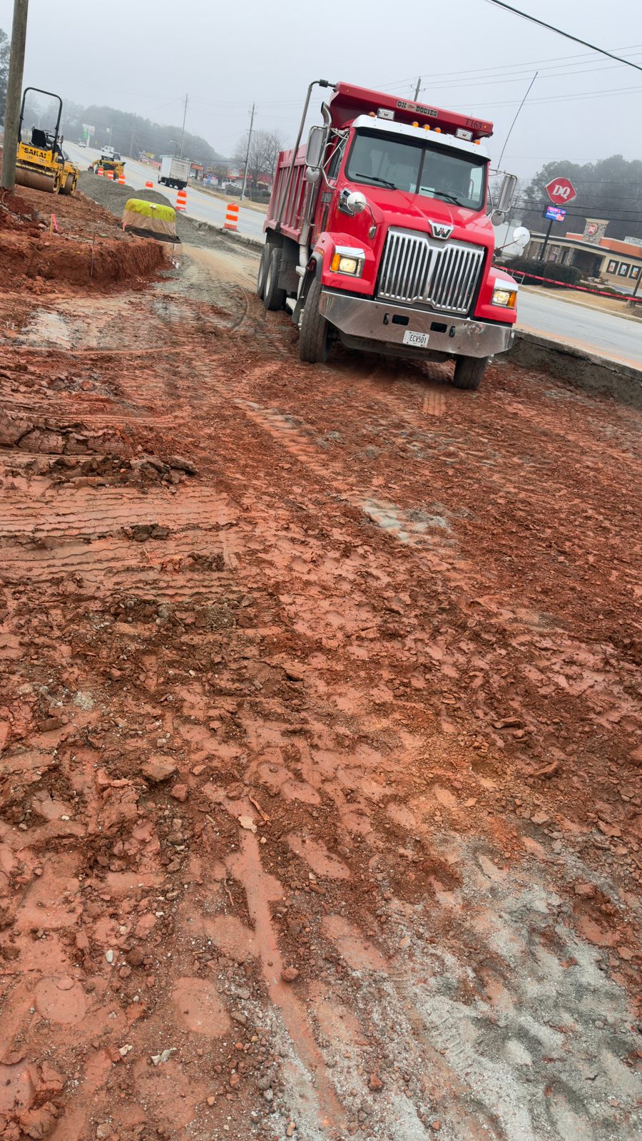 Upon completion of compaction, proof-rolling was performed using a loaded dump truck. The truck was driven slowly across the compacted surface to identify any yielding, pumping, rutting, or deflection. Subgrade soils displayed no significant displacement, deflection, or soft area during the proof-roll operation. The decel lane subgrade is suitable for base course placement.