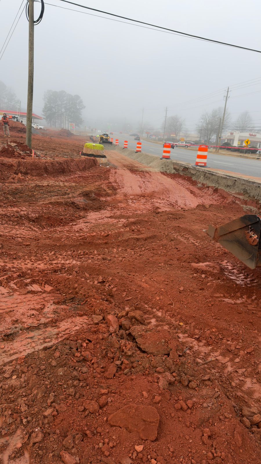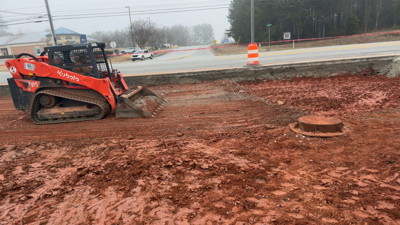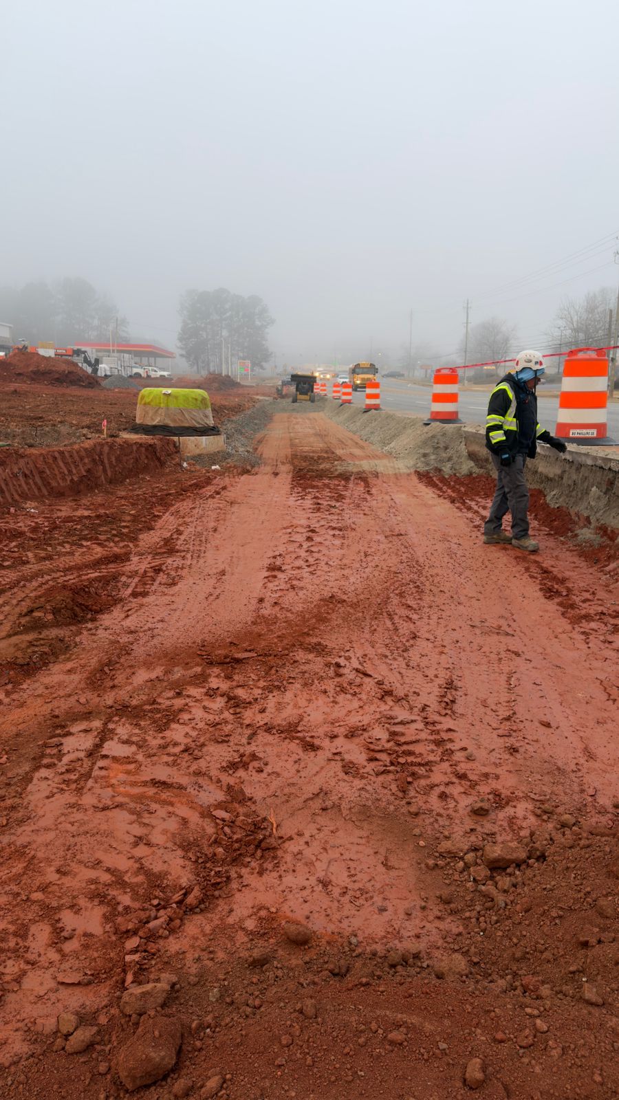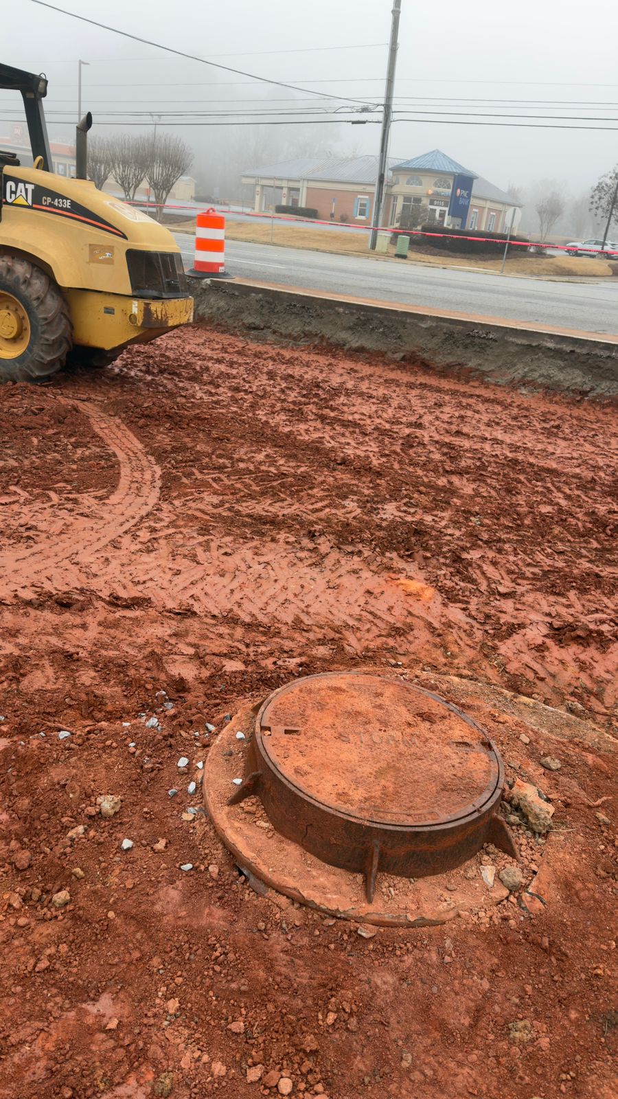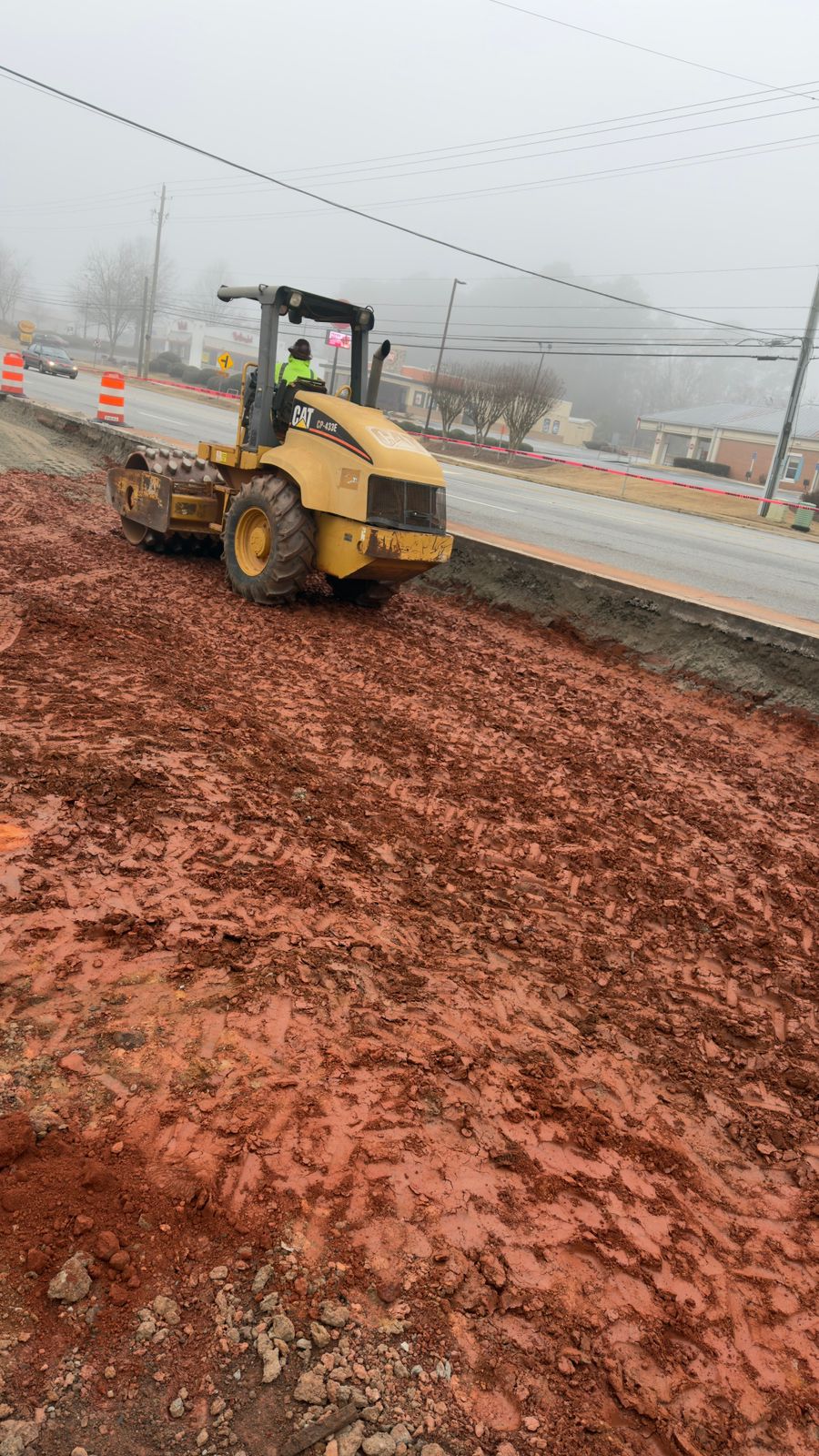 Backfilling was performed and observed for the decel lane leading into the Dunkin’ Donuts complex. A utility pipe had been previously installed beneath this section. Gravel was placed and consolidated around the pipe to provide bedding and lateral support prior to backfill operations using structural fill.