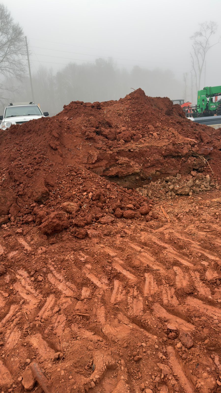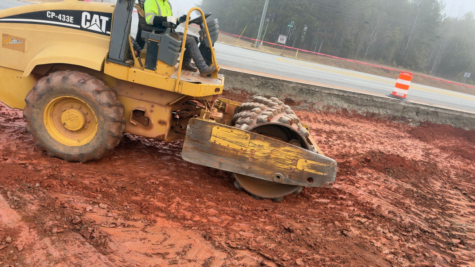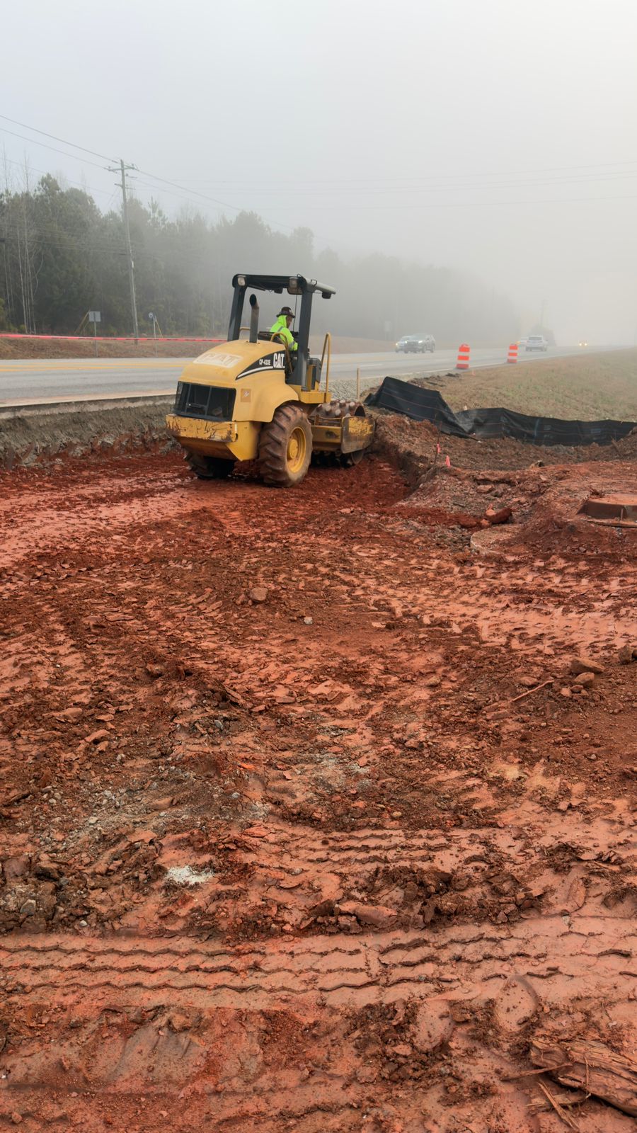 Following pipe installation, structural fill material was placed in lifts to an approximate total height of 5 feet. The fill consisted of on-site soils, which appeared to be a red sandy clay. Moisture contents were slightly above optimum due to weather conditions but remained within workable range. Compaction was performed using a sheep-foot roller.