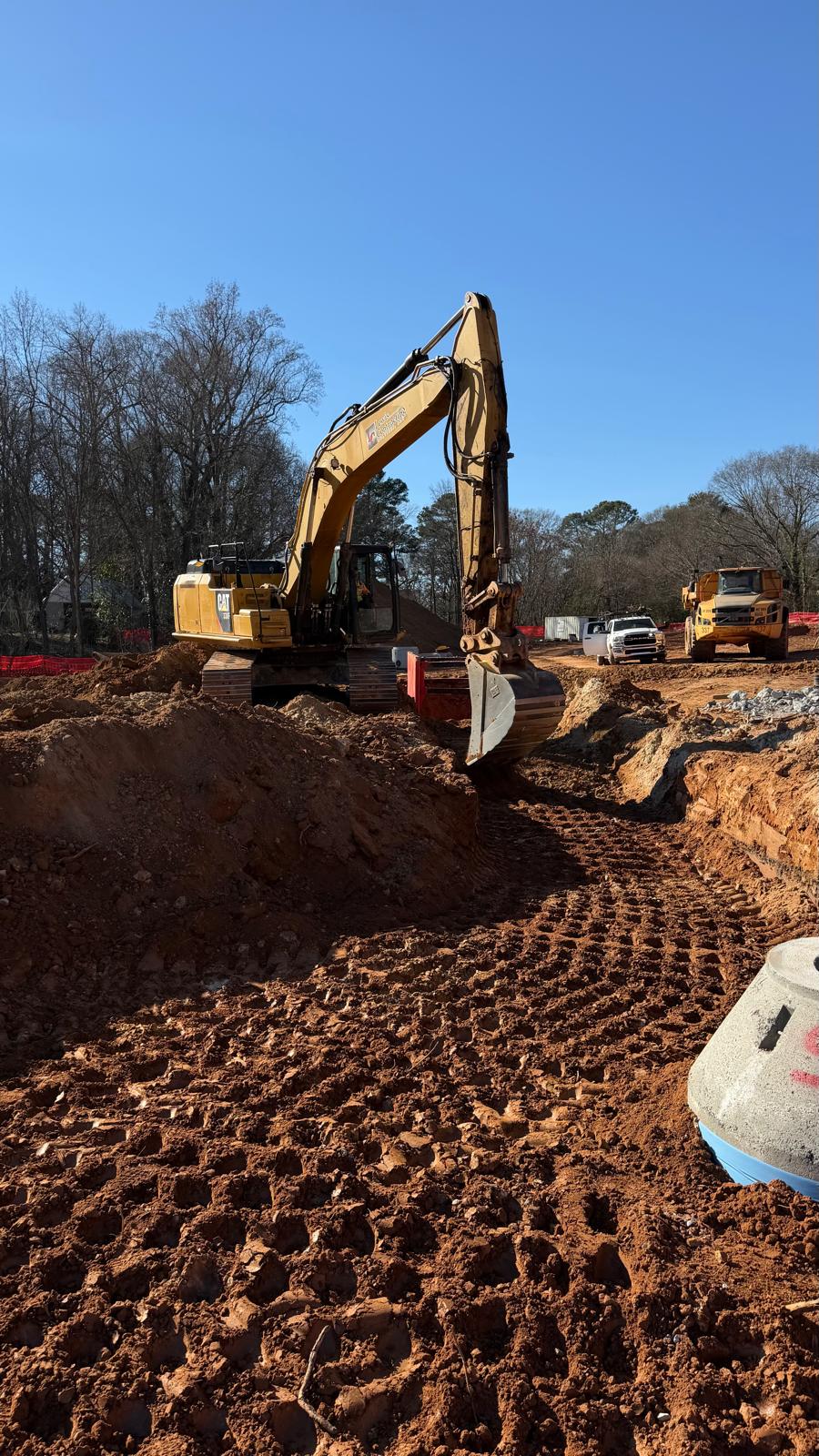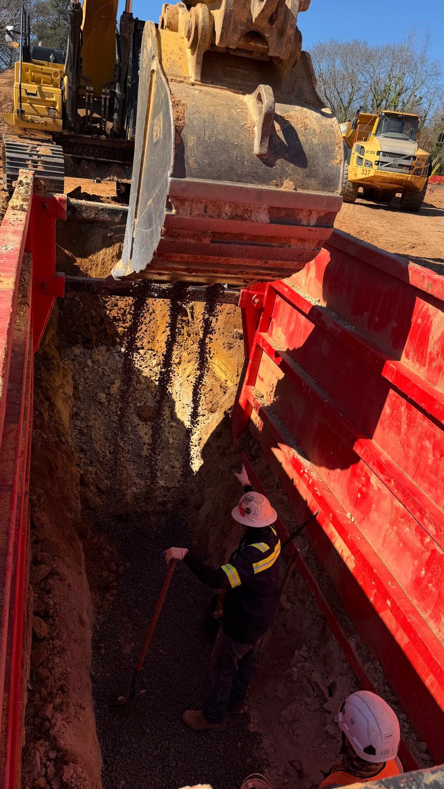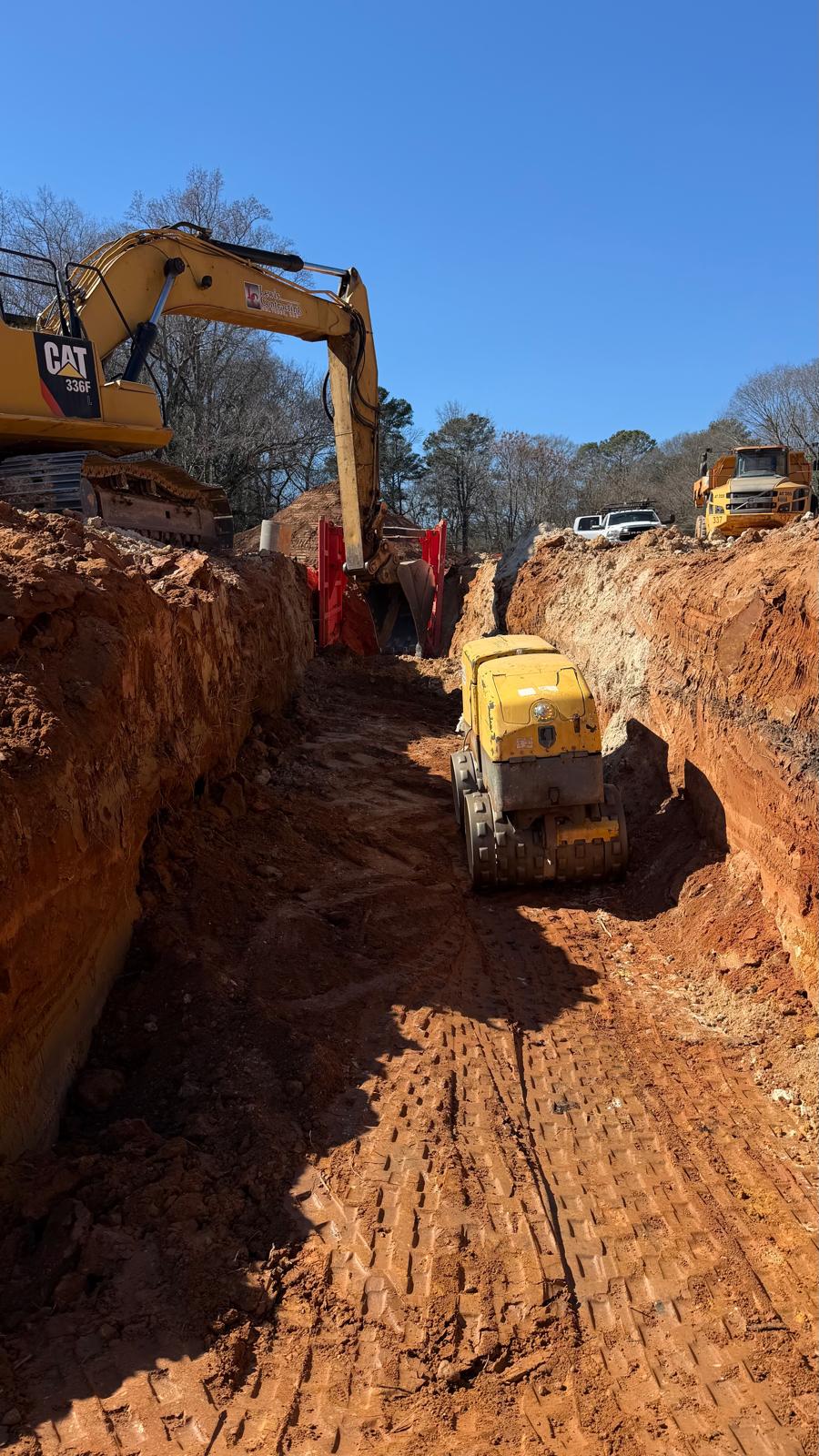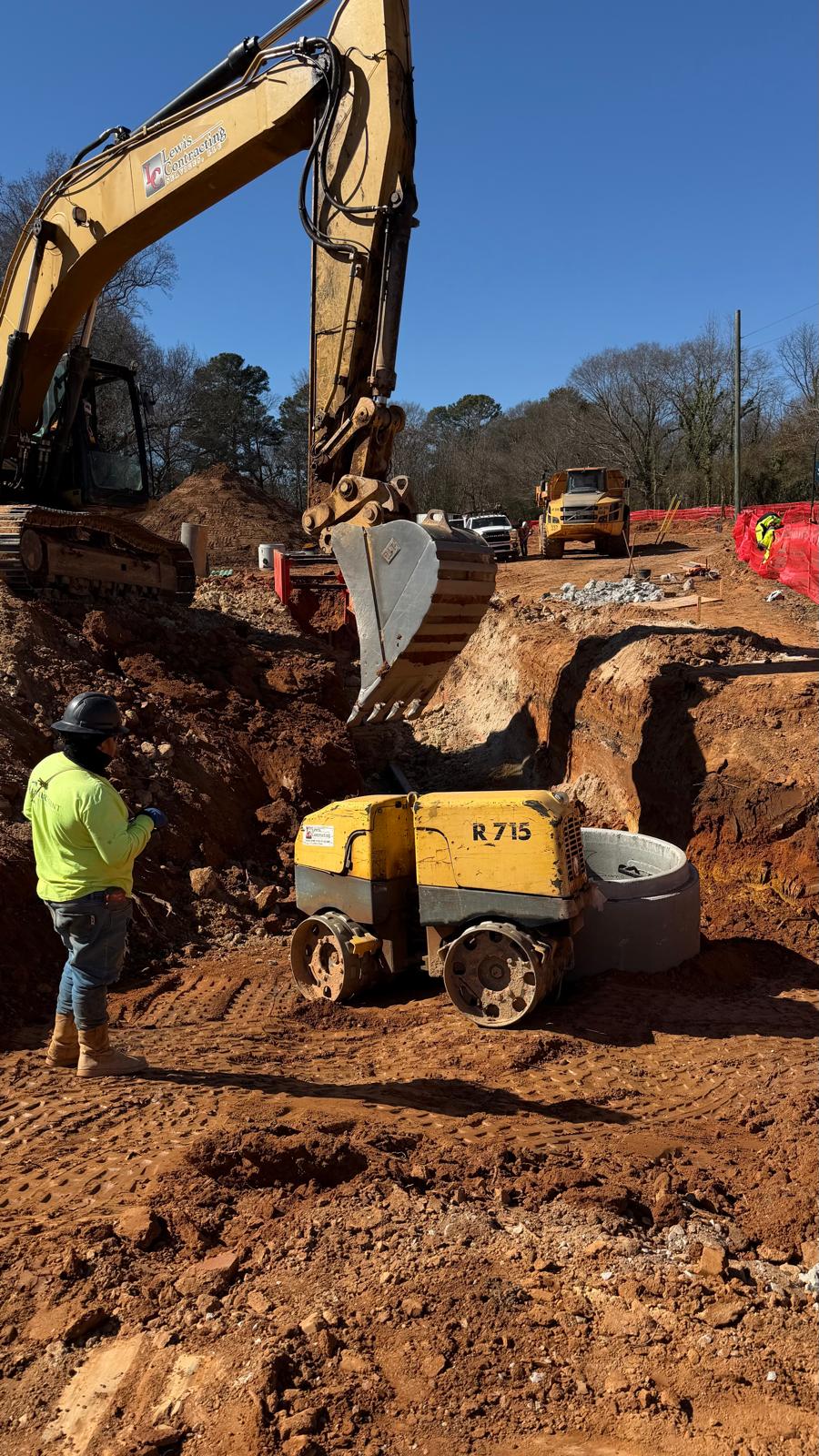 The other crew installed ductile iron pipe (DIP) from point S1 extending toward S2. Following pipe placement, No. 57 stone was placed around the pipe. Additional soil material was then placed in lifts of approximately 6 to 8 inches. Compaction was begun using both a sheep-foot roller and a double-drum roller.
