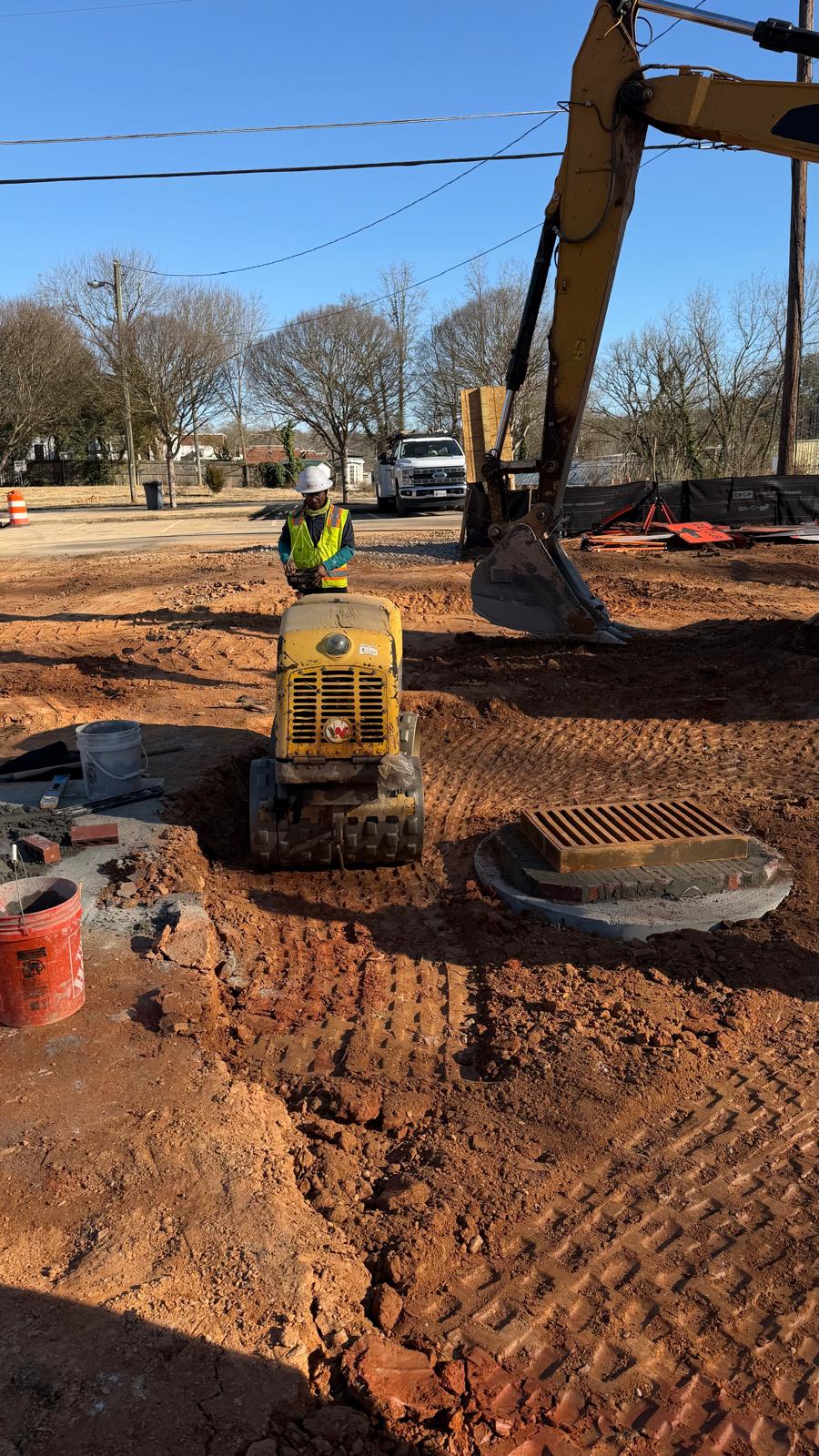The crew resumed work between points D1 and D2 by installing the manhole lid and adjusting it to the required finished elevation. The lid and frame were set and sealed with mortar. After the structure was completed, backfill operations were begun using soil material placed in lifts of approximately 6 to 8 inches. Each lift was compacted using a double-drum roller.