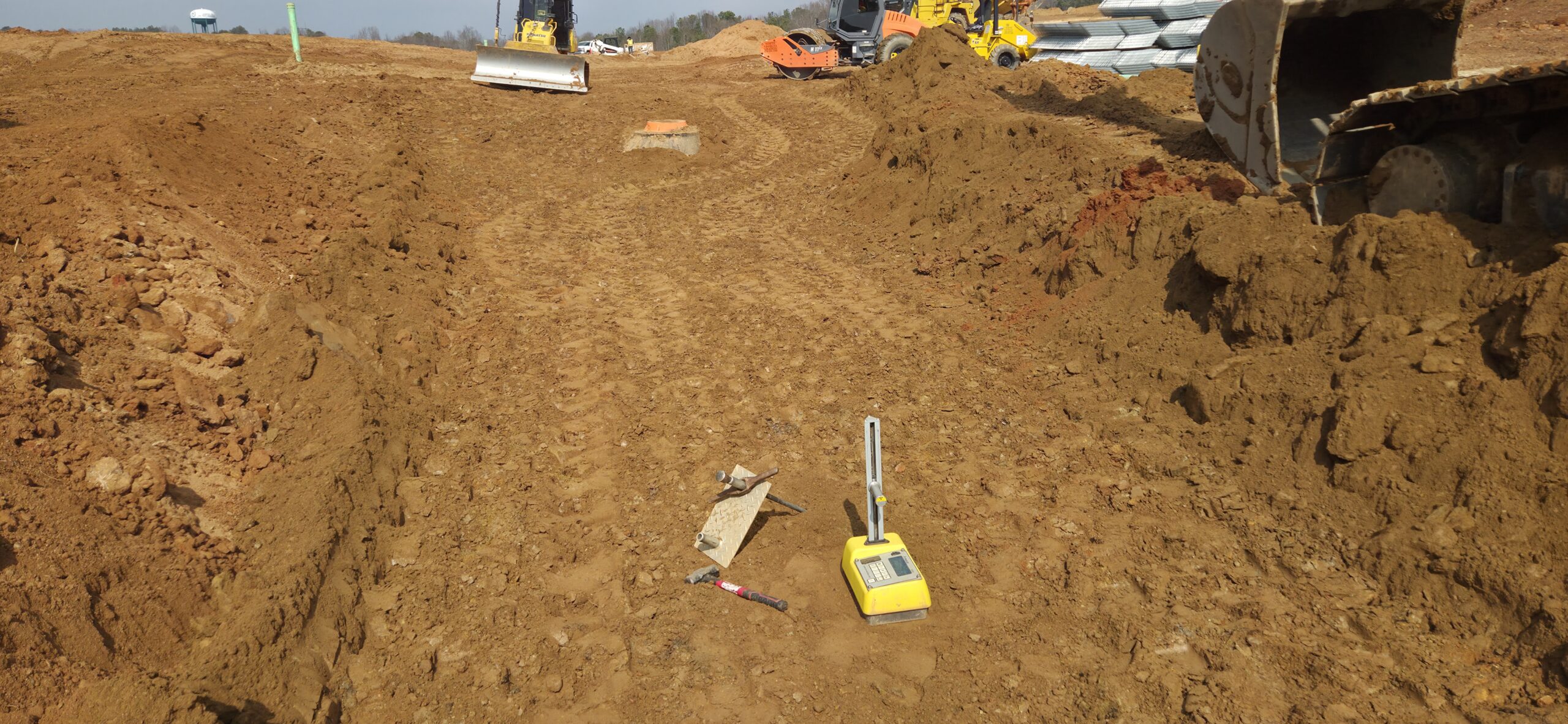 After the pumping was shown to the contractor, they began to remove more of the previously placed lifts and brought in new material. The wall crew spread the soil lift in approximate 8 to 12 inches lifts and compacted with a sheep-foot roller. Density testing was performed and test results failed due to low compaction and high moisture contents. At this point, the wall crew made the decision t0 shut down for the day. As per ASEC’s discussion with Mr. Scott Wood of Pulte, we attempted to do everything we could to try to progress forward with the installation of the wall, but the site conditions did not allow any progress to be made.