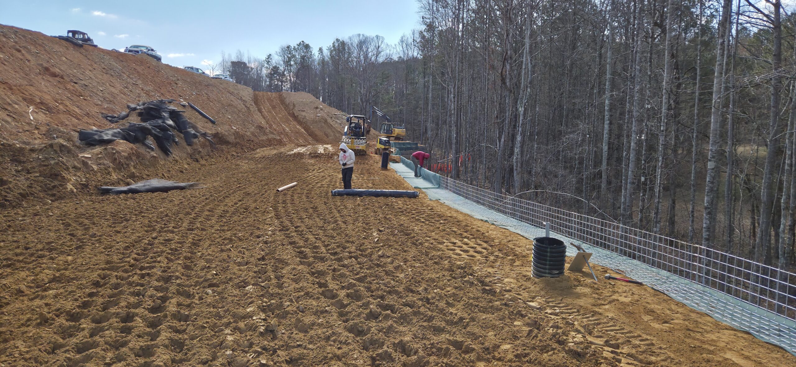 The wall crew continued with the installation of retaining wall #2. Soil lifts were placed in approximately 12-inch lifts and compacted with a combination of a sheep-foot roller and a trench roller. Density testing was performed and test results were provided to the contractor.