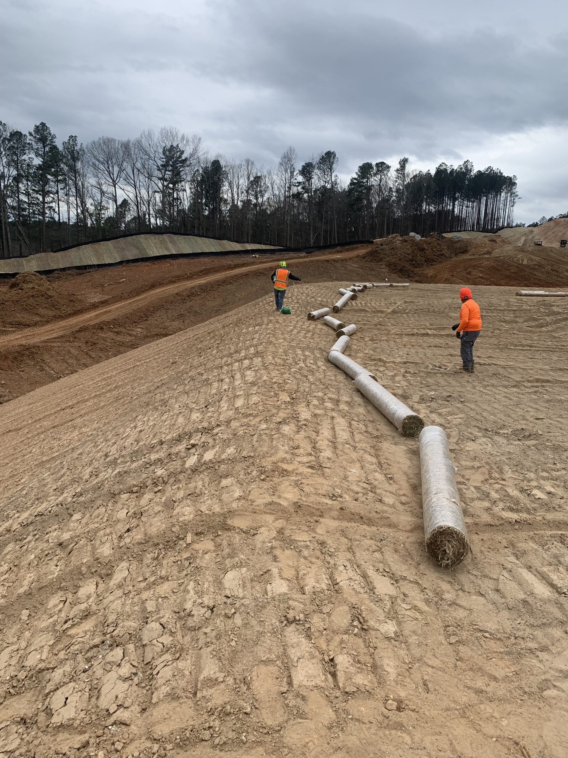 The erosion contractor (Valor) was on site and continued grass seeding and placing mat blankets at pond embankment slopes.