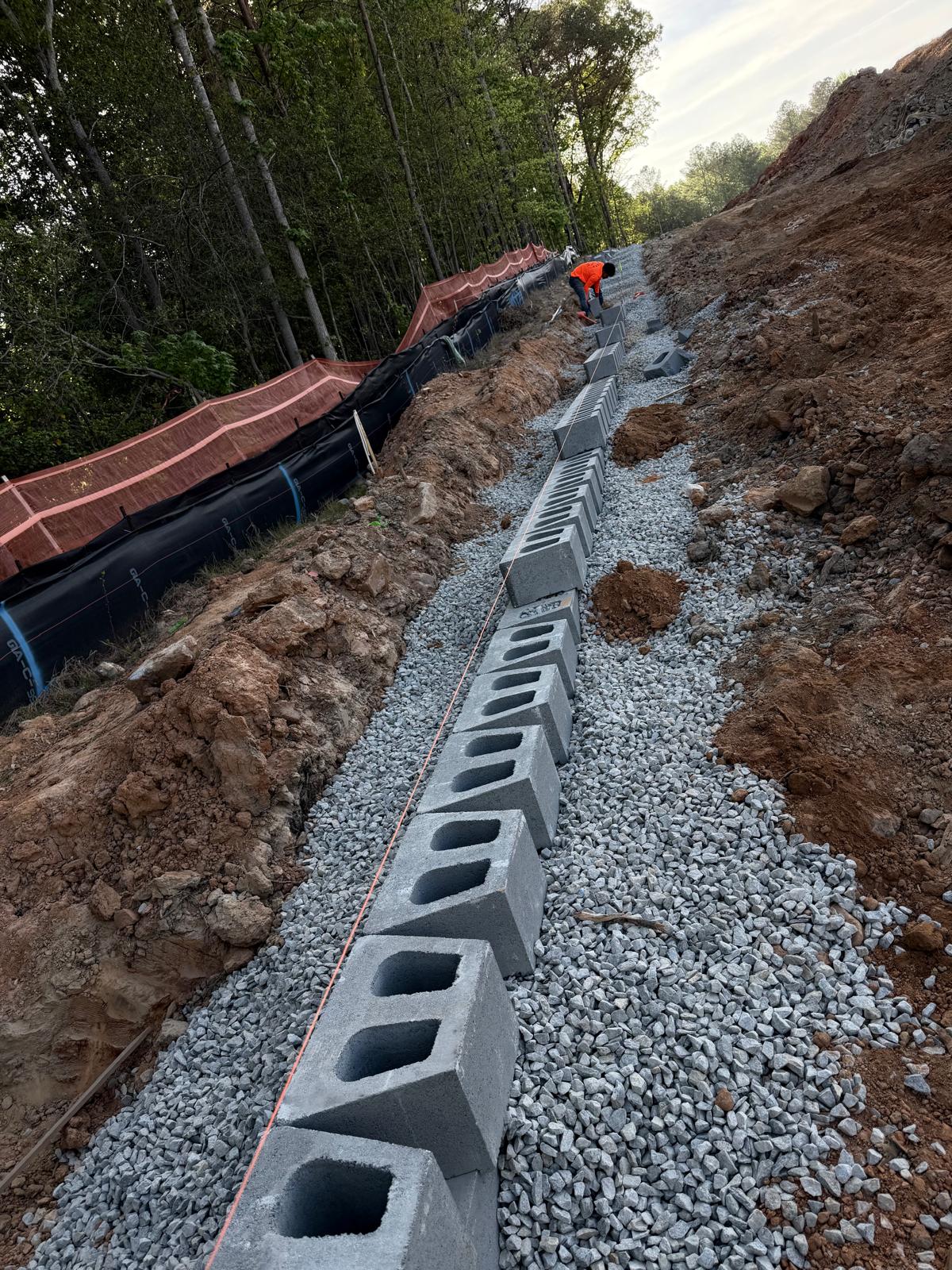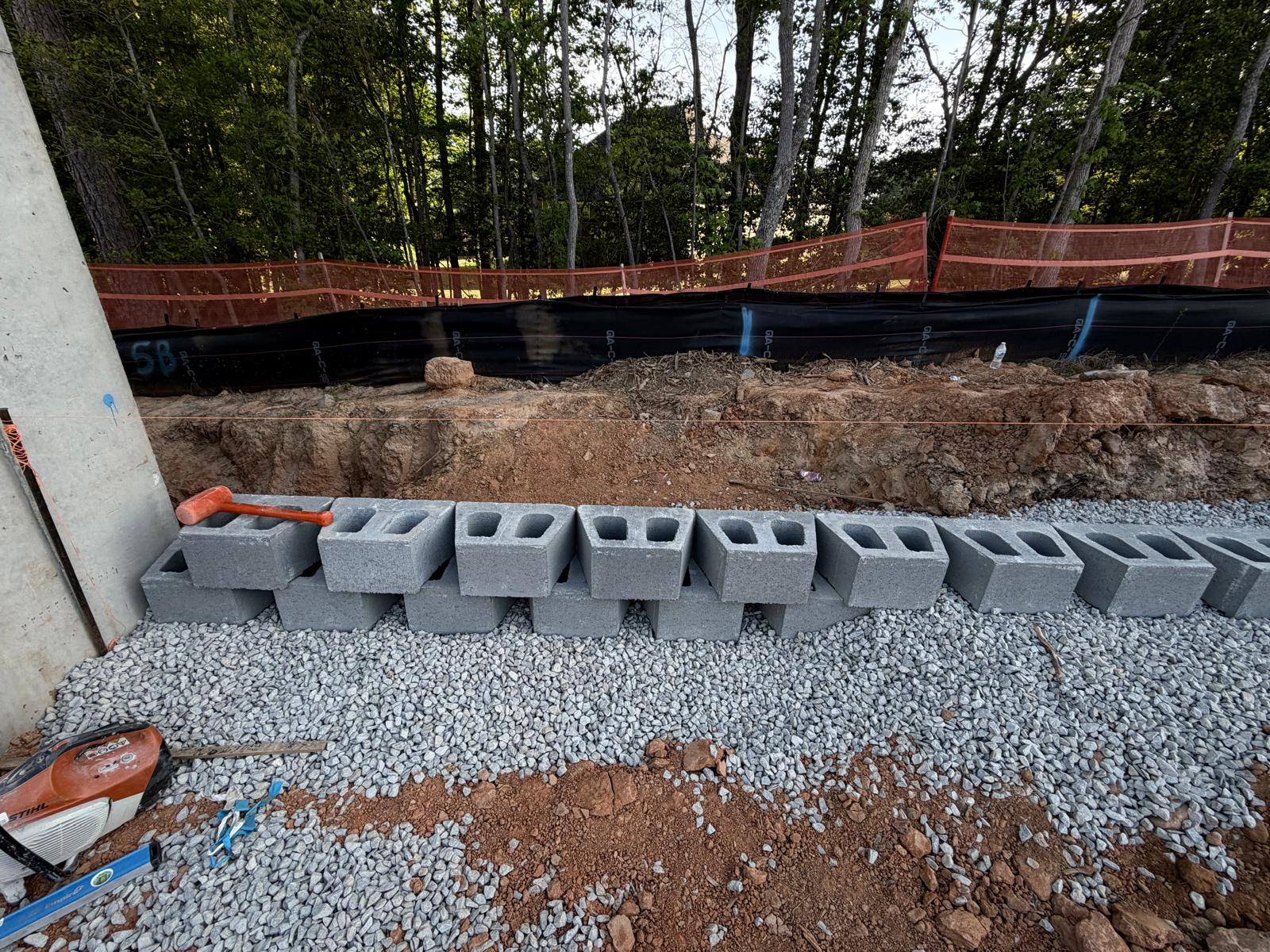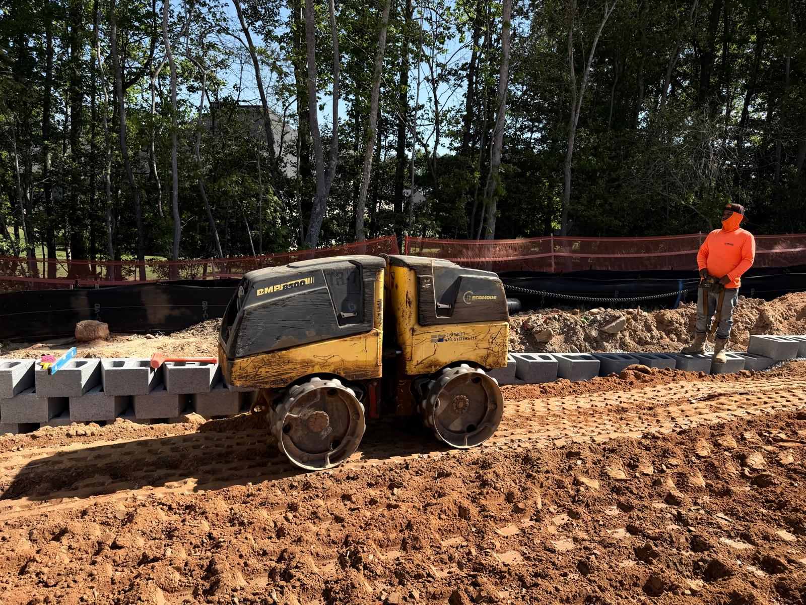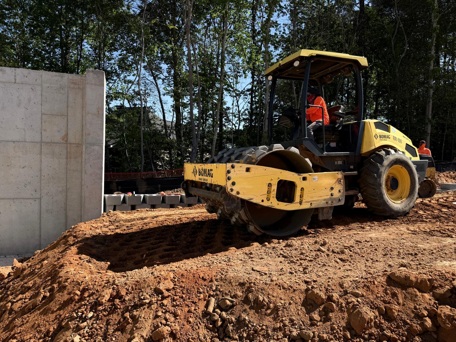 At Retaining Wall 5, the crew continued preparing the foundation by leveling the subgrade to the required elevation and grade. No. 57 stone was then placed. The crew proceeded with the installation of CMU blocks. Additionally, fill material was placed in lifts of 6 to 8 inches and compacted using a double drum roller and sheep-foot roller, and the compaction met the required job specifications.