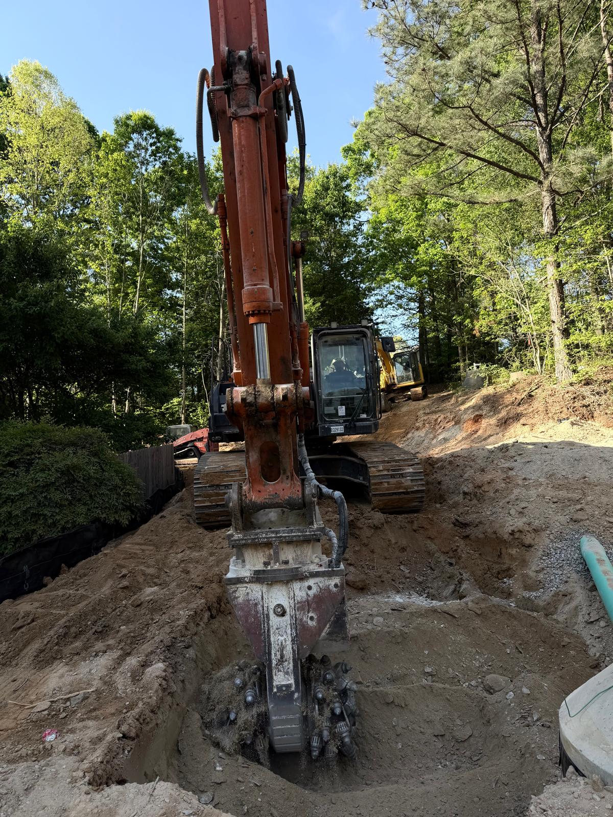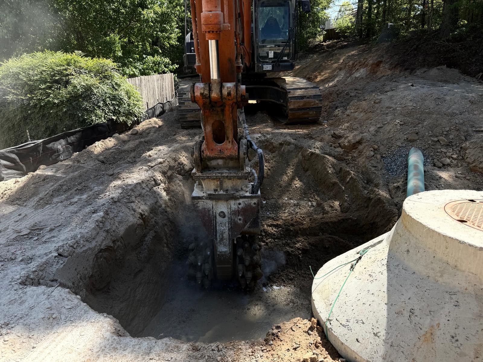 At the Buford neighborhood site, the crew continued trench excavation using a hydraulic excavator equipped with a rock grinder.