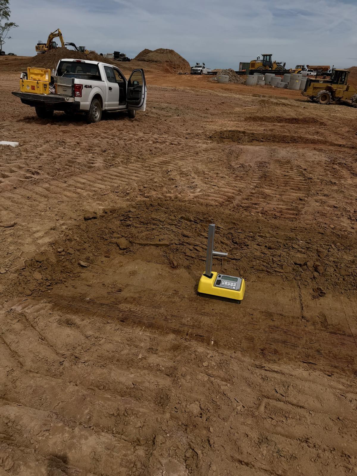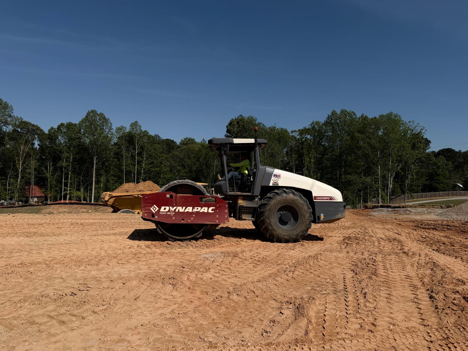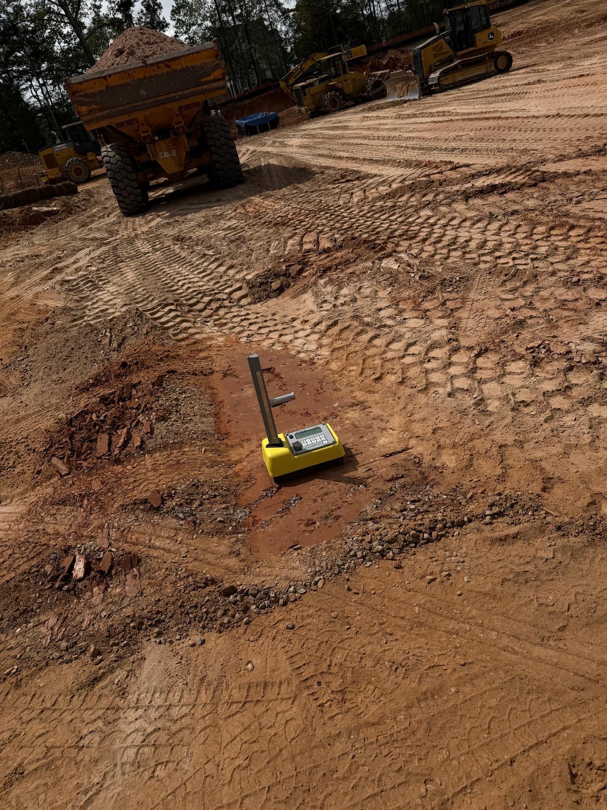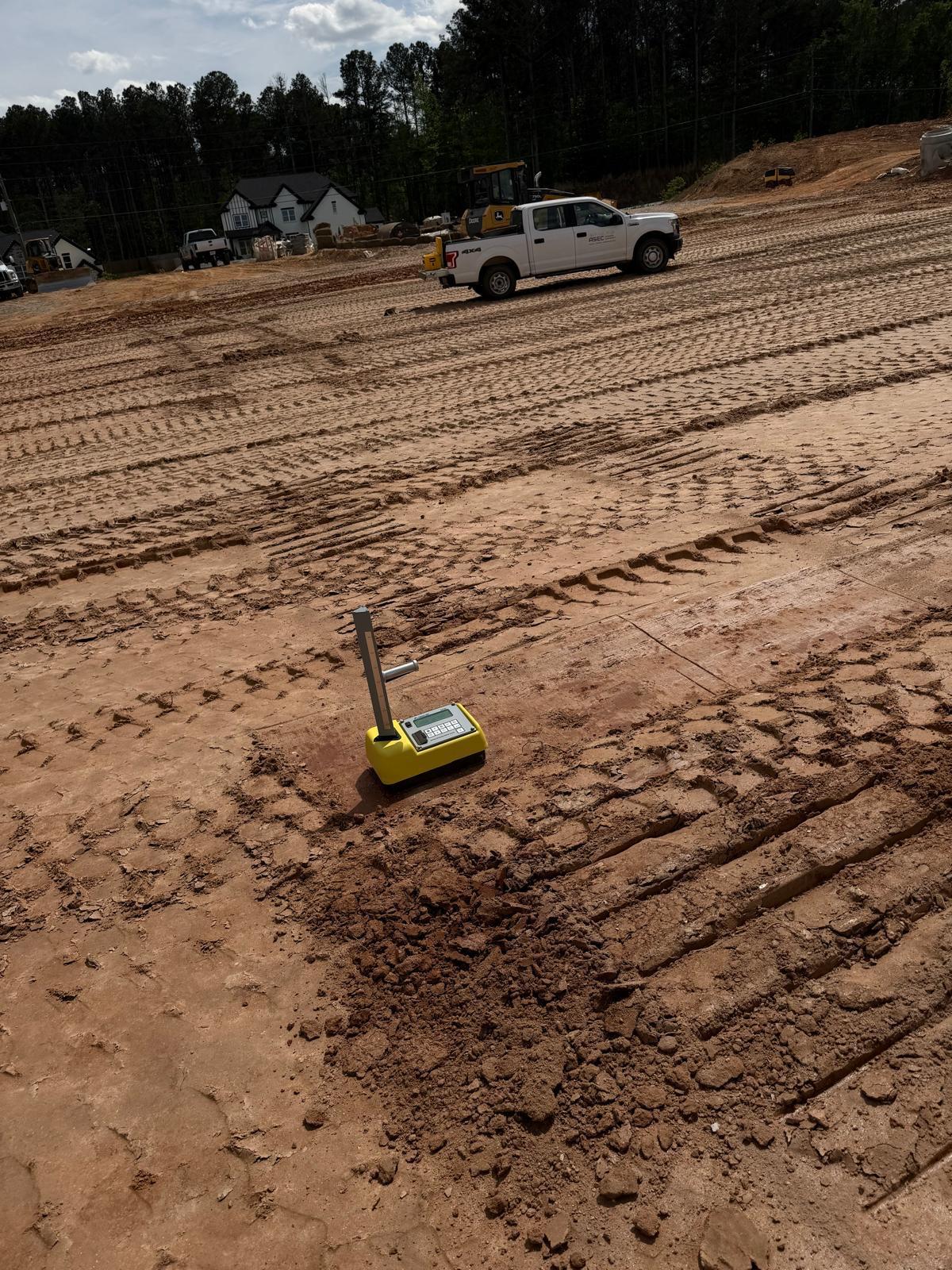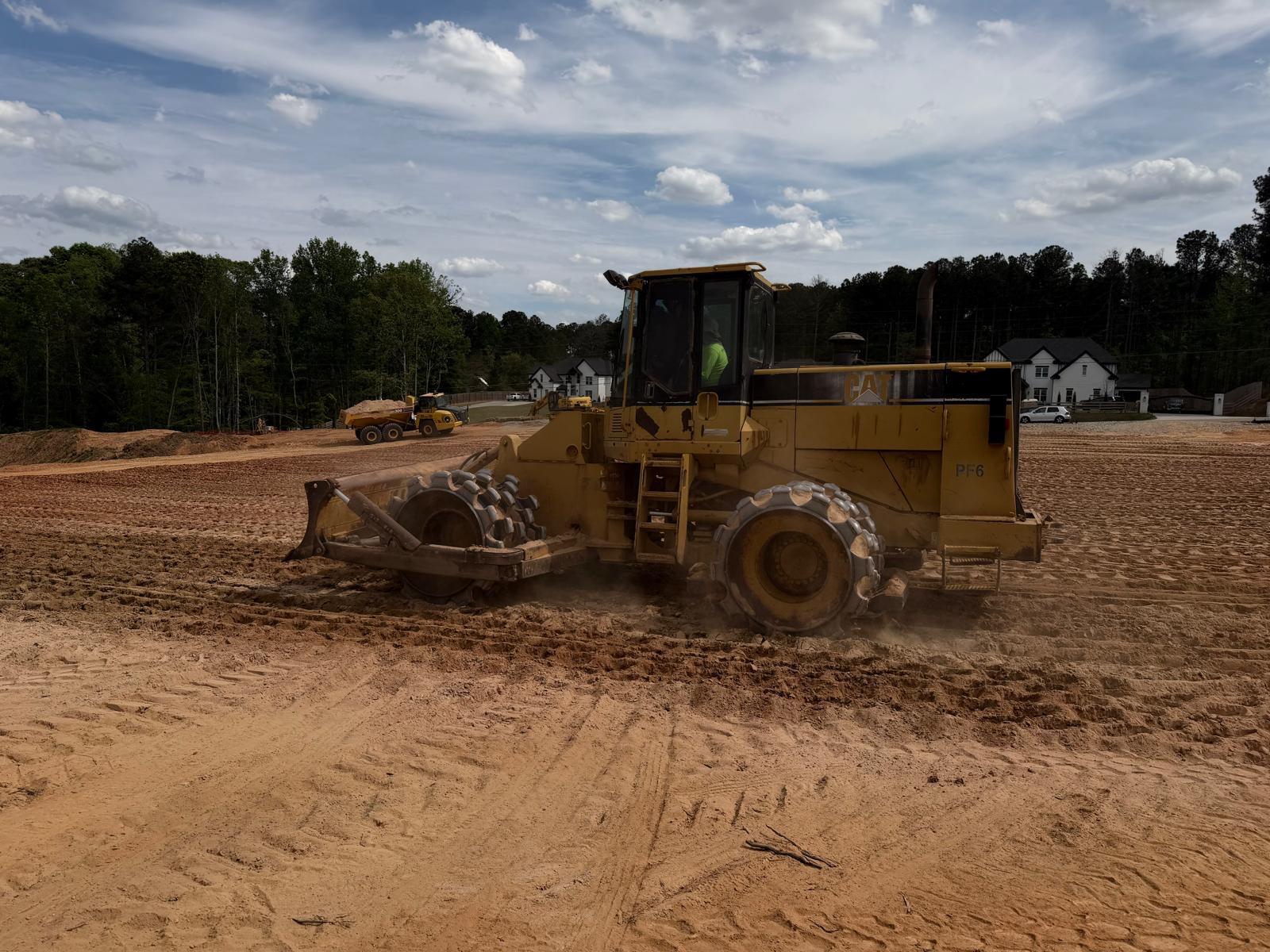 Crew continued working on Lots #62, 63, 64, and the adjacent roadway area. Fill material was placed in lifts, spread using a crawler bulldozer, and compacted using both a sheep-foot roller and a Caterpillar 815. Density tests were performed with a couple of tests initially failing due to high moisture content in the fill material and placement of thick lifts. Our representative recommended the material be replaced at 6 to 8 inches and aerated prior to re-compaction. After re-compaction, additional density tests were performed, and the results met the required project compaction specifications.