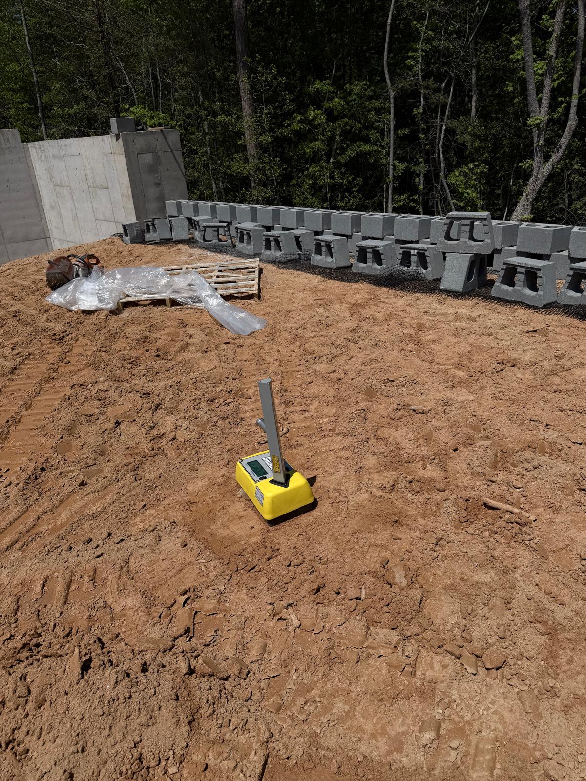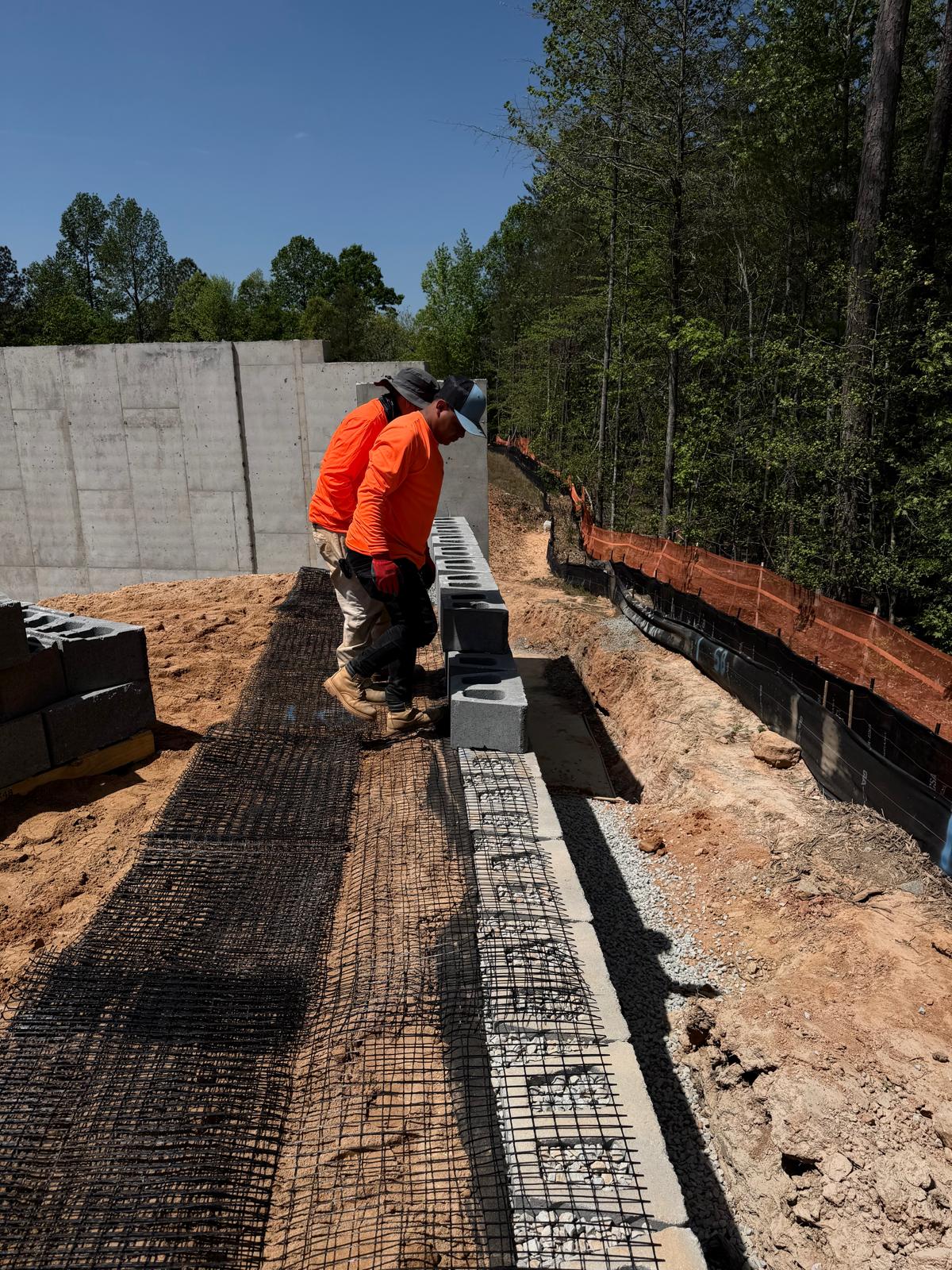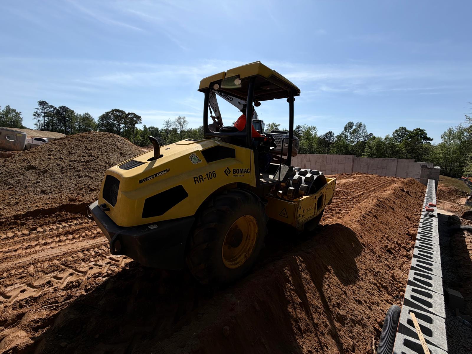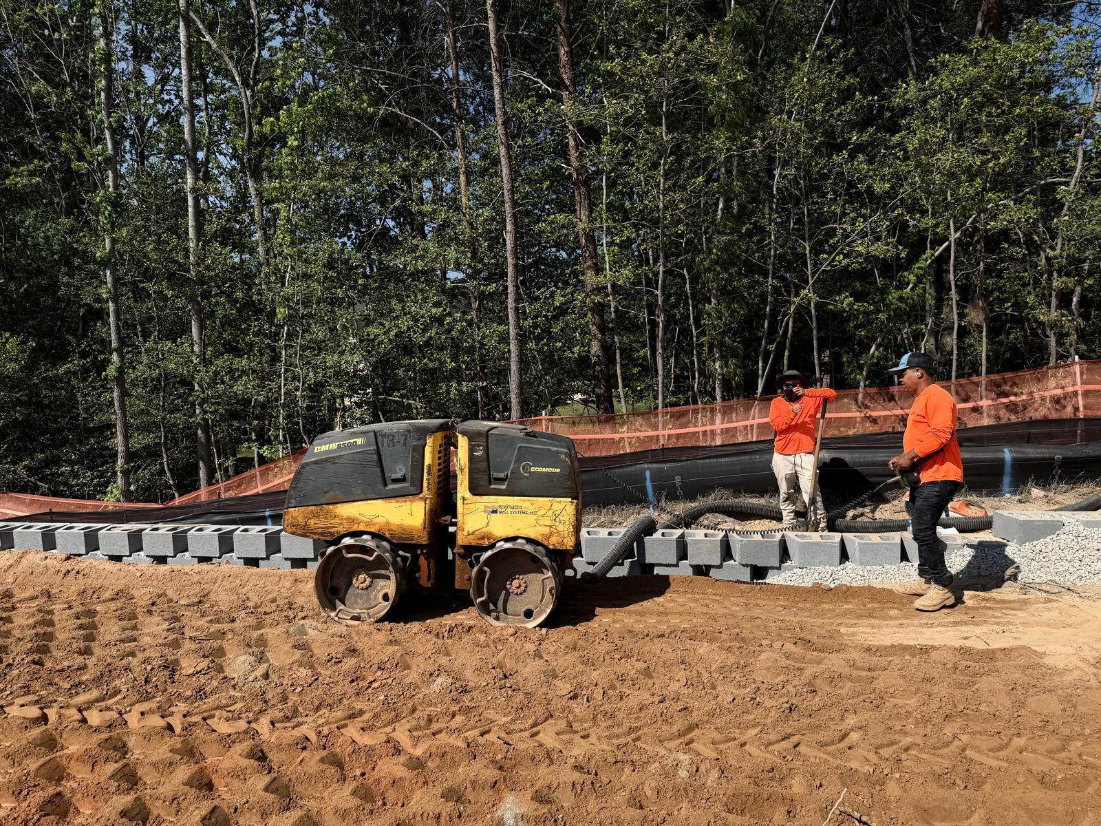 At Retaining Wall 5, the crew continued installation of CMU blocks by leveling the sub-grade and placing No. 57 stone. The blocks appeared to be installed in accordance with the project plans. Fill material was then placed in controlled lifts and compacted using both a double drum roller and a sheep-foot roller.