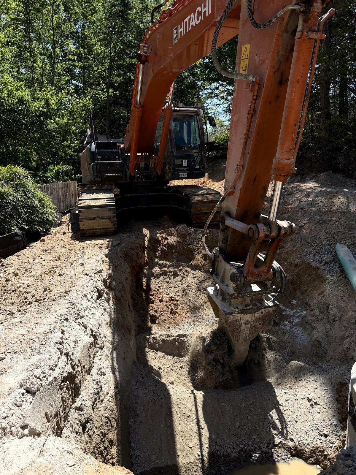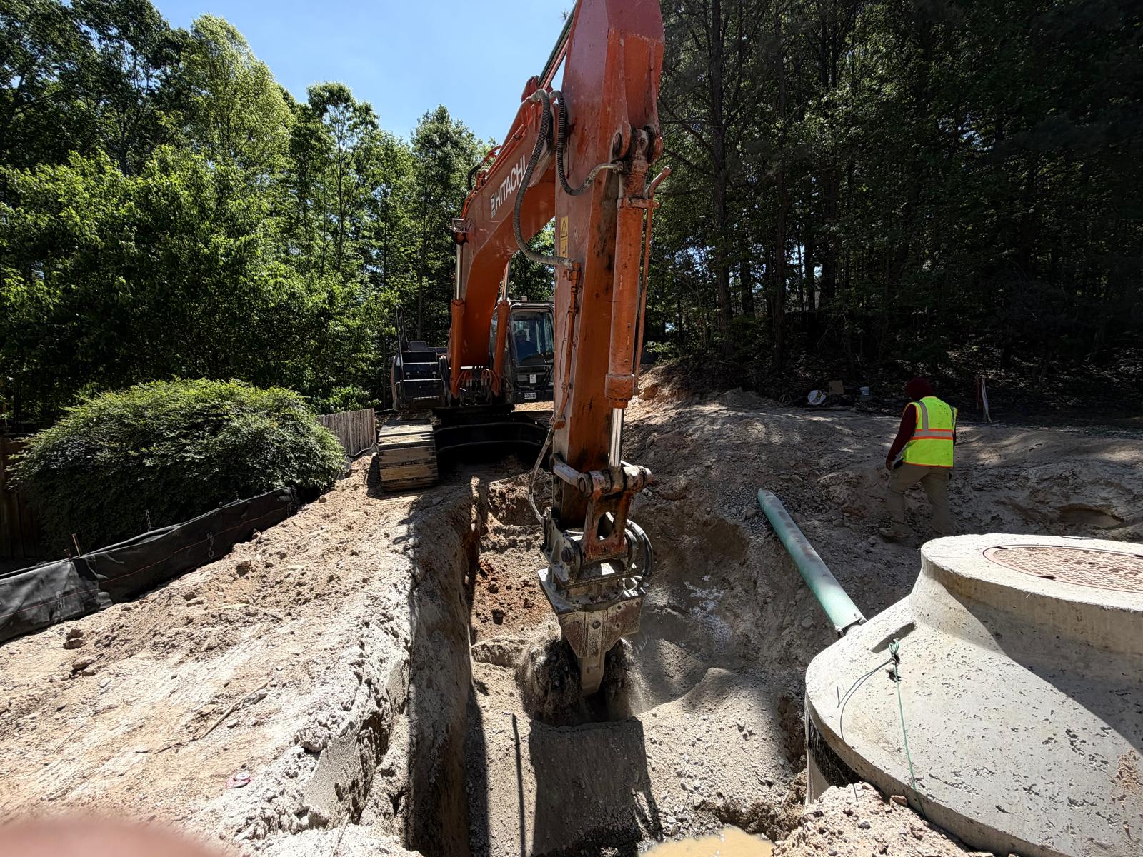 At the Buford neighborhood site, the crew continued trench excavation using a hydraulic excavator equipped with a rock grinder.