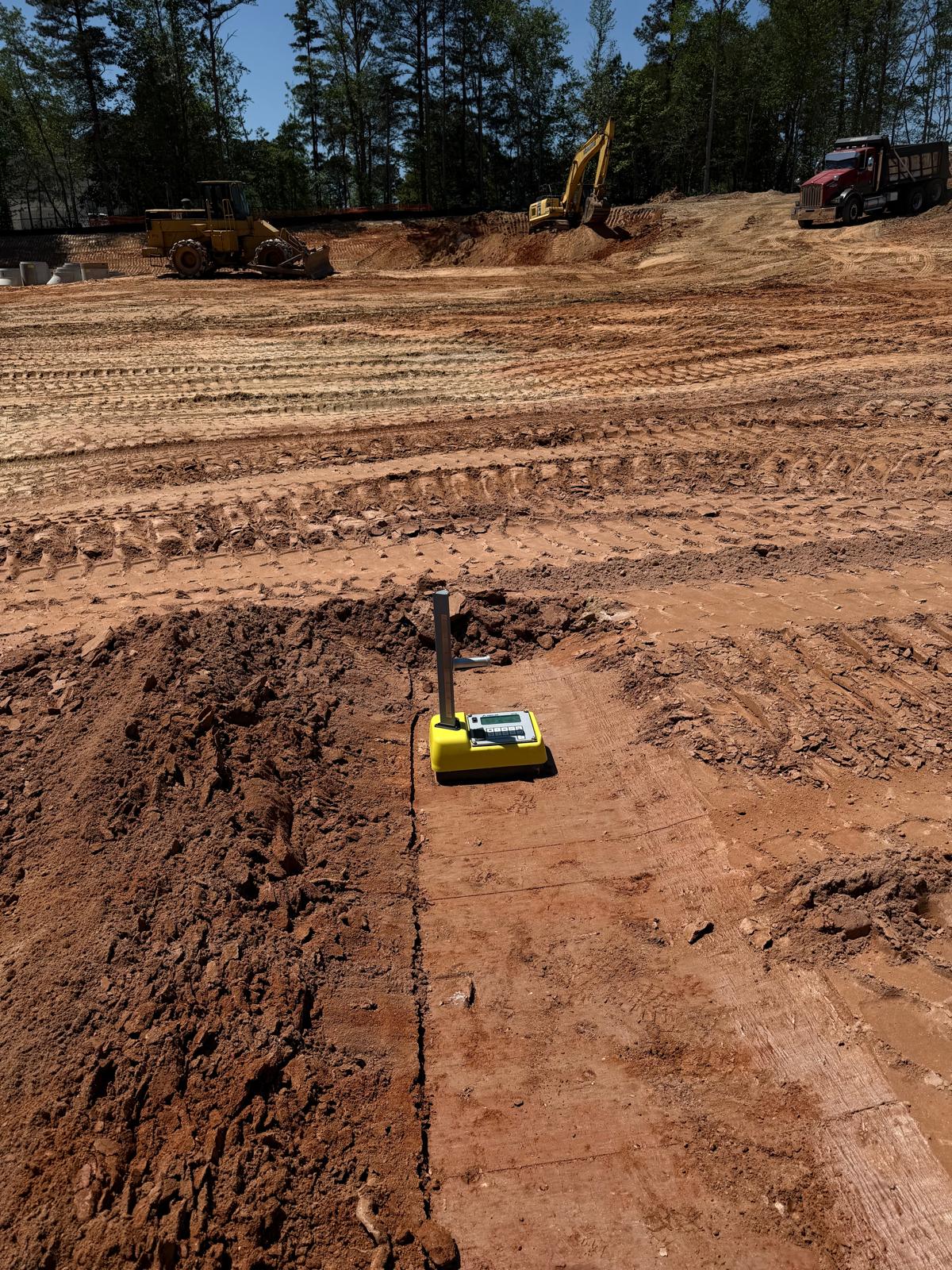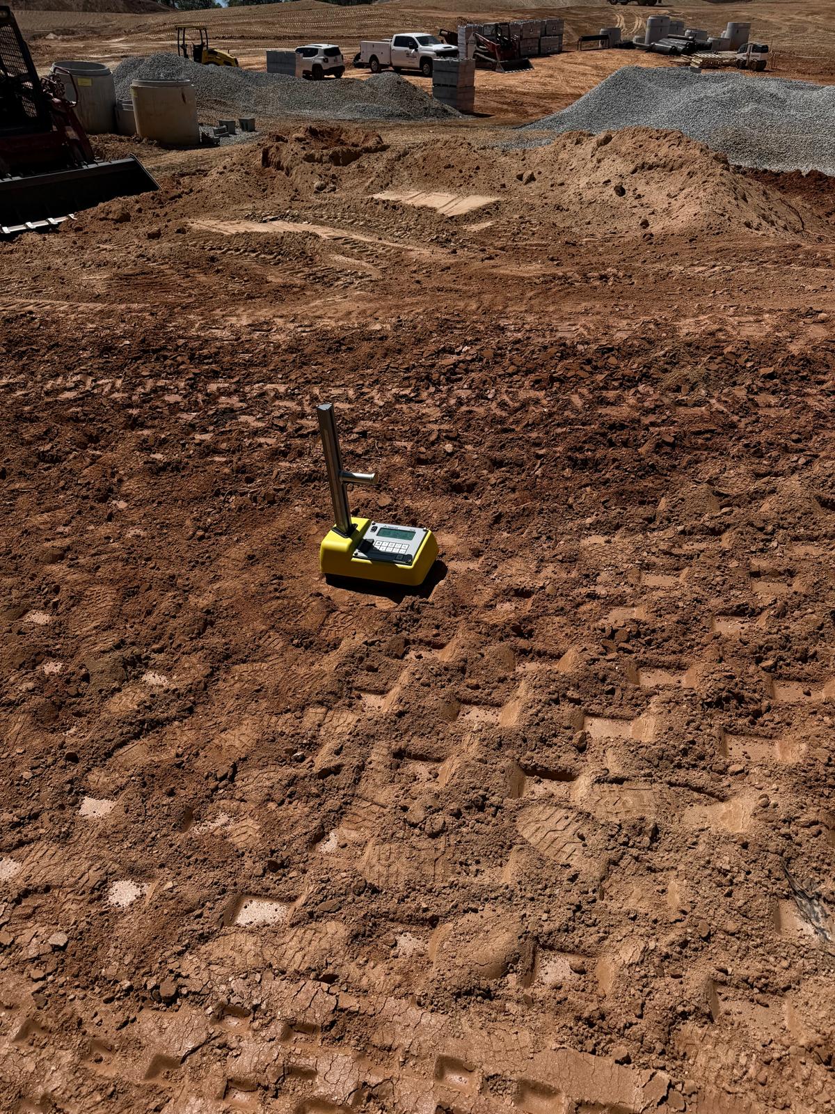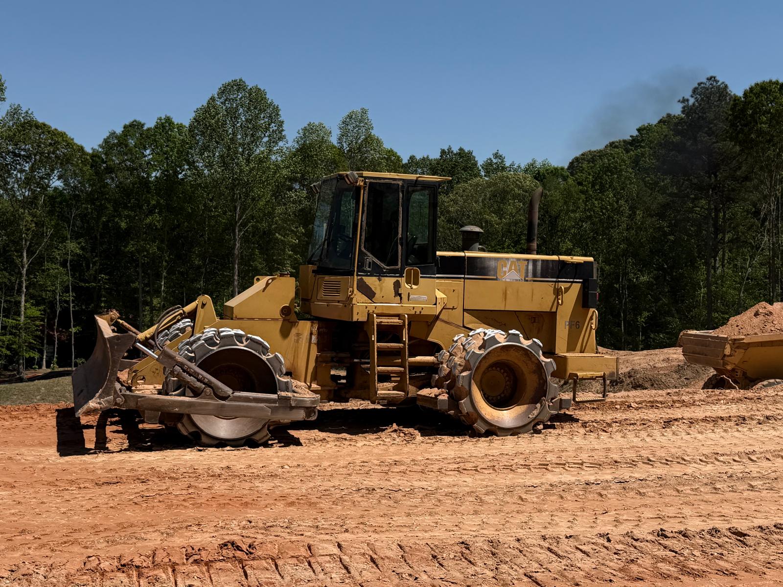 Crew continued working on Lots #62, 63, 64, and the adjacent roadway area. Fill material was placed in lifts, spread using a crawler bulldozer, and compacted using both a sheep-foot roller and a Caterpillar 815. Density tests were performed, and the results met the required project compaction specifications.